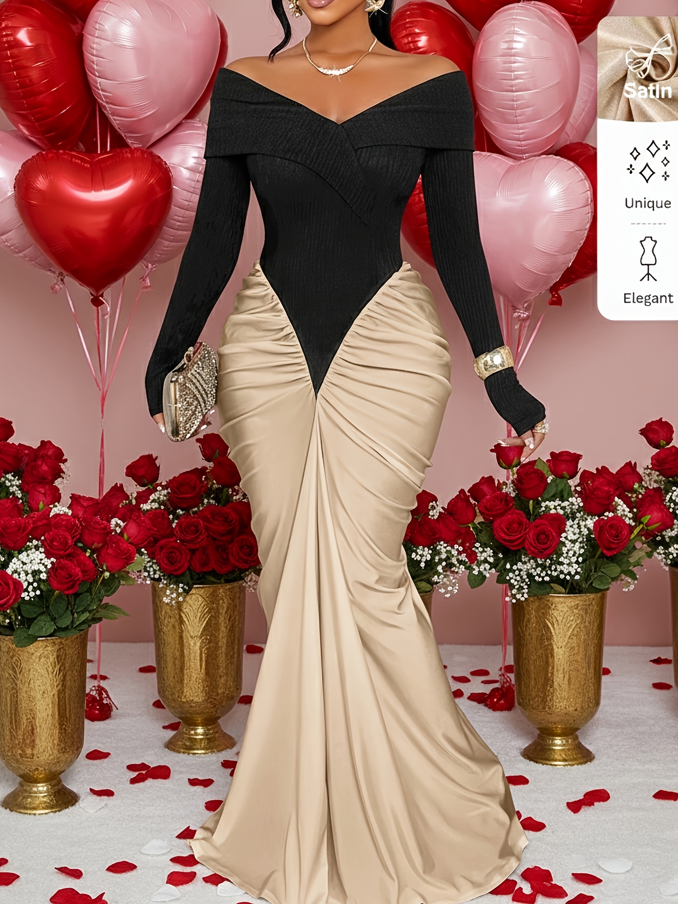 Elegant Women’S Color-Blocked Drop-Shoulder Dress with Long Sleeves, Featuring Pleated Satin And a Mermaid Silhouette, Perfect for Evening Parties And Formal Occasions, Offering a Flattering Fit