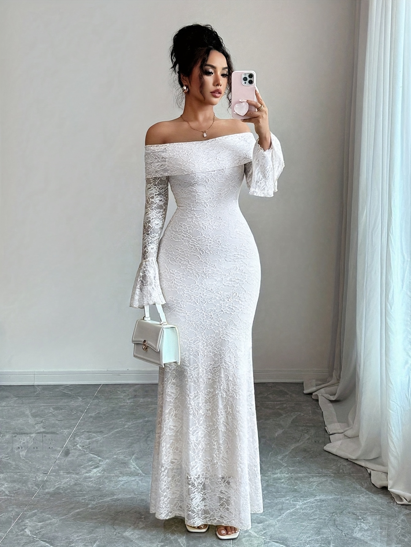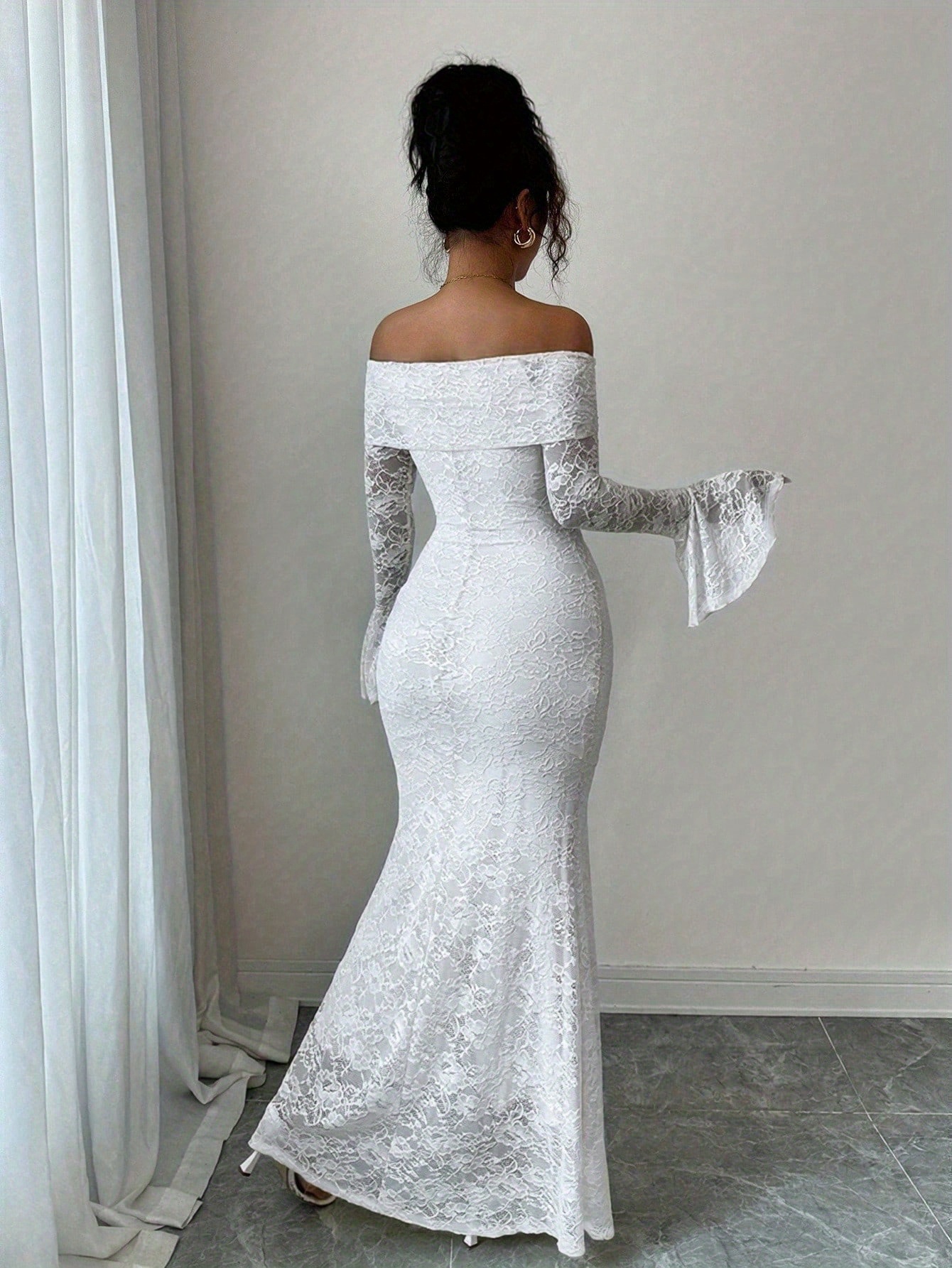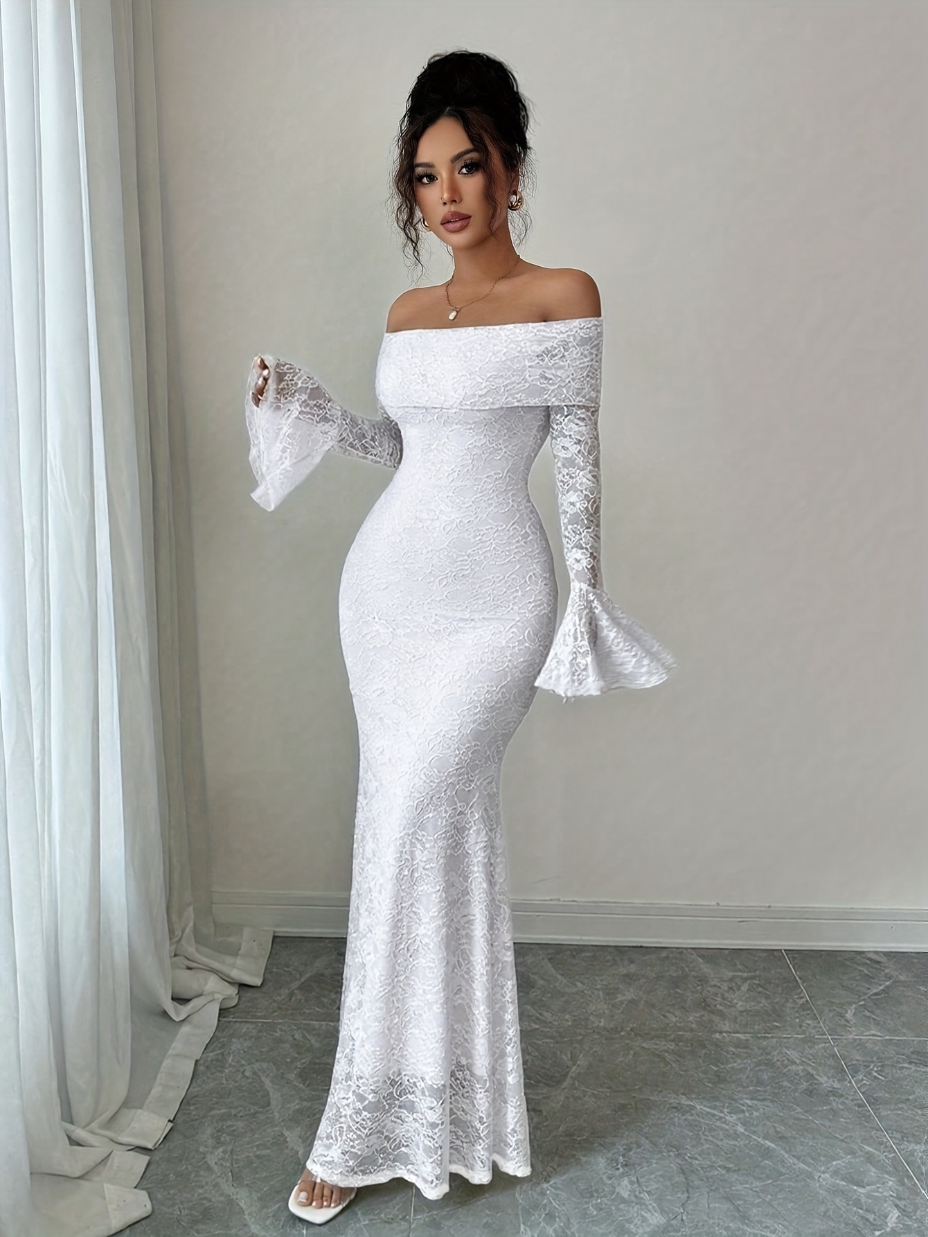 Elegant Women’S White Lace Patchwork Off-The-Shoulder Long-Sleeved Slim Fit Temperament Long Dress Suitable for Versatile Bridesmaid Dress Gown
