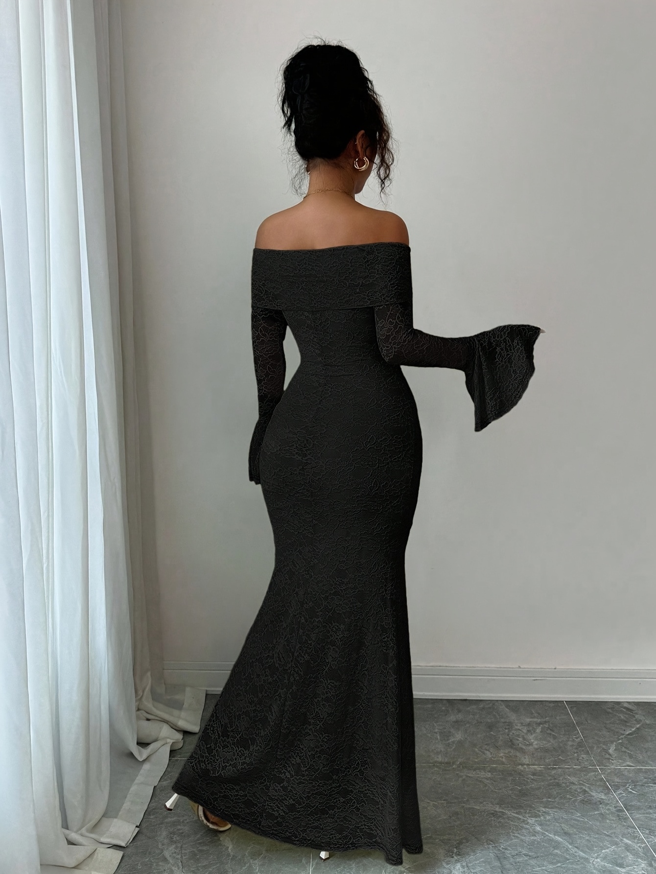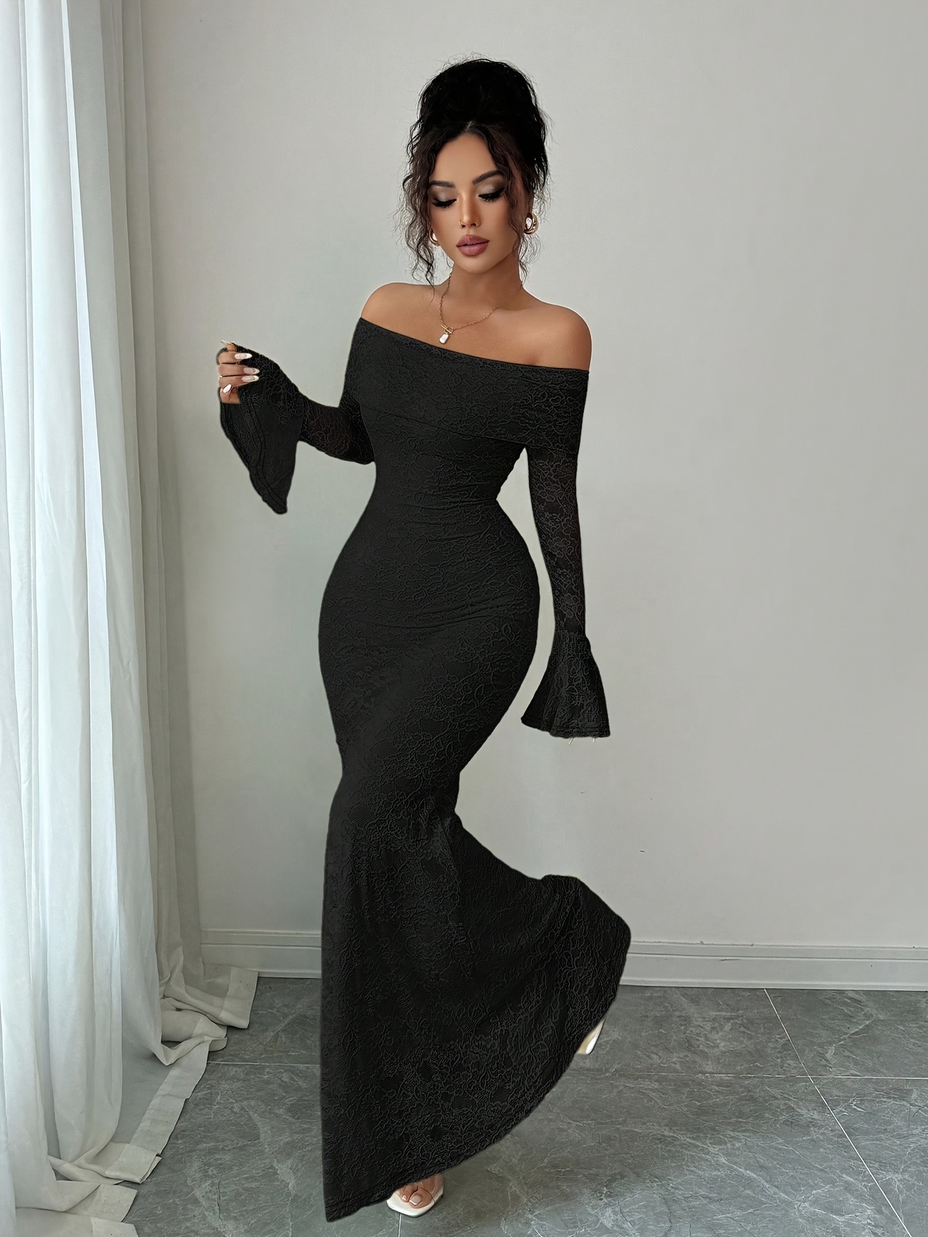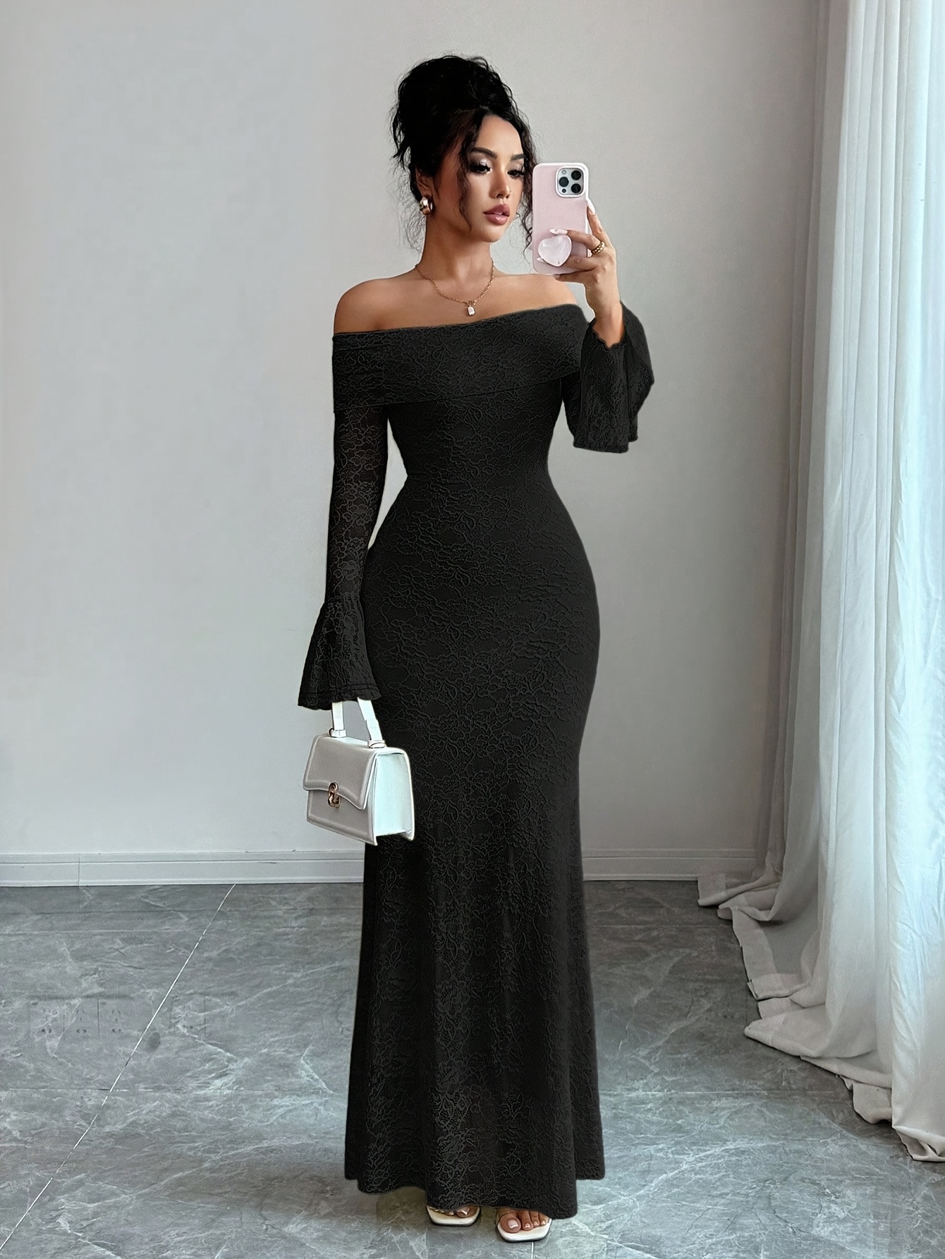 Elegant Women’S White Lace Patchwork Off-The-Shoulder Long-Sleeved Slim Fit Temperament Long Dress Suitable for Versatile Bridesmaid Dress Gown
