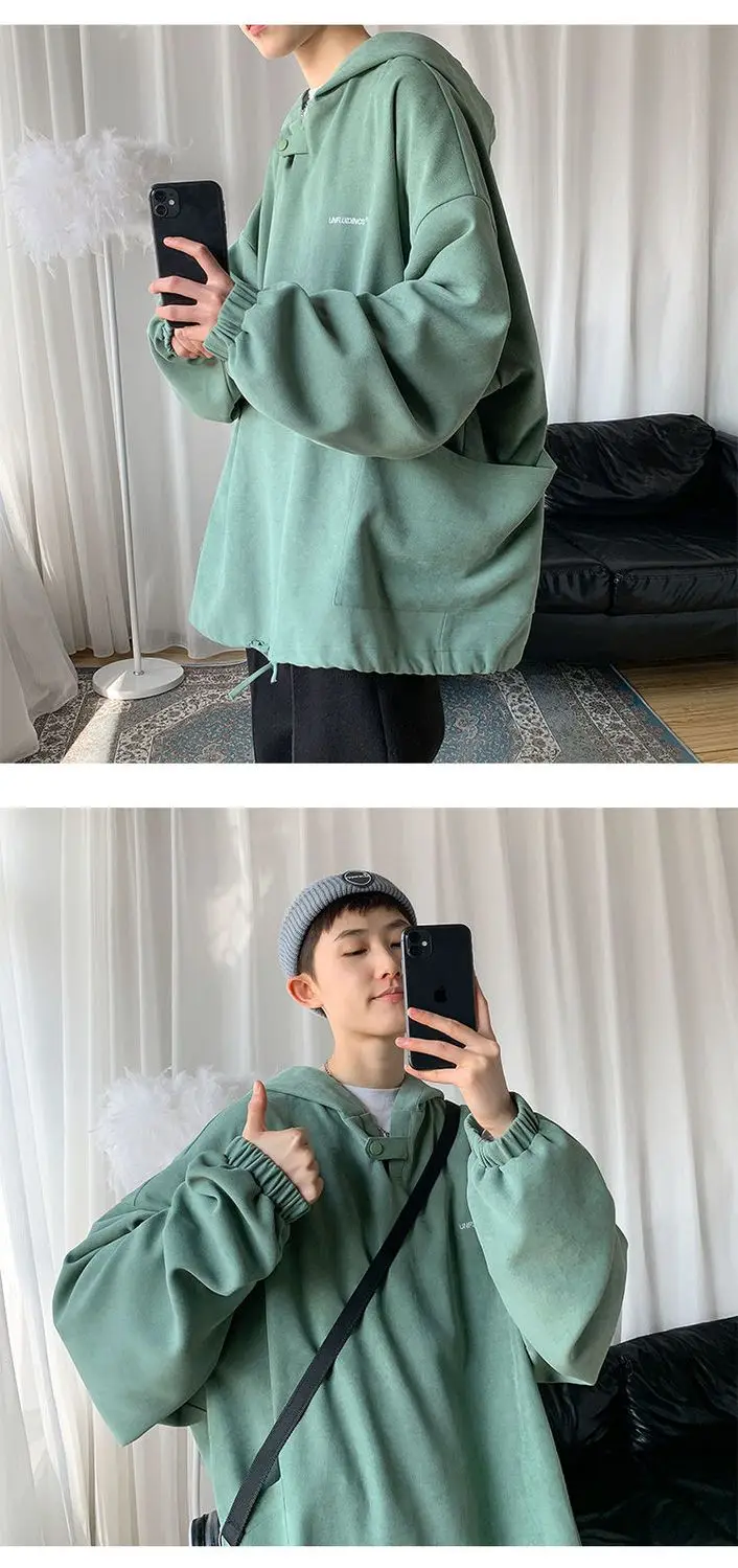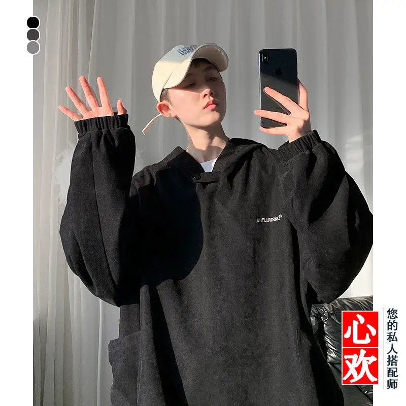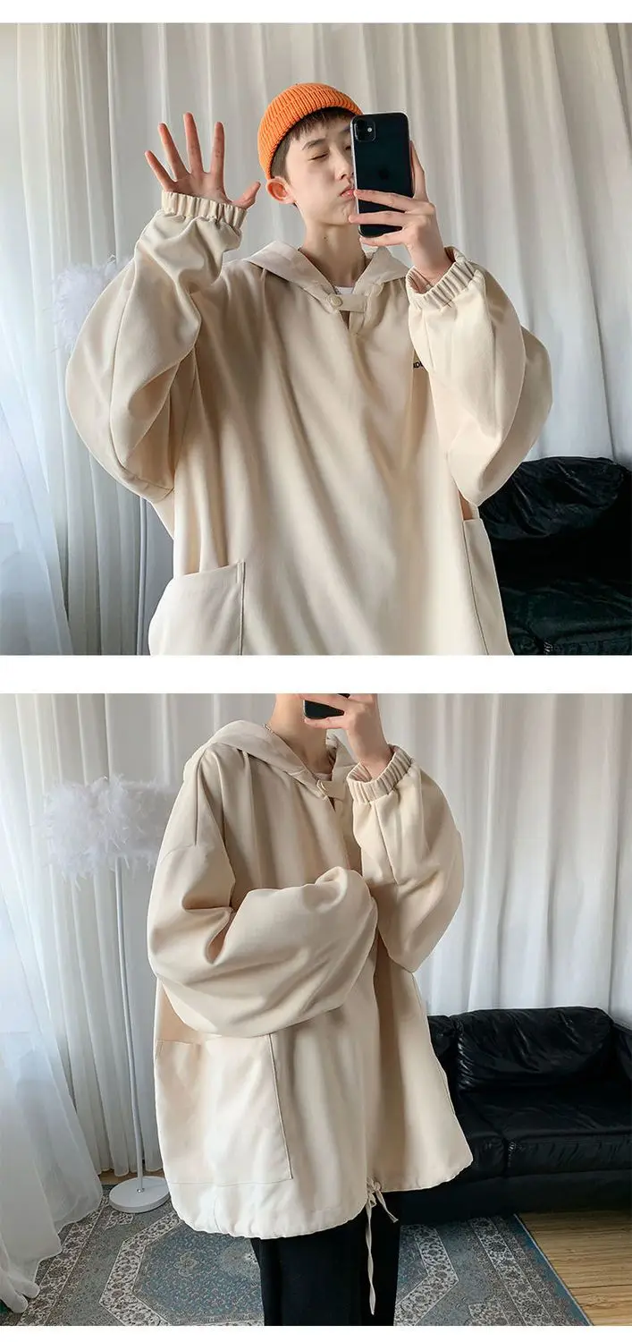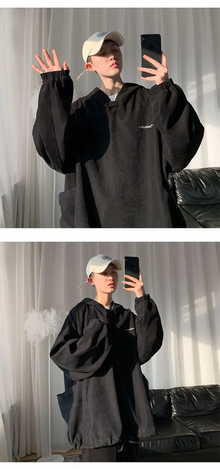 Fall Winter Letter Print Pocket Men Long Sleeve Hooded Sweatshirts Loose Vintage Korean Fashion Simple Oversized Couple Clothing