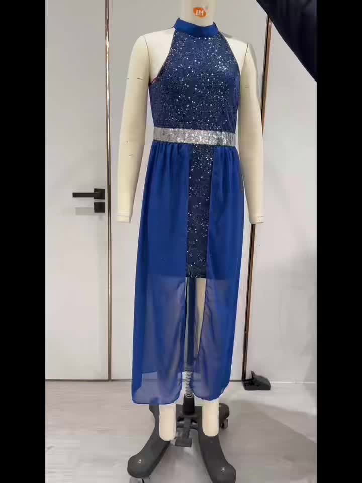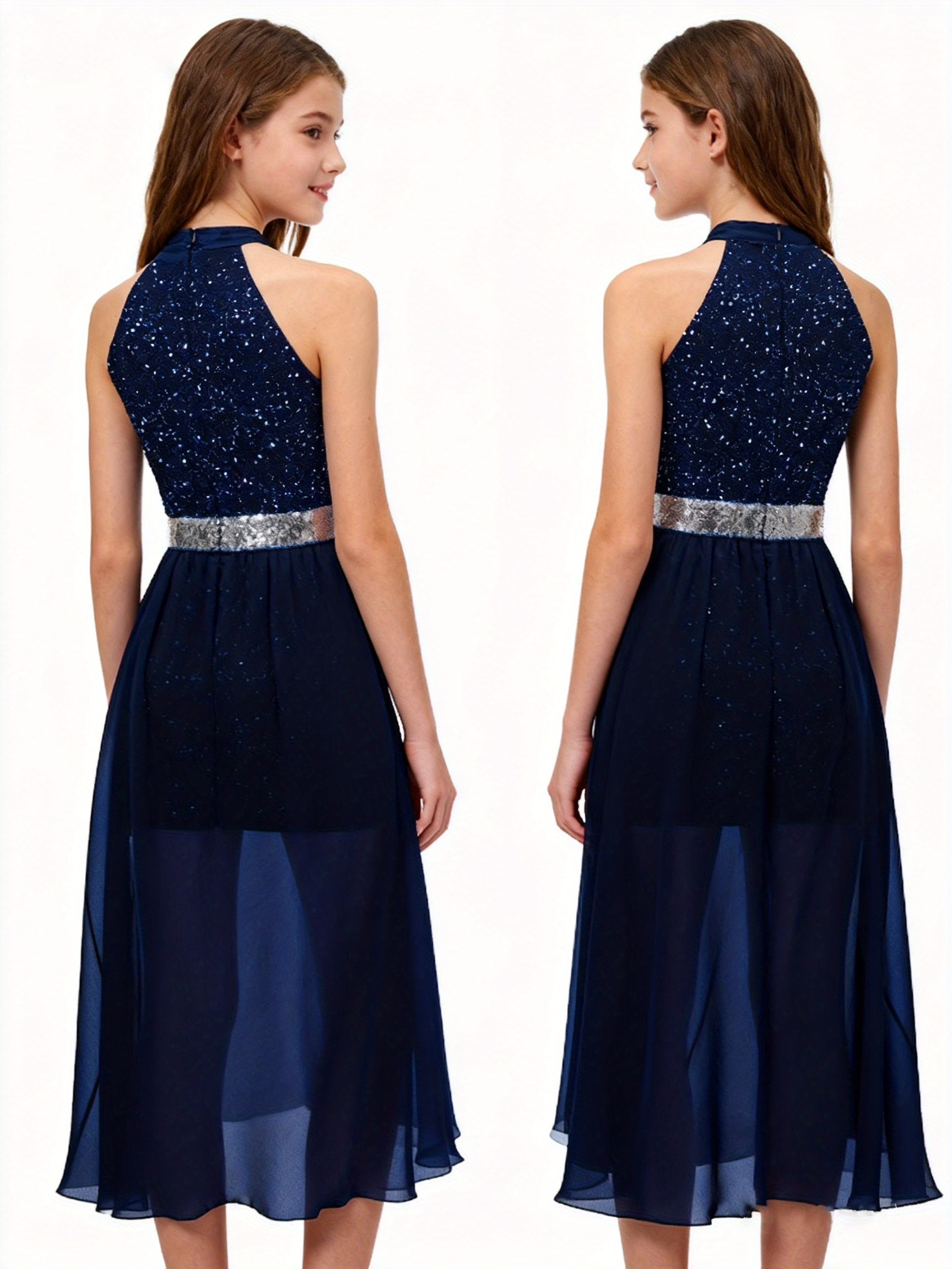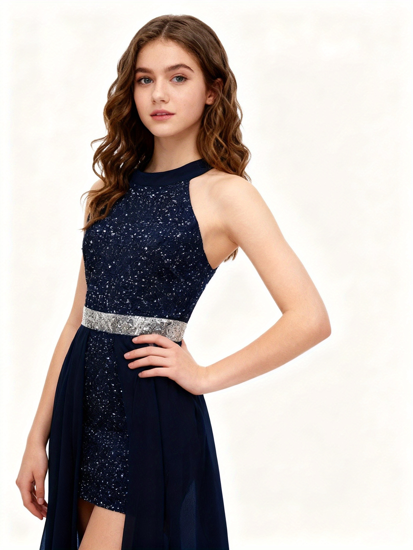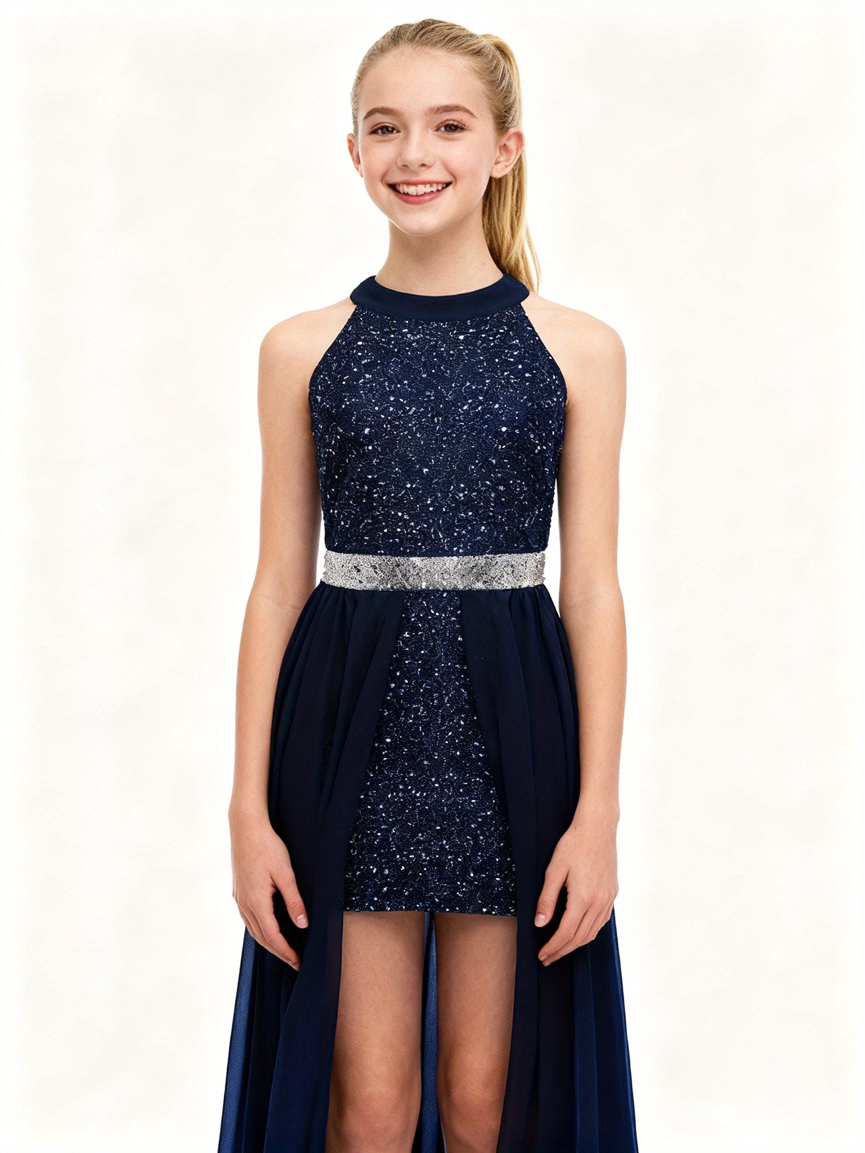 Fashionable Teen Girl’s Banquet Sequin Light Luxury High-End Waist-Cinching Dress with Short Front and Long Back Chiffon Skirt, -Made Mini Evening Gown, for Teenager