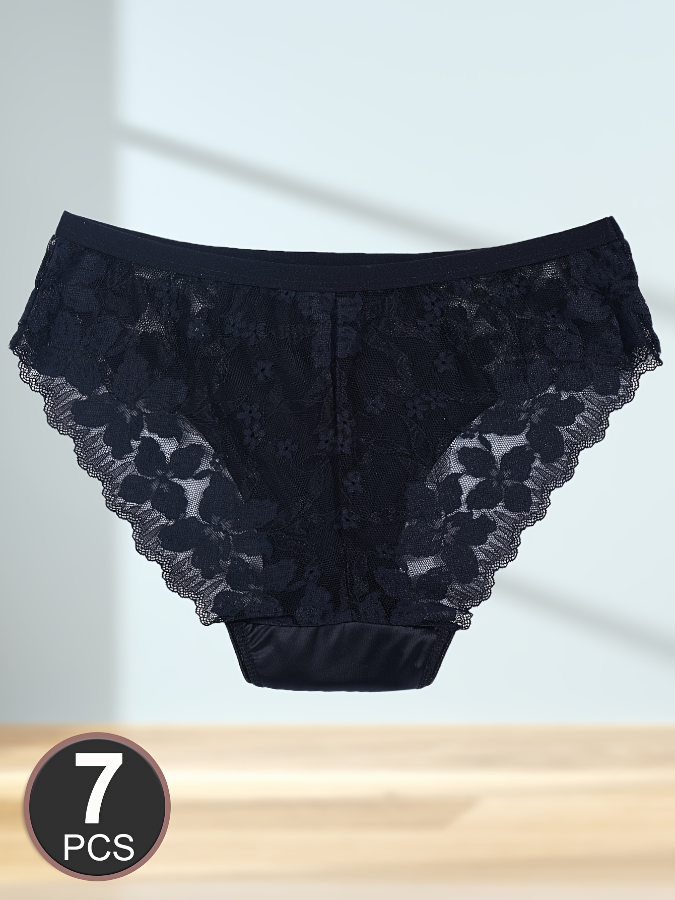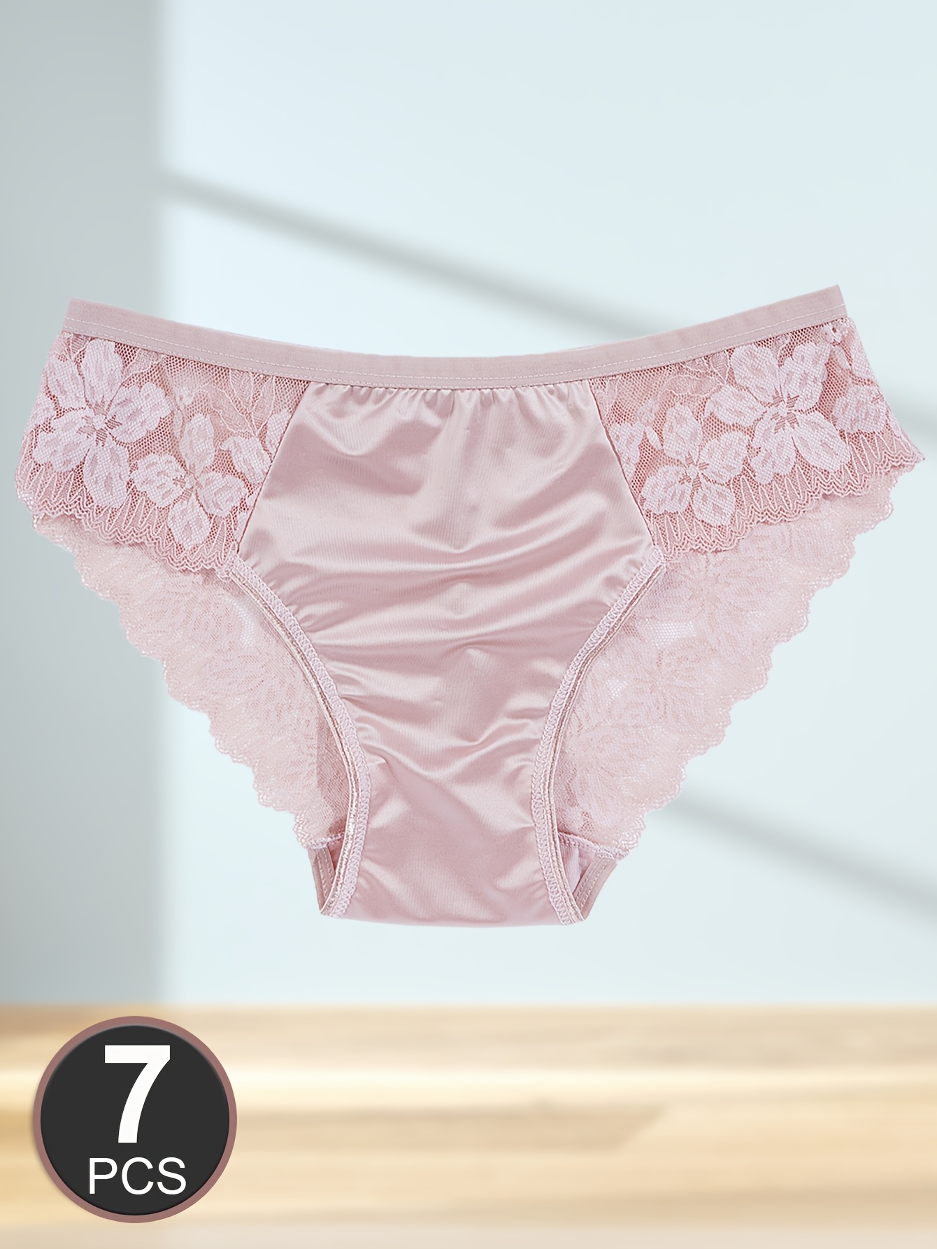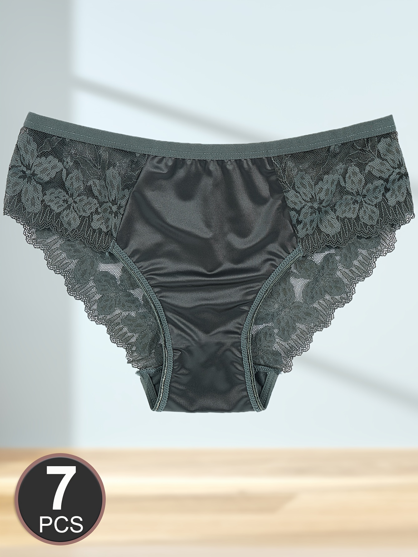 [Floral Lace Satin Briefs] 7pcs Women’s Floral Lace Satin Briefs – Semi-Sheer, Mid-Rise Patchwork Underwear with Contrast Lace Trim, Solid Color, Sexy & Stylish for Casual Attire, Cute Underwear, Satinlike Texture