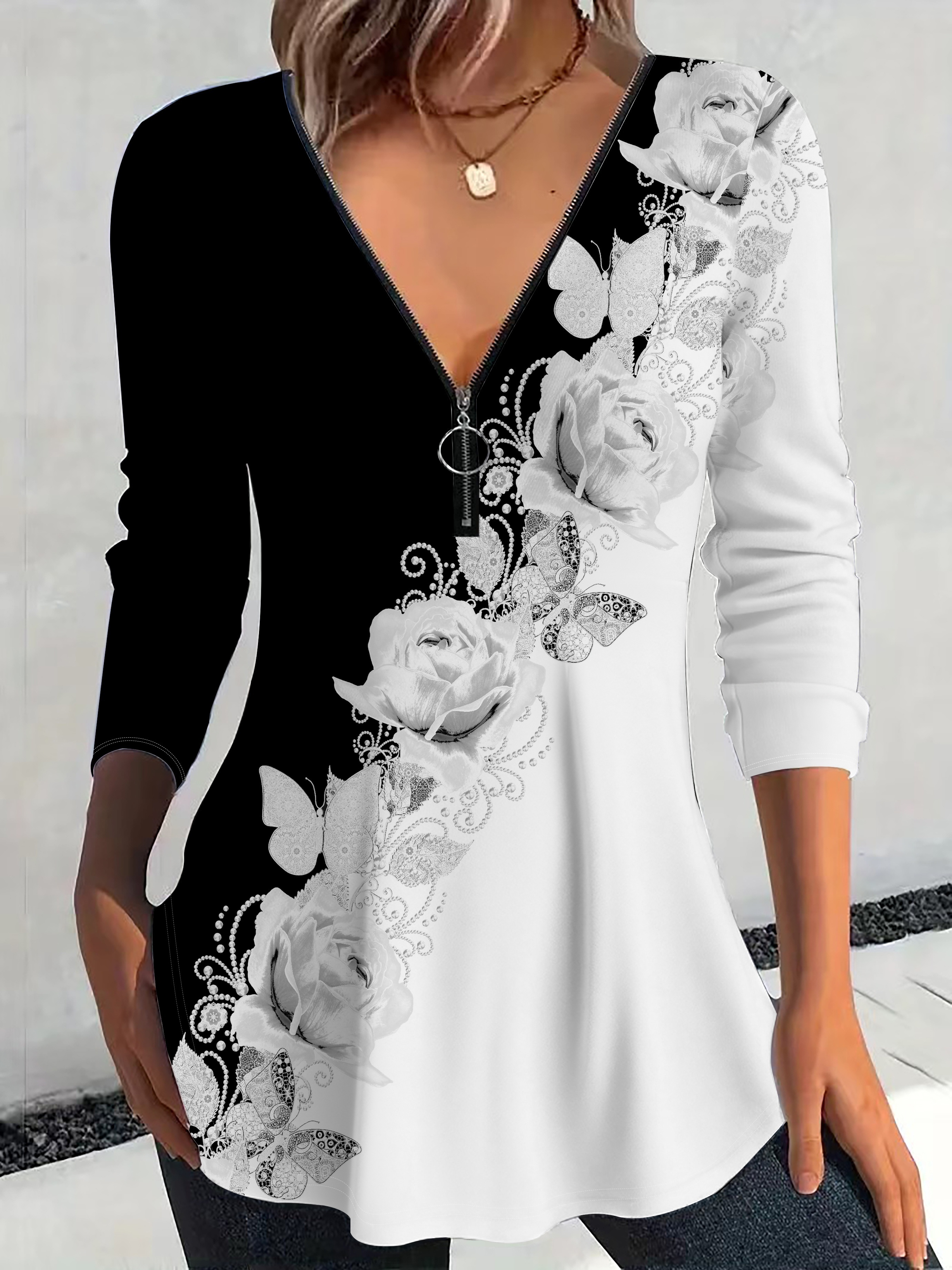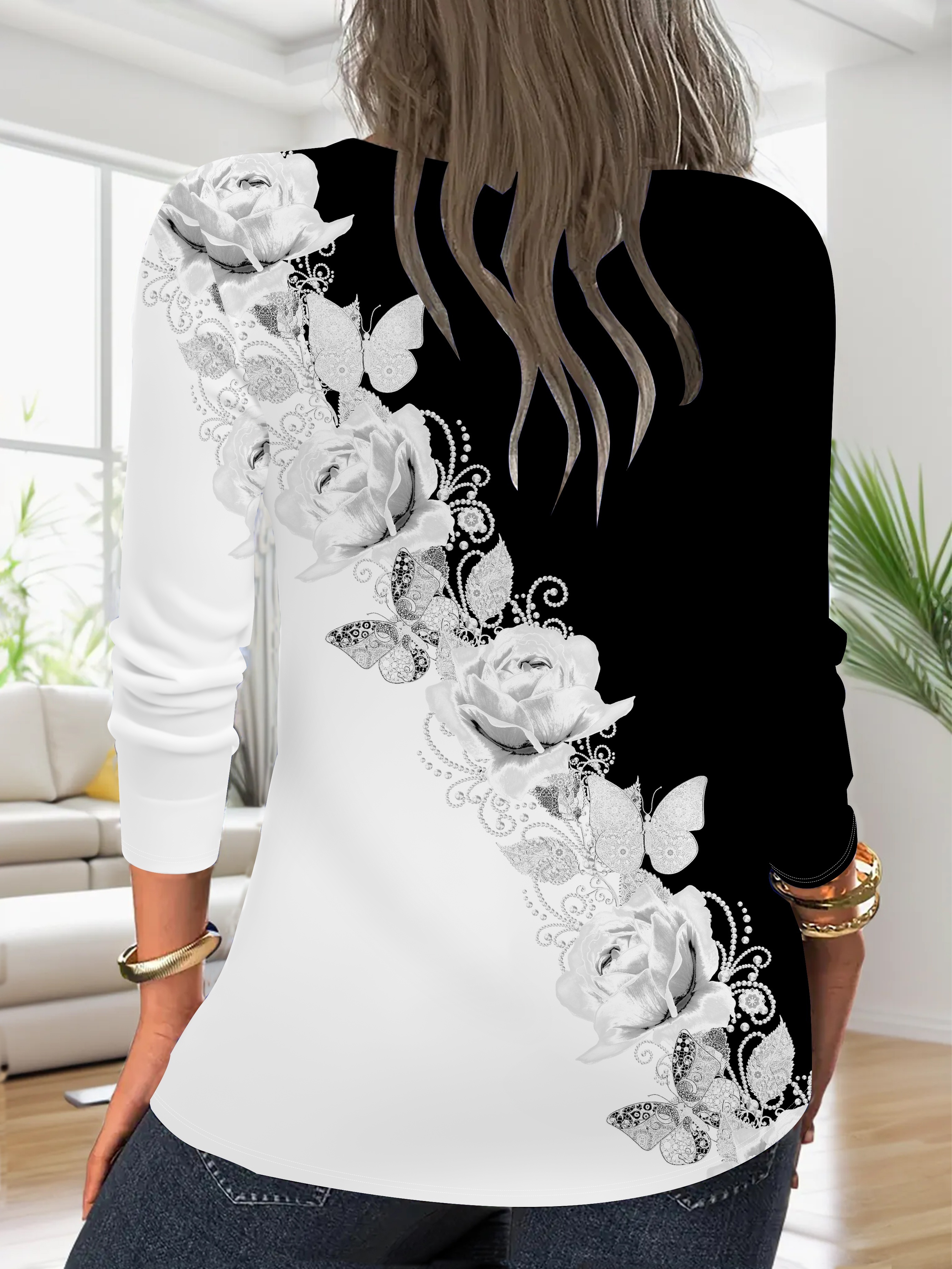 Floral Print V Neck T-Shirt, Casual Long Sleeve T-Shirt For Spring & Fall, Women’s Clothing