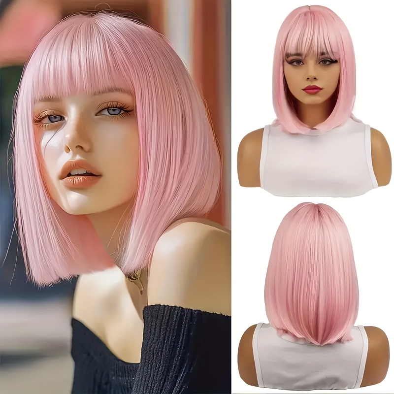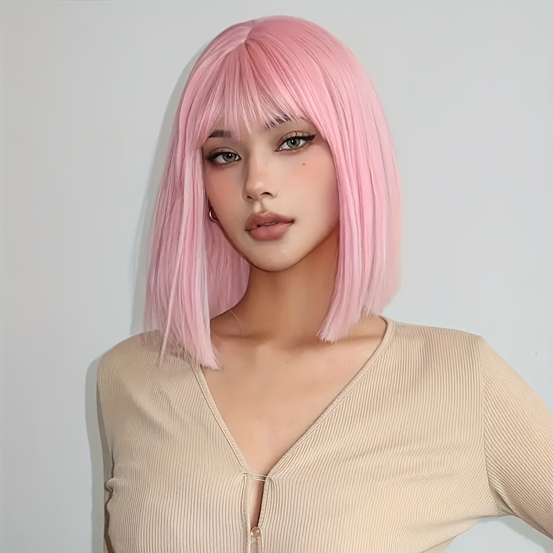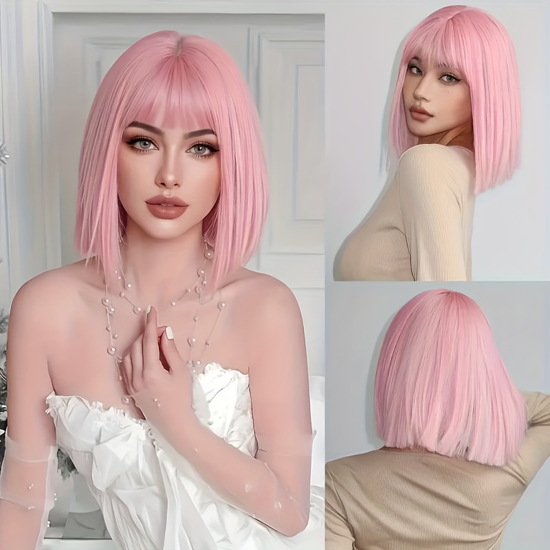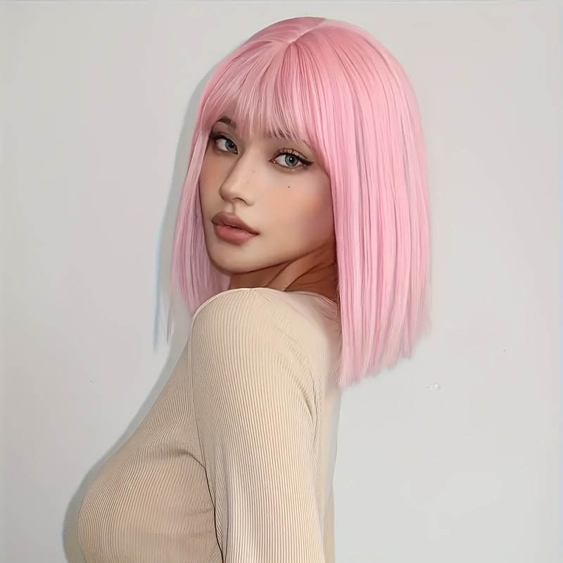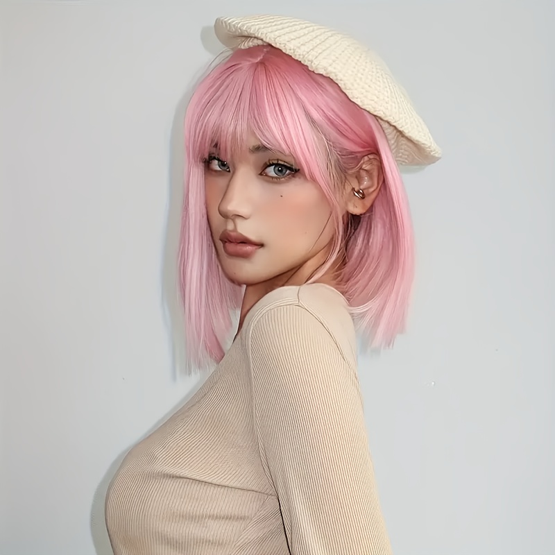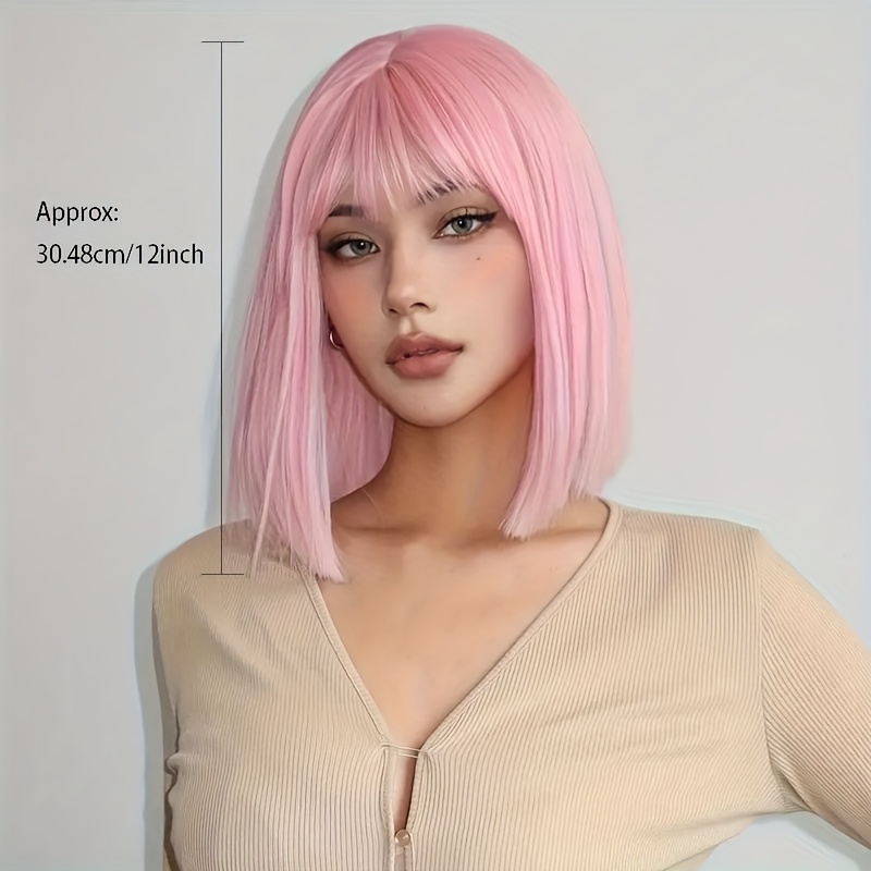 Girl’s pink short hair with bangs wig -12 inches, comfortable and natural style, easy to take care of, elegant style, Christmas, Black Friday, Korean Wave, school and theme parties.