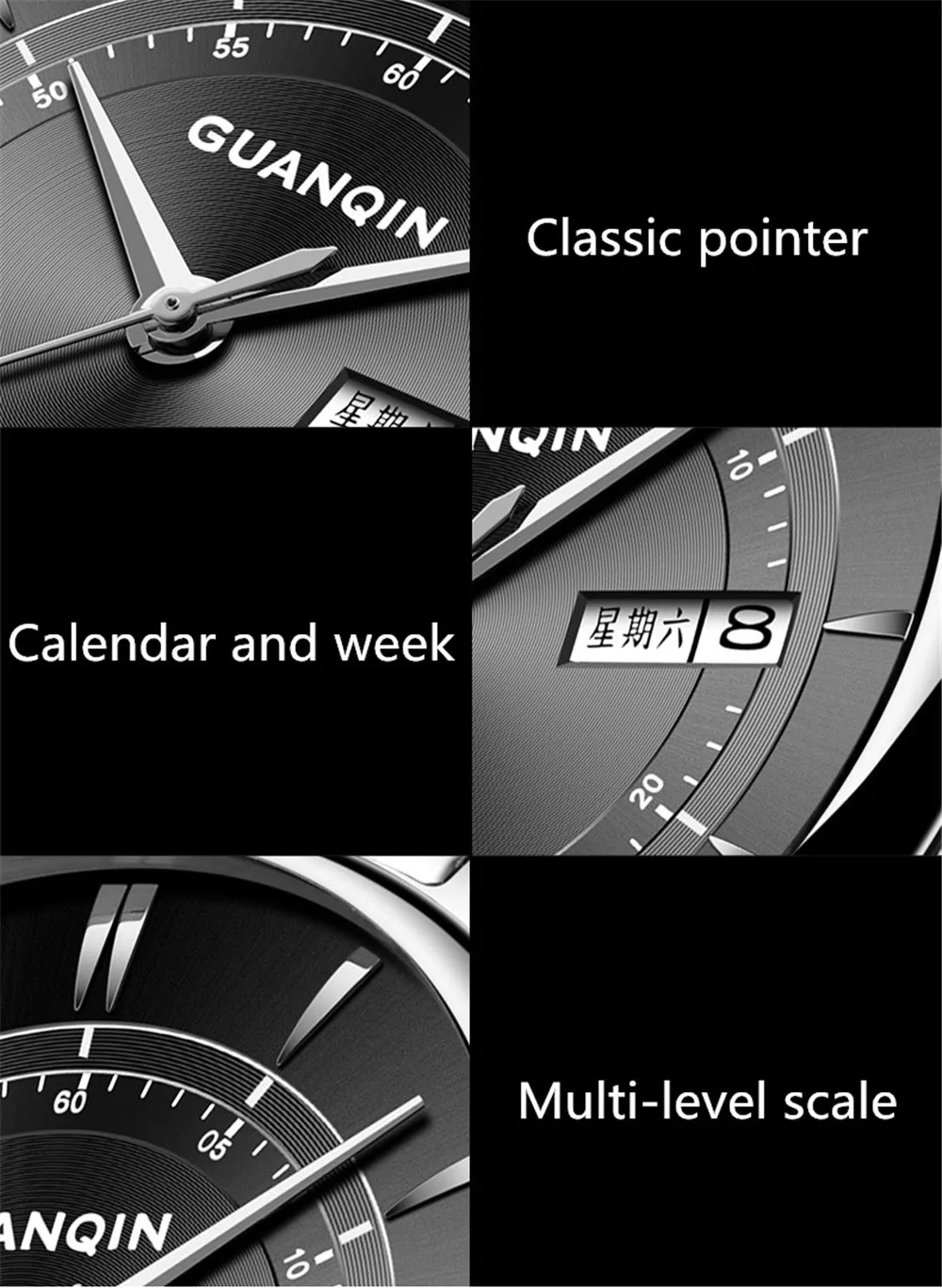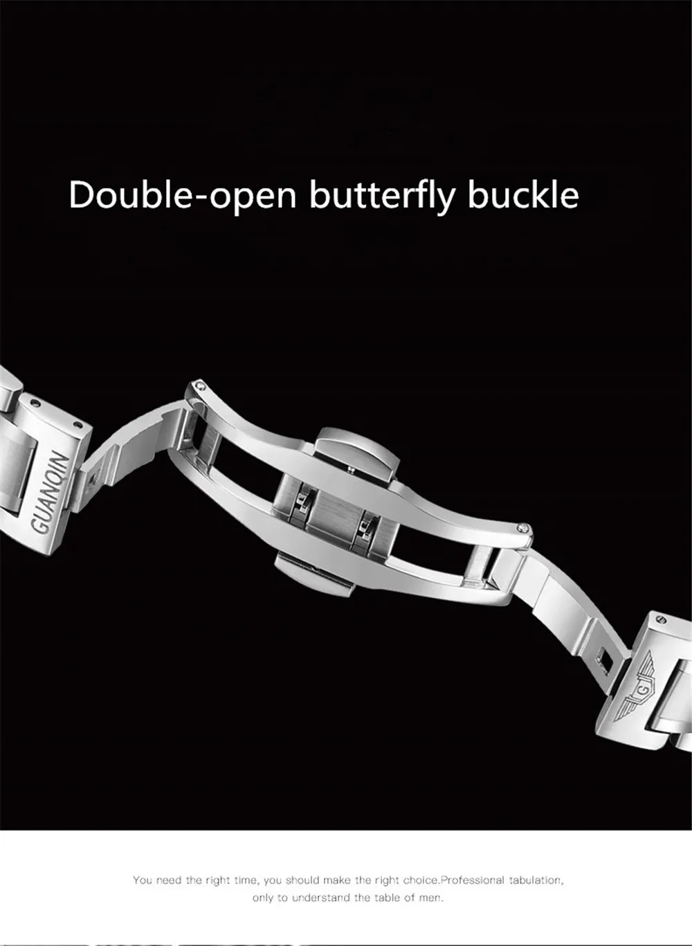 – Stainless steel buckle & back case with 3D GUANQIN logo;