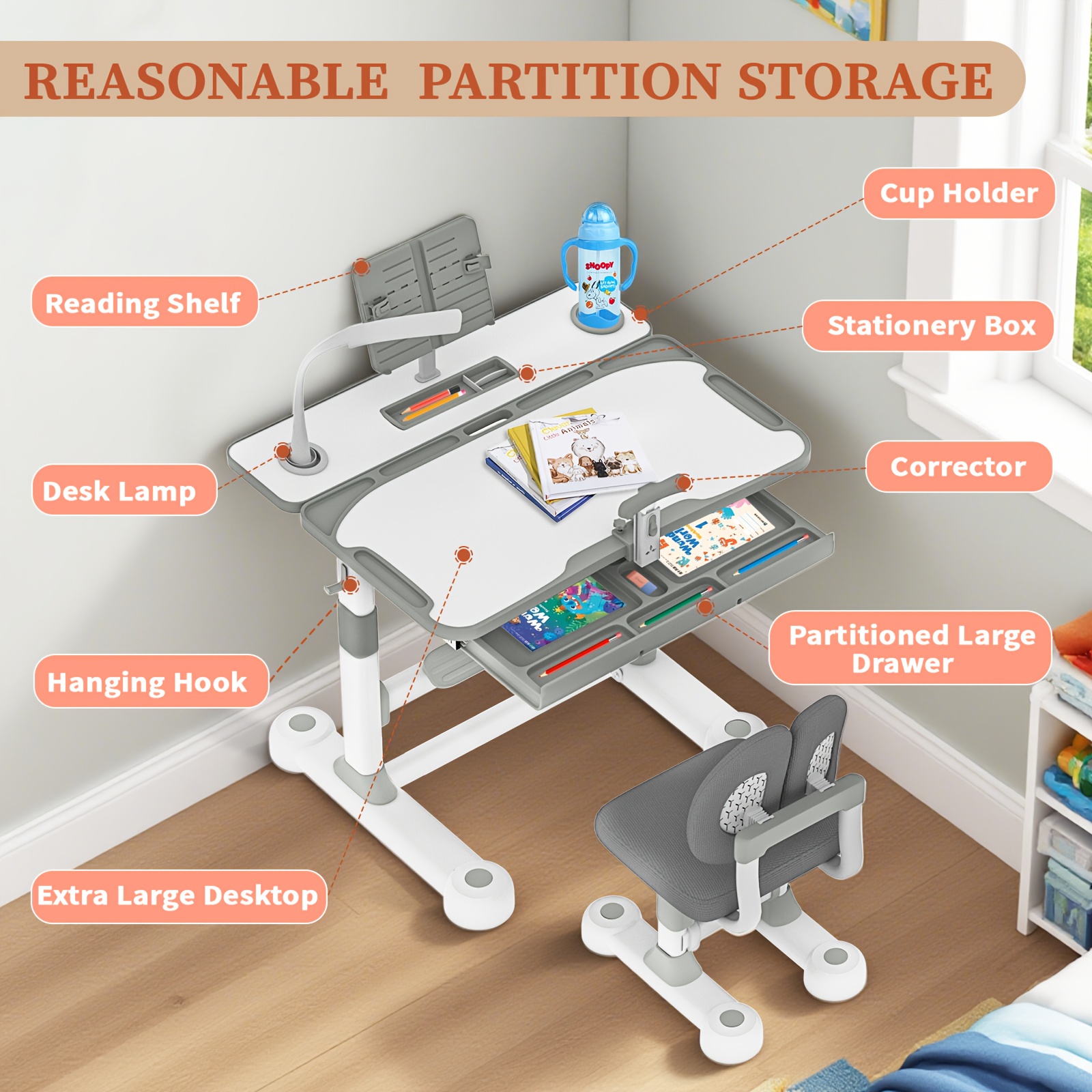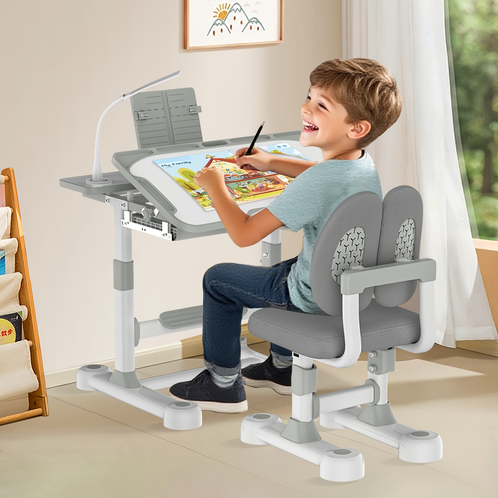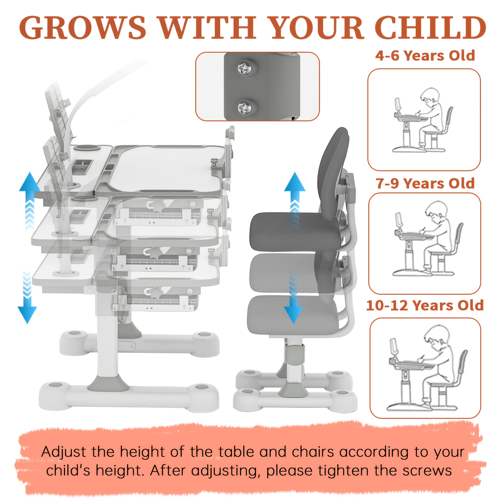 Height Adjustable Multifunctional Learning Table and Chair Set for Kids with Storage Drawer, Adjustable Tilt Top, Bookshelf, and LED Light, Suitable for Writing, Reading, and Drawing, Essential for Home Study, Ideal as a Gift