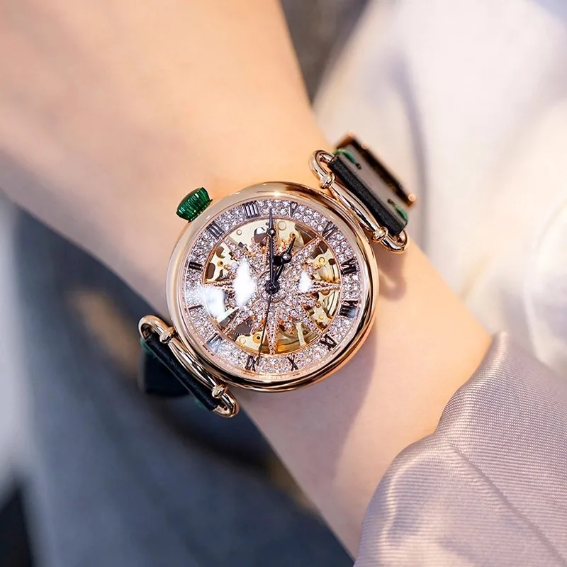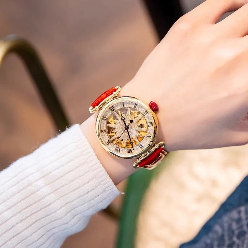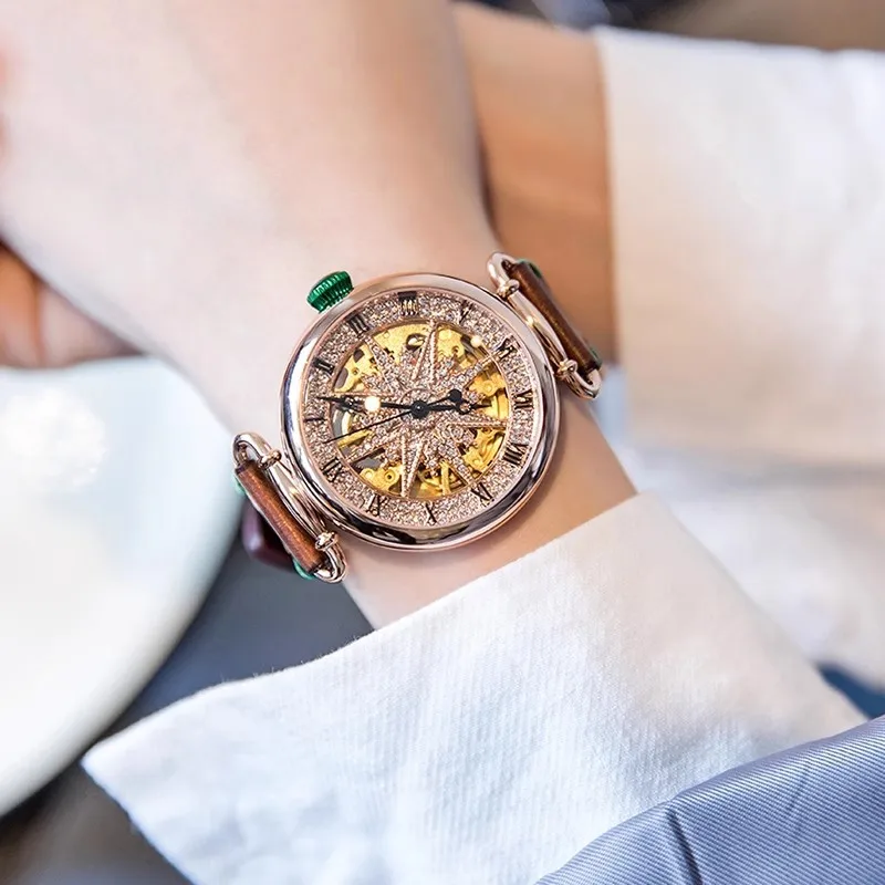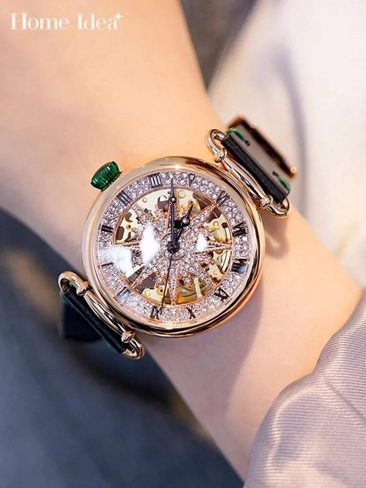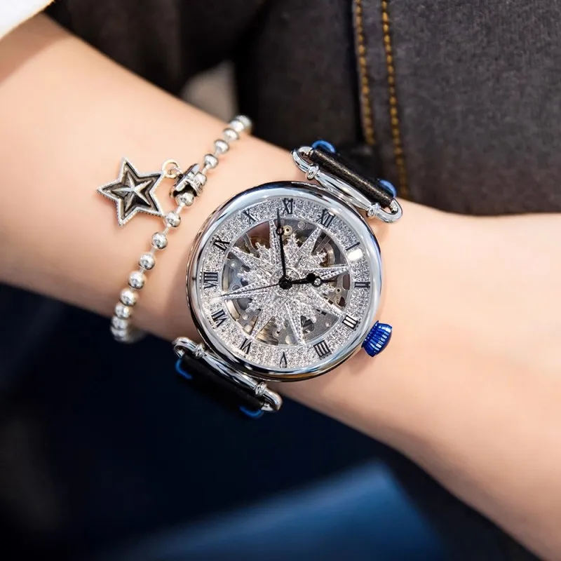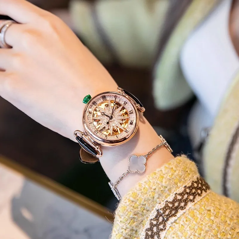 High Quality Women Elegant Mechanical Watch Genuine Leather Strap Pin Buckle Shiny Diamonds Watches Office Lady Work Wristwatch
