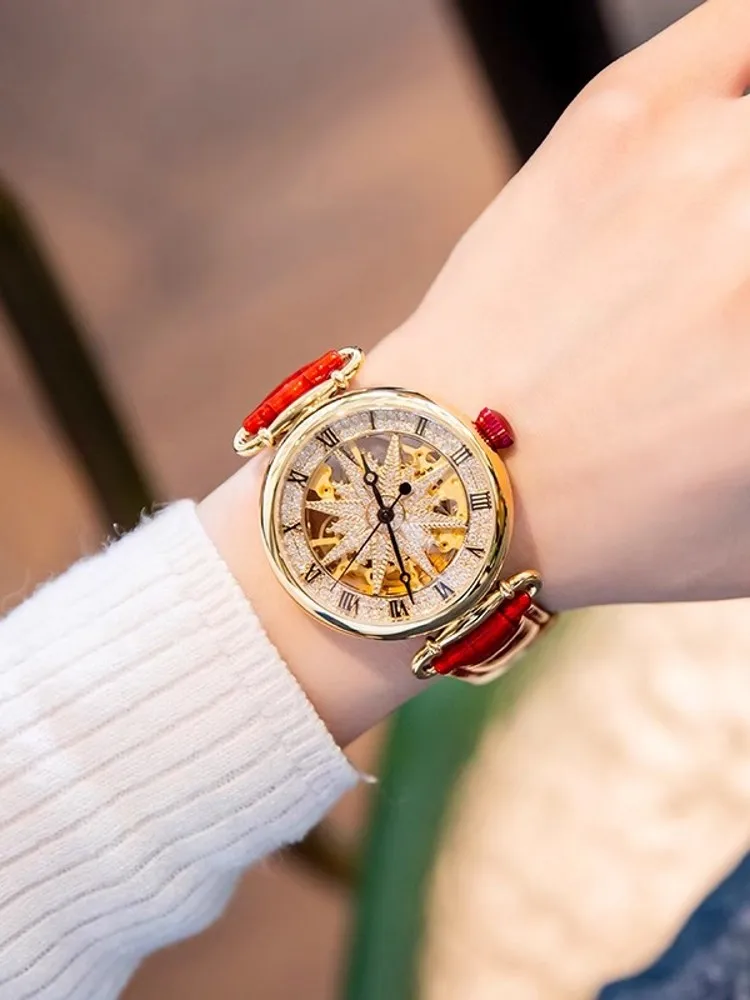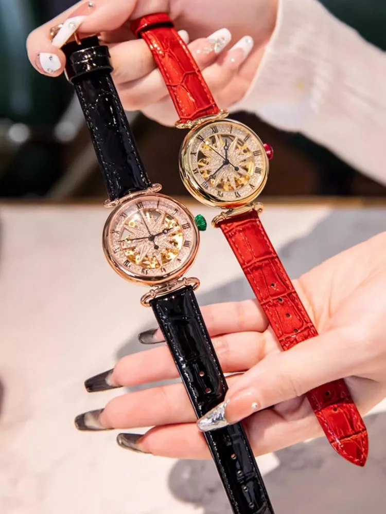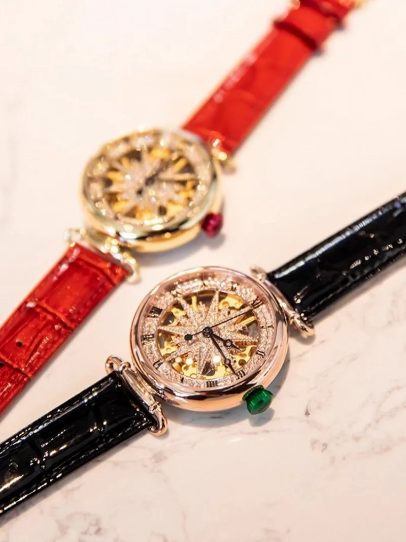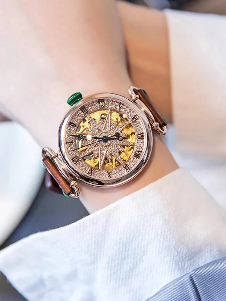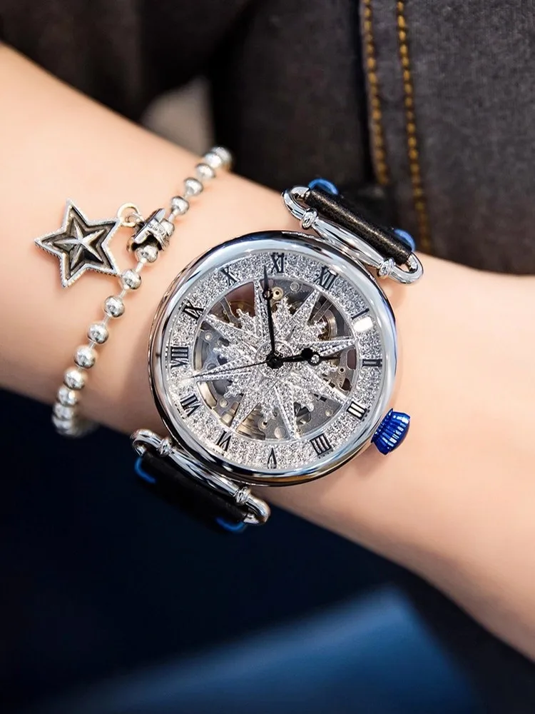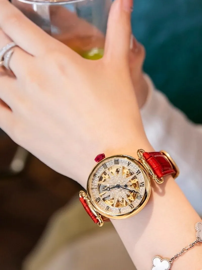 High Quality Women Elegant Mechanical Watch Genuine Leather Strap Pin Buckle Shiny Diamonds Watches Office Lady Work Wristwatch