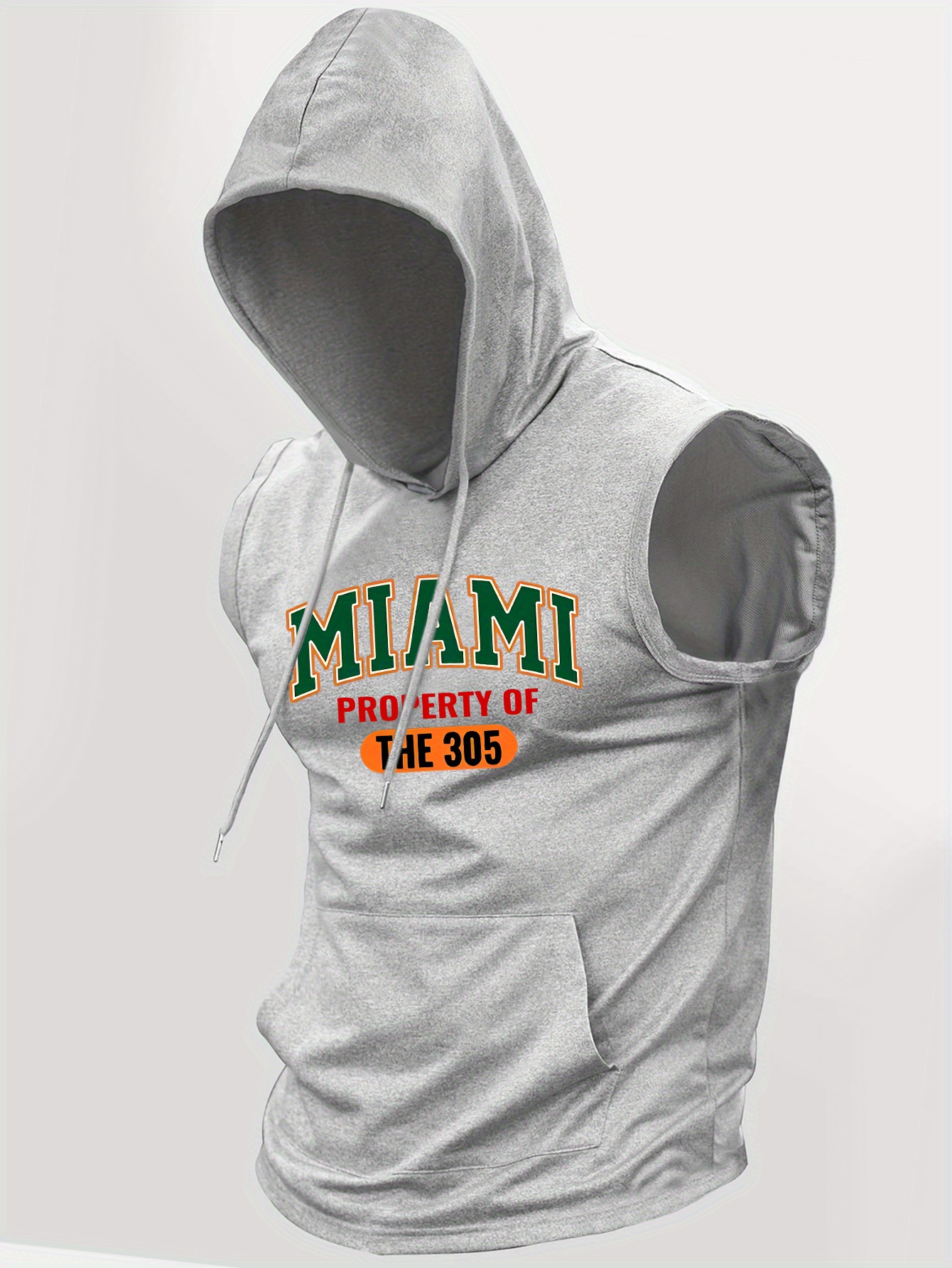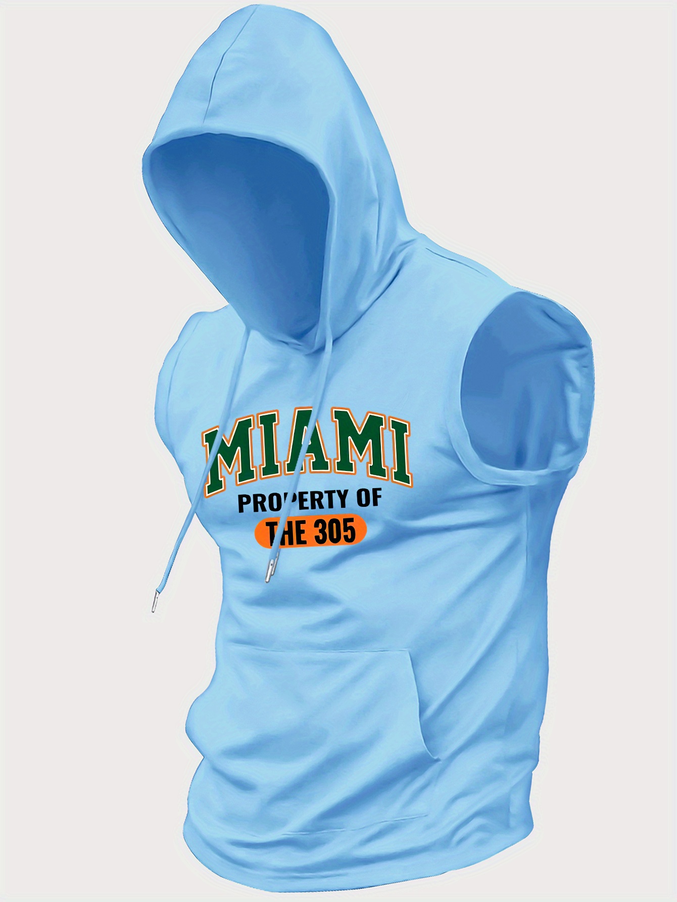 [Hooded Tank Top] Men’s Summer Casual Hooded Tank Top – Miami Graphic Print Sleeveless Shirt with Kangaroo Pocket, Adjustable Drawstring Hood, Breathable Knit Fabric for Outdoor Activities (Black), Sports Activewear, Comfortable Fit