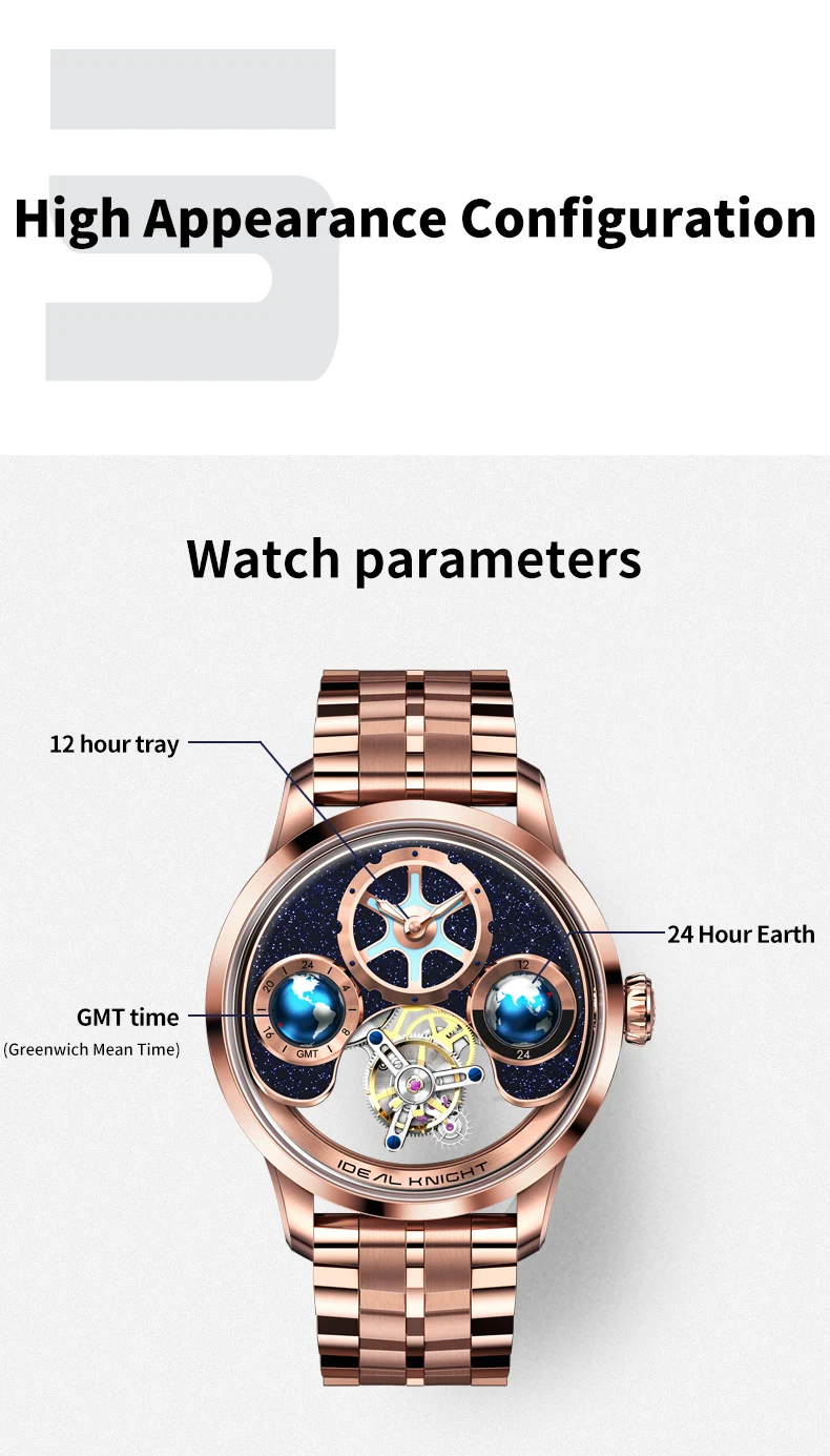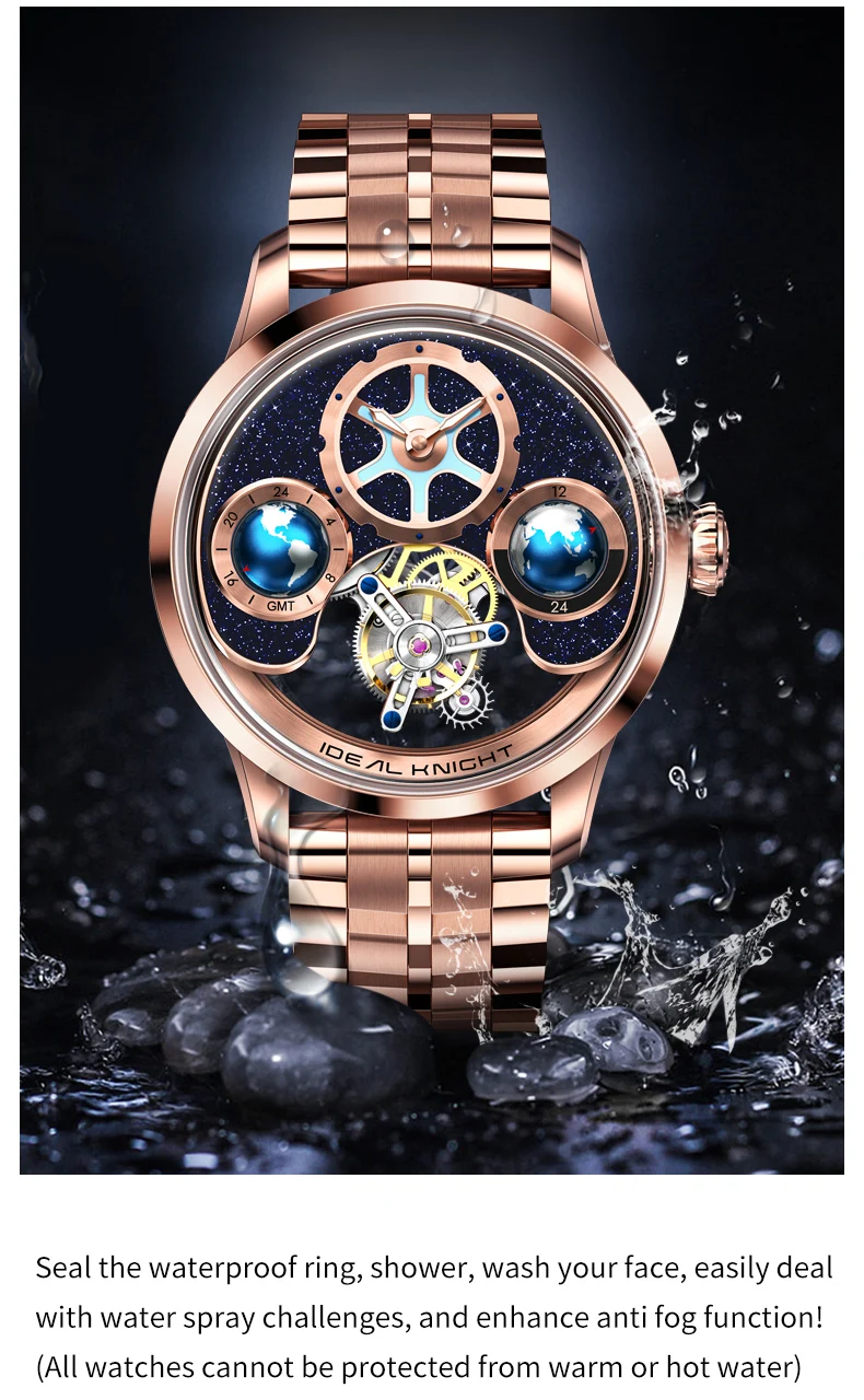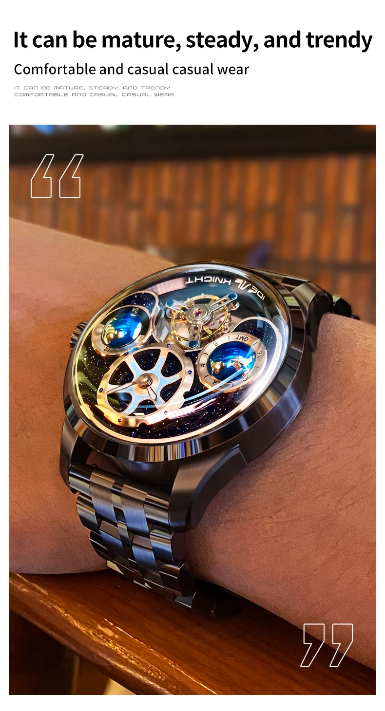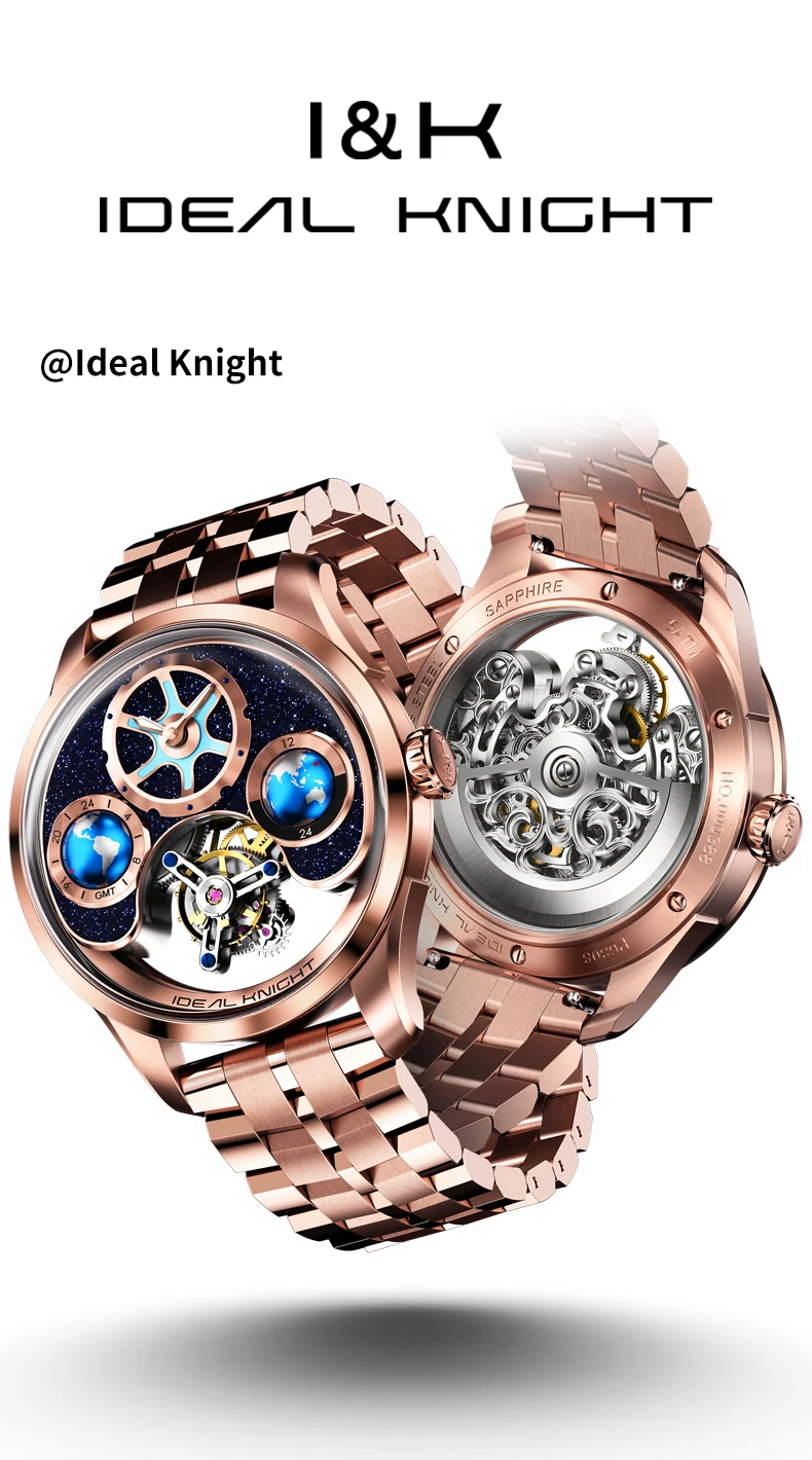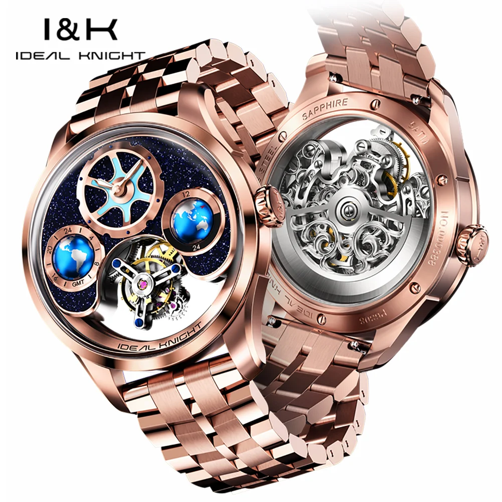 IDEAL KNIGHT 6805 Man Watch Sapphire Mirror Mechanical Watch For Men Blue Earth Dial Tourbillon Clock Two Location Time Display