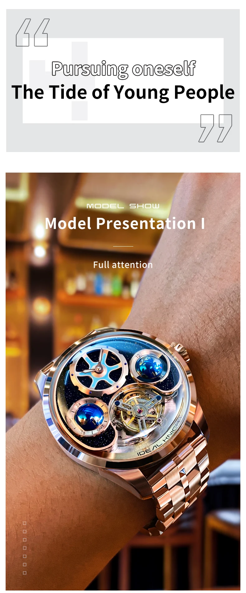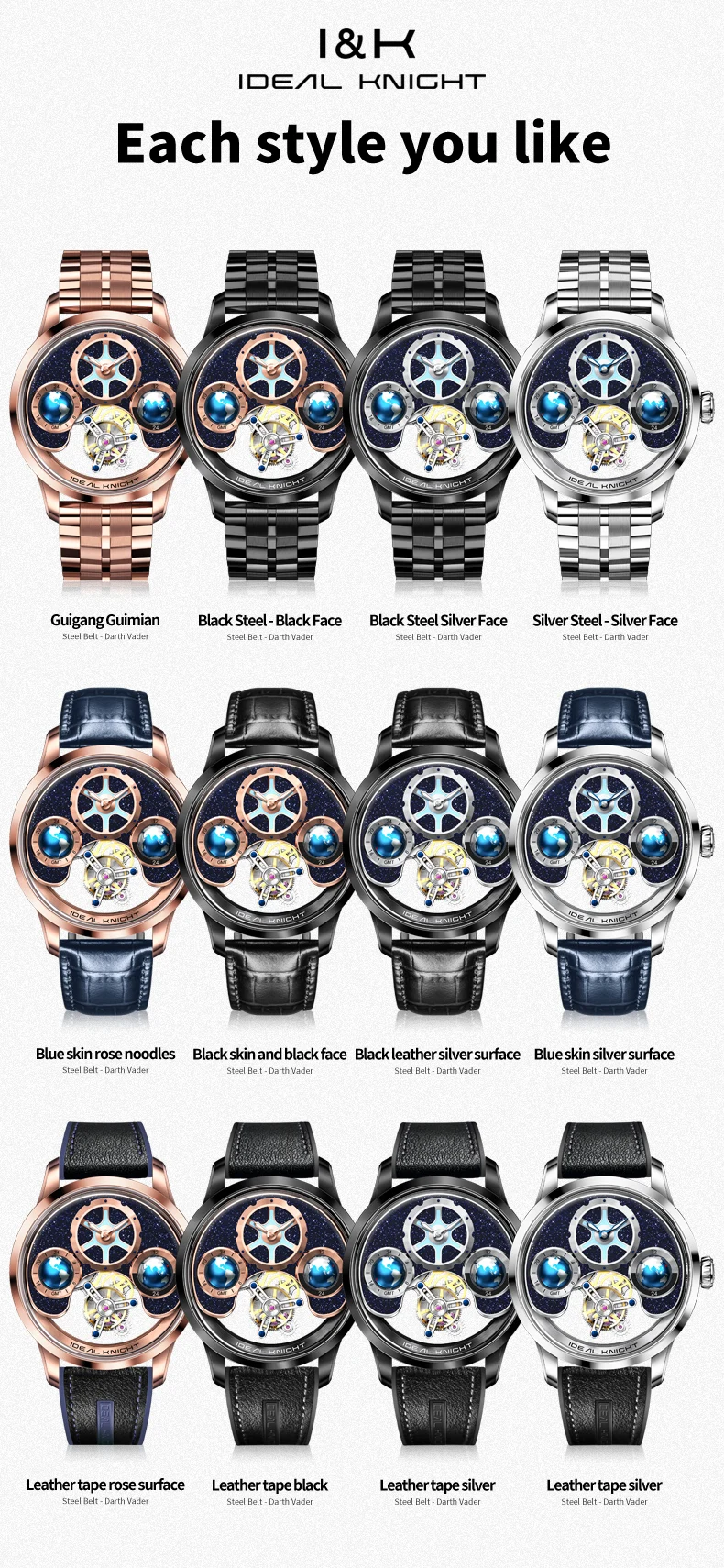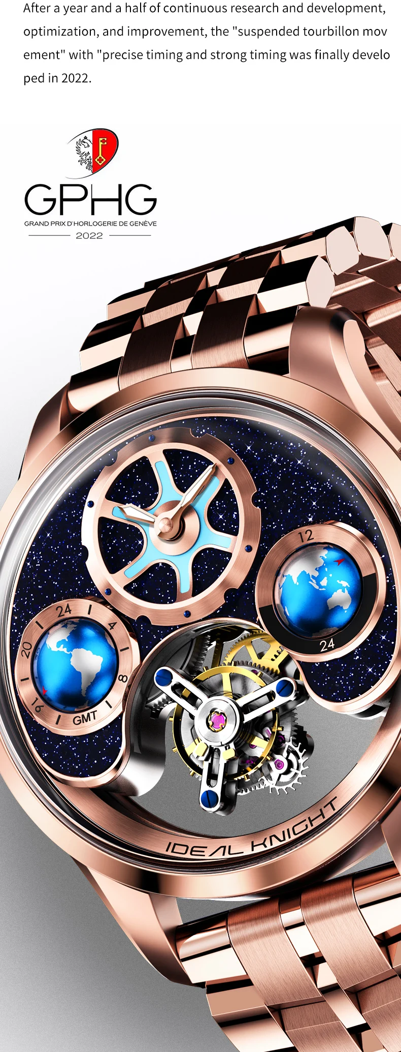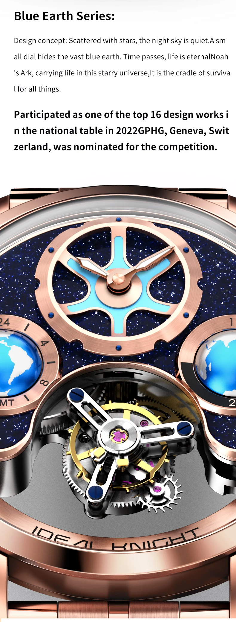 IDEAL KNIGHT 6805 Man Watch Sapphire Mirror Mechanical Watch For Men Blue Earth Dial Tourbillon Clock Two Location Time Display