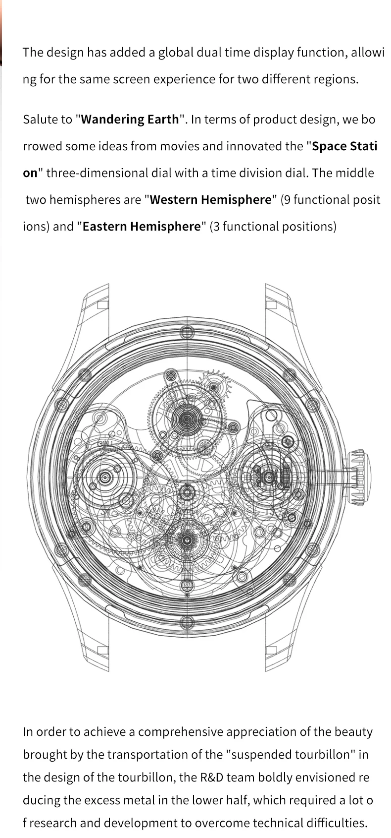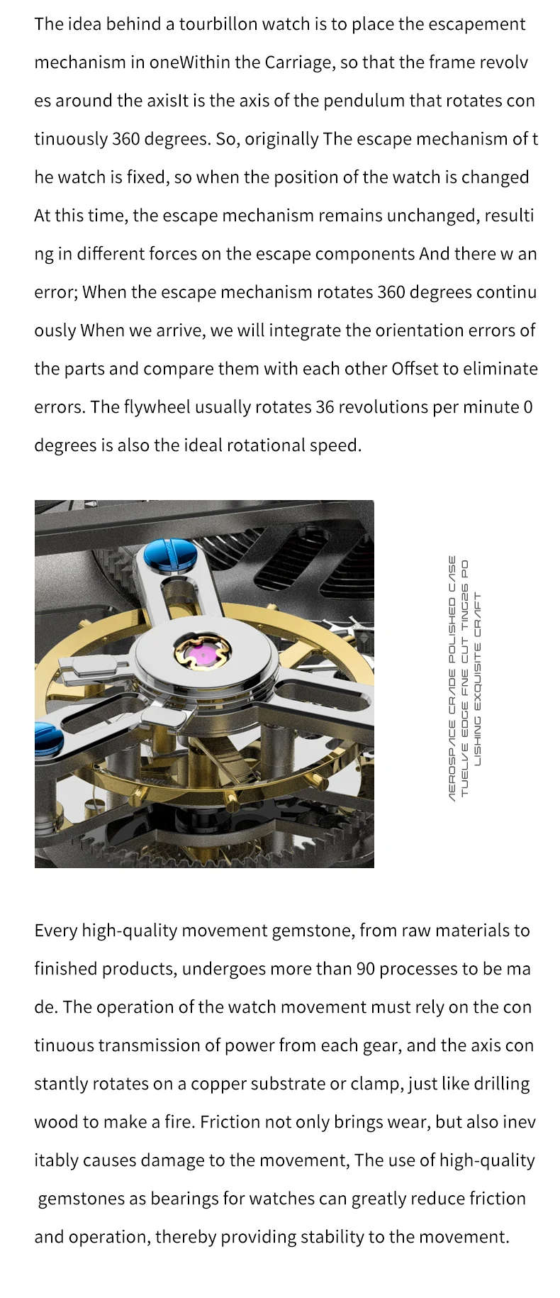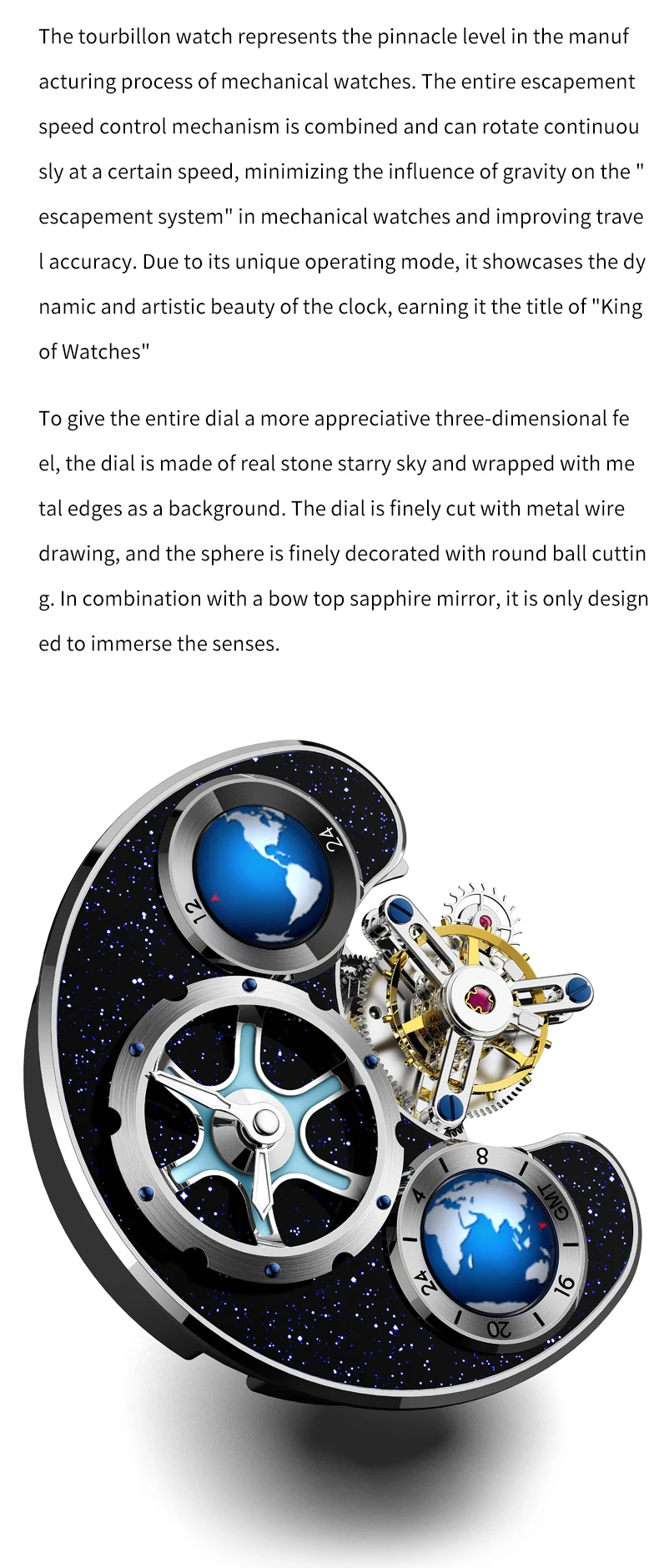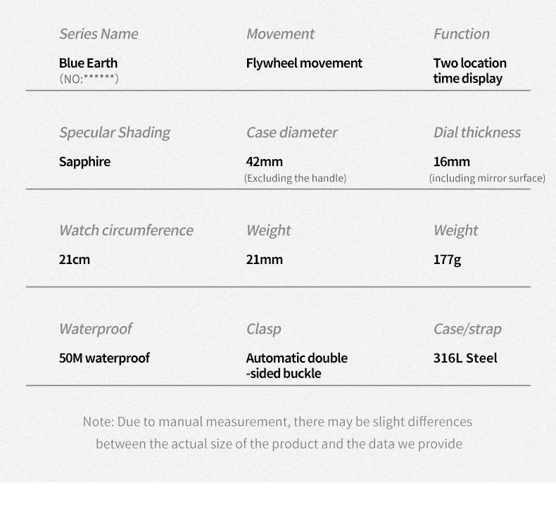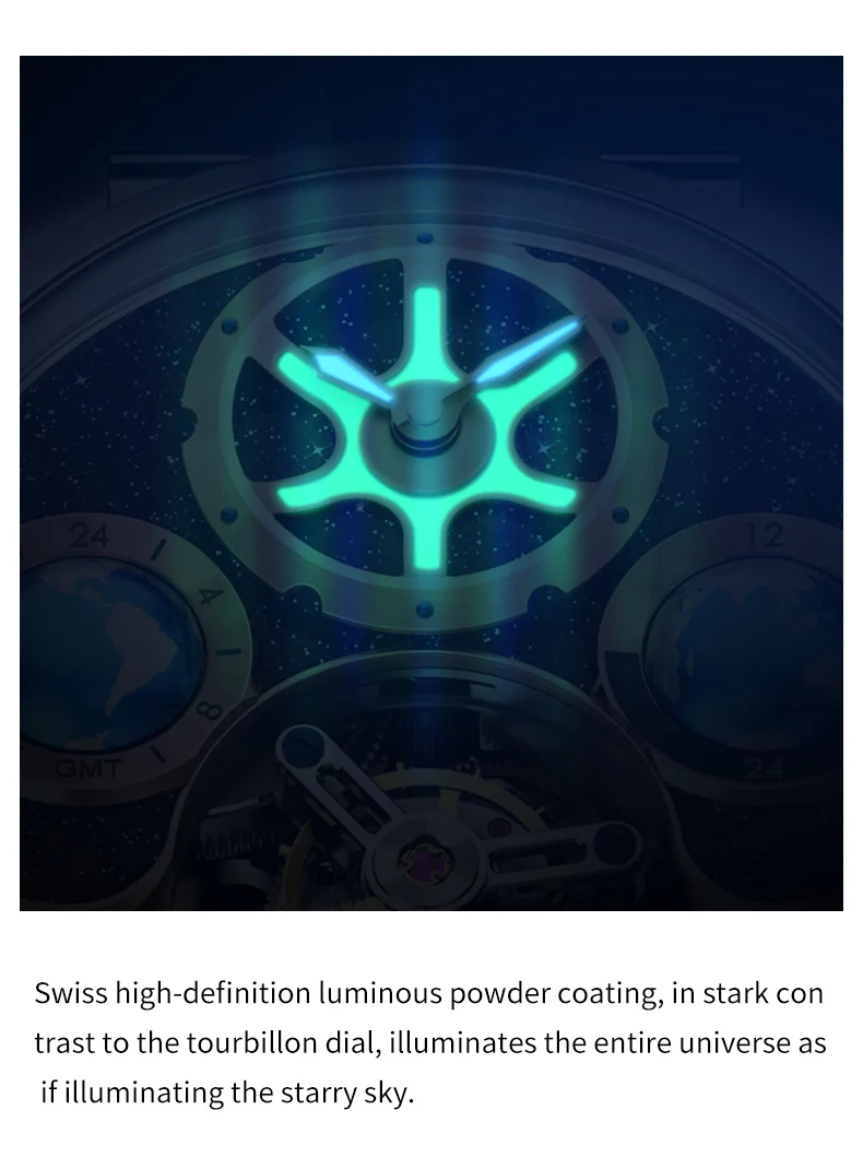 Blue Earth series watches: Tourbillon movement, hollow design, synthetic sapphire mirror surface, more effective in preventing mirror wear, using high-quality gemstones as bearings for the watch, greatly reducing friction and making the movement operate more stably.