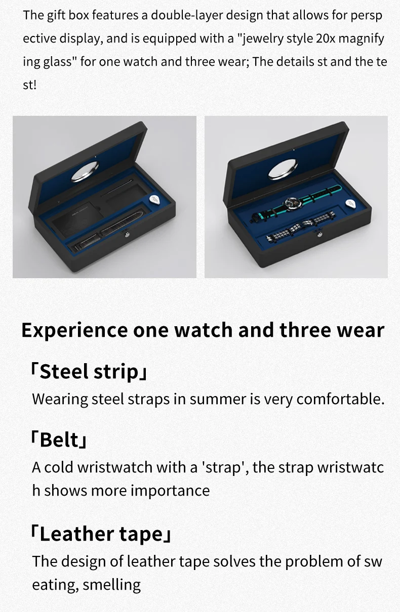 Watch come with three watch straps: steel strap, leather strap, tape strap.