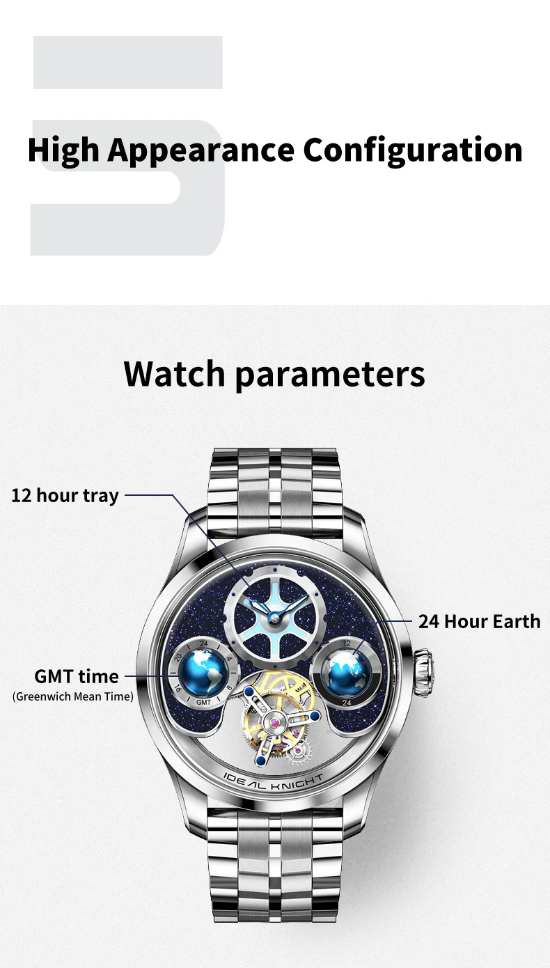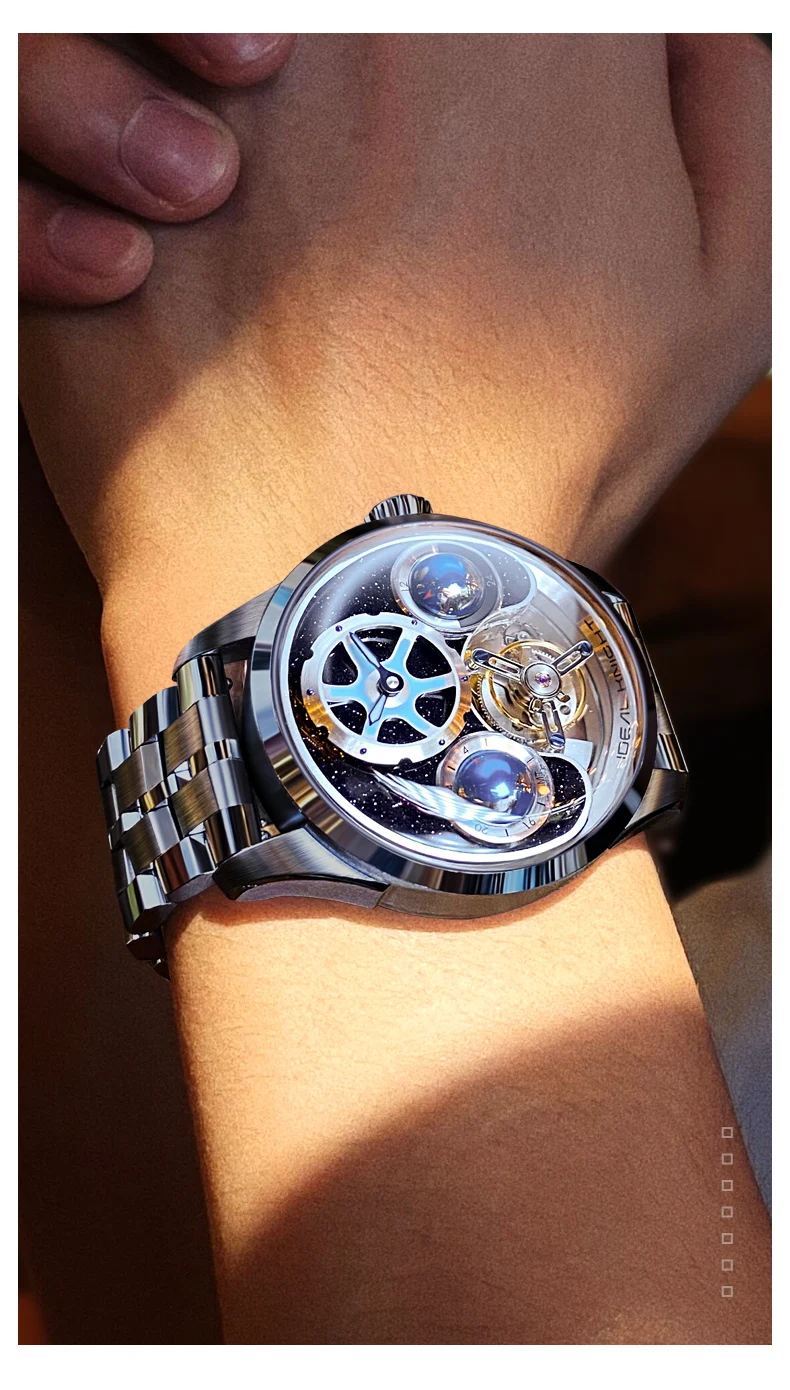 IDEAL KNIGHT 6808 Watch For Men Tourbillon Mechanical Fashion Wristwatch 50M Waterproof Two Location Time Display Man Watches