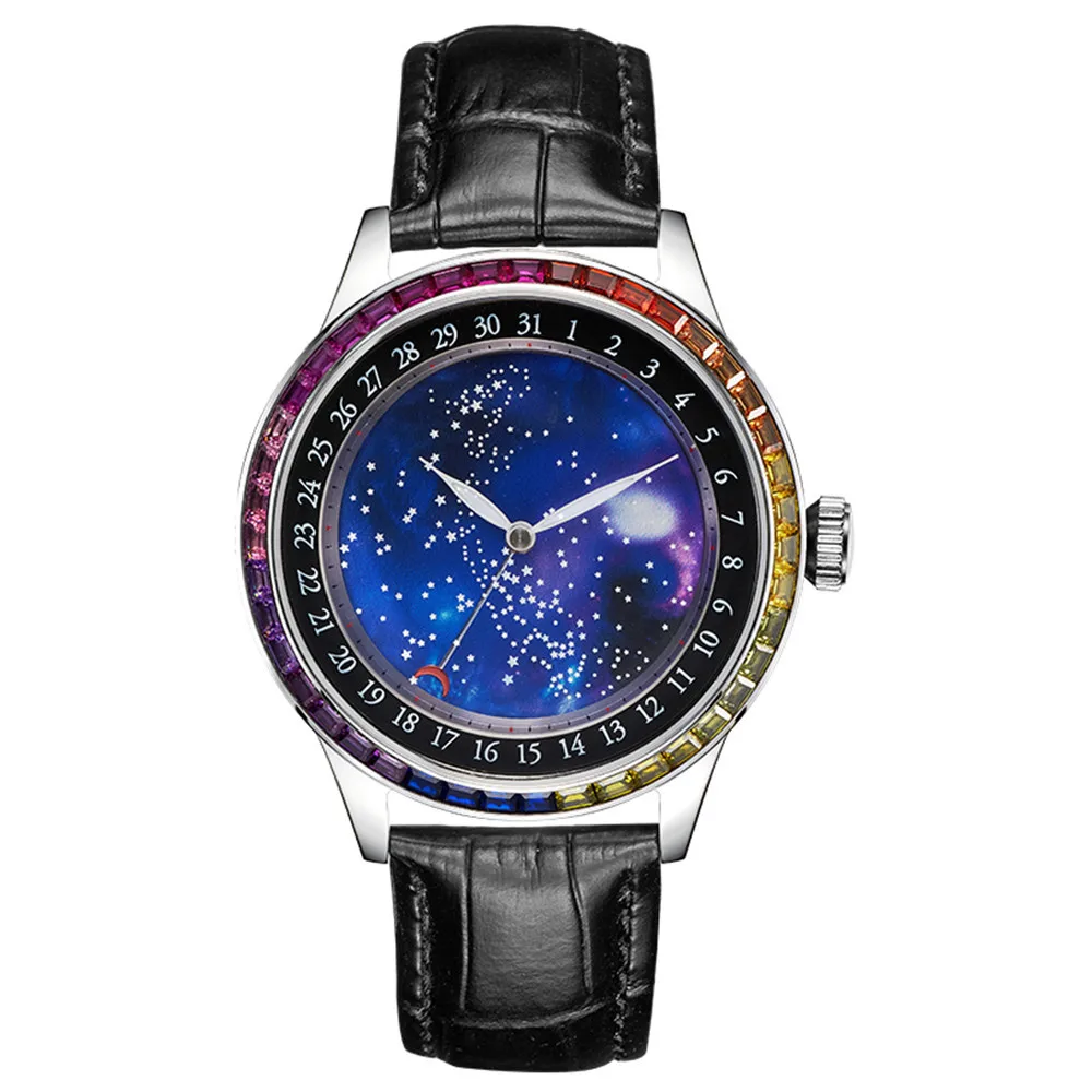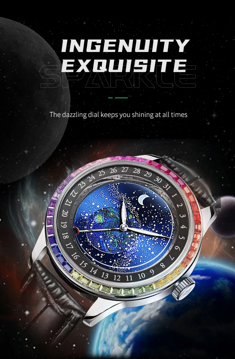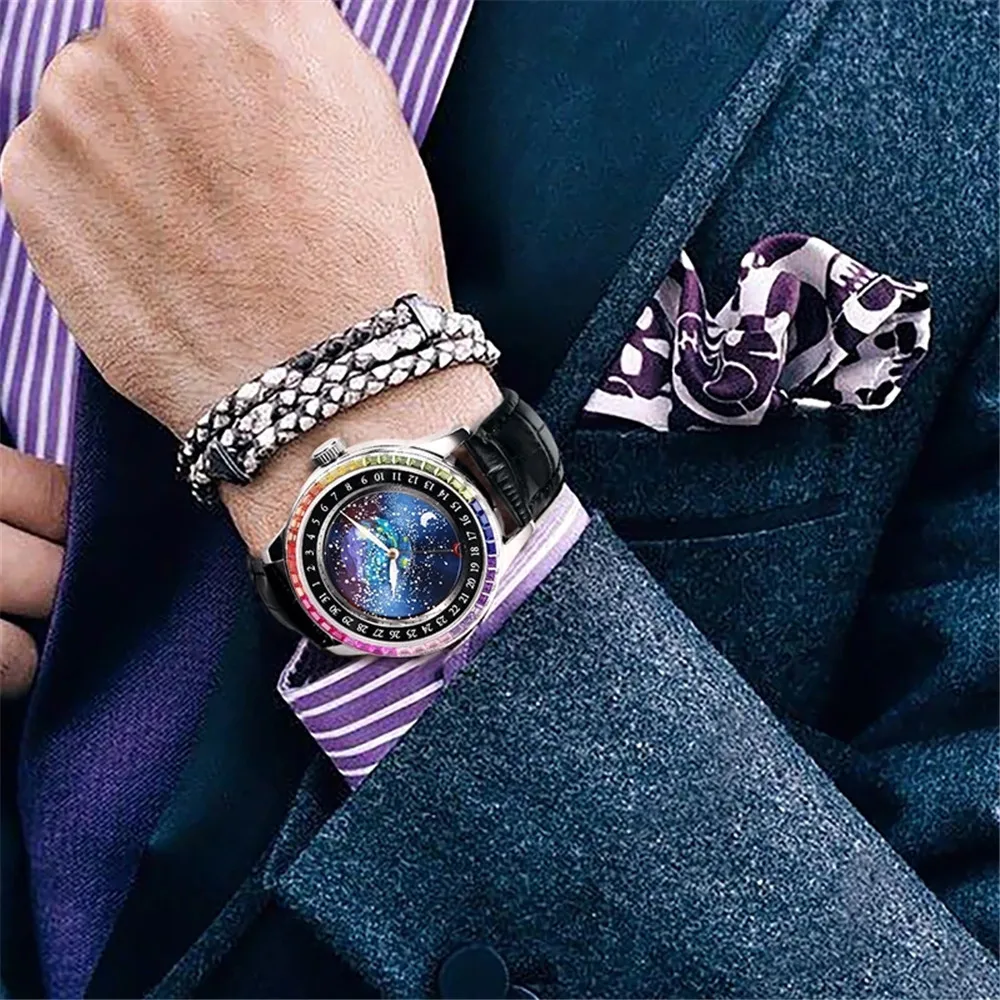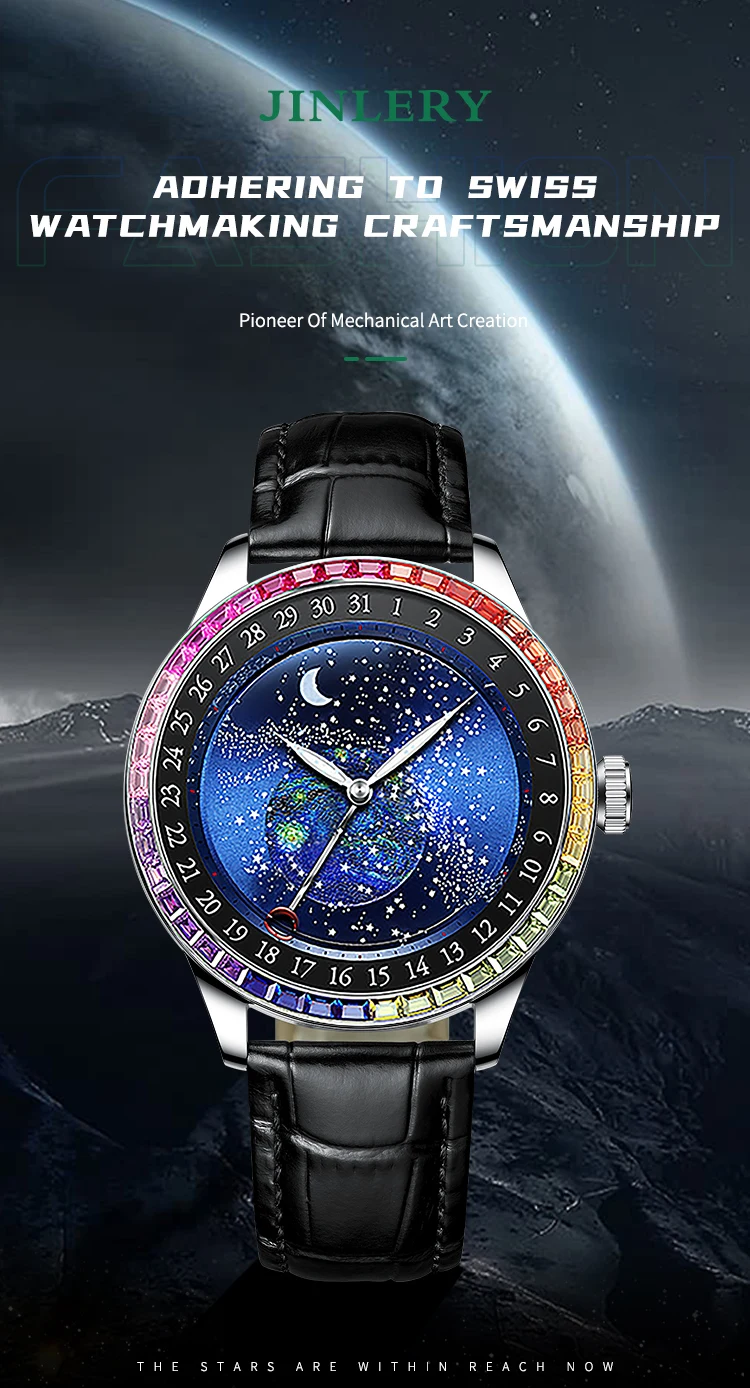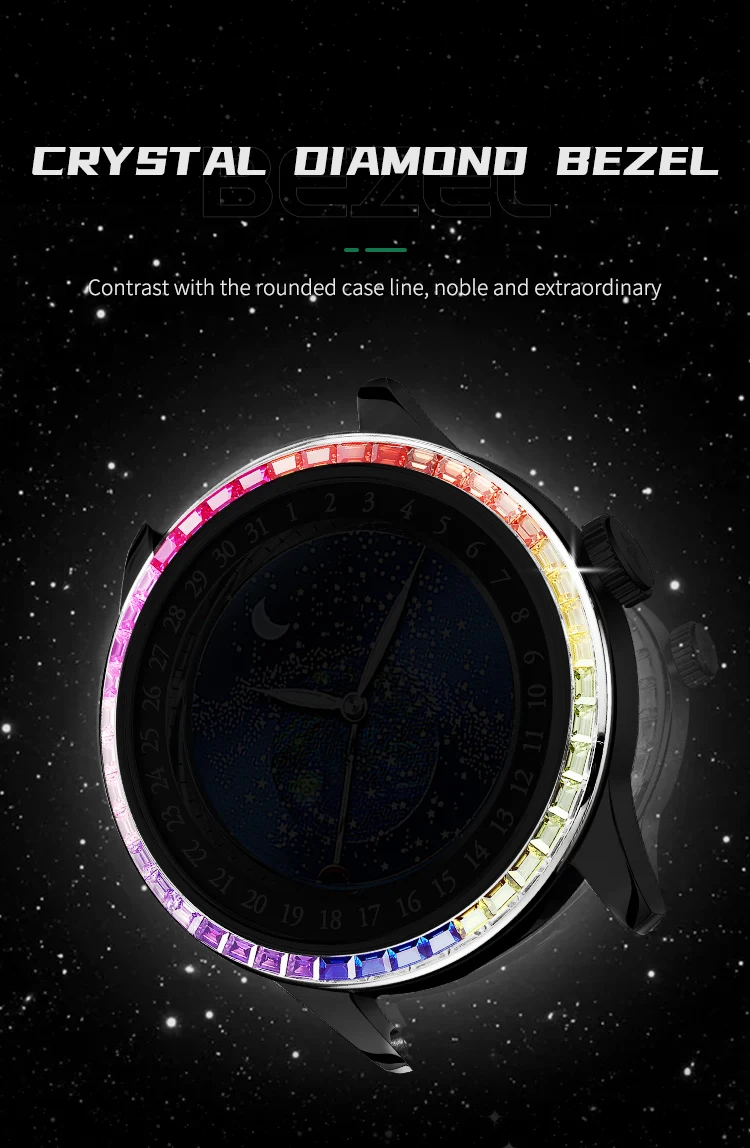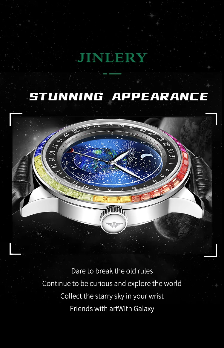 JINLERY Men Automatic Self-Wind Mechanical Watch Starry Sky Pattern Colorful Diamond Design Fashion Sapphire Crystal Wristwatch