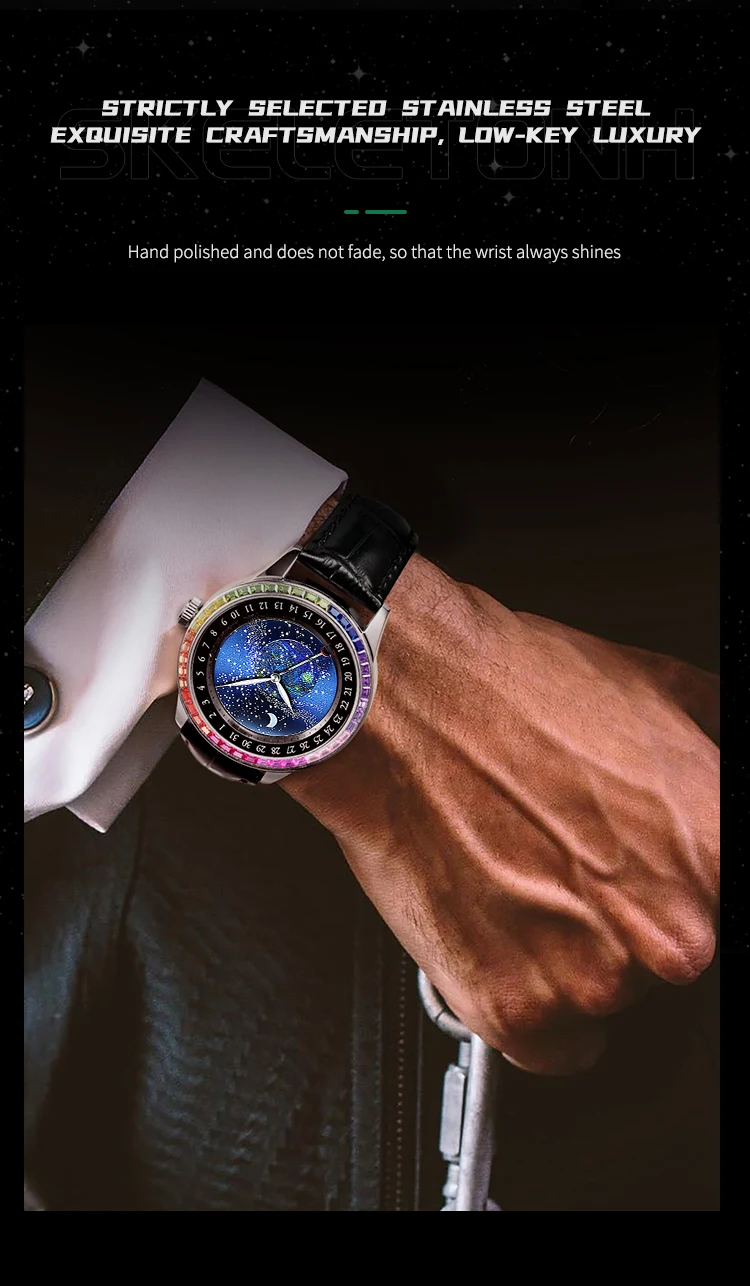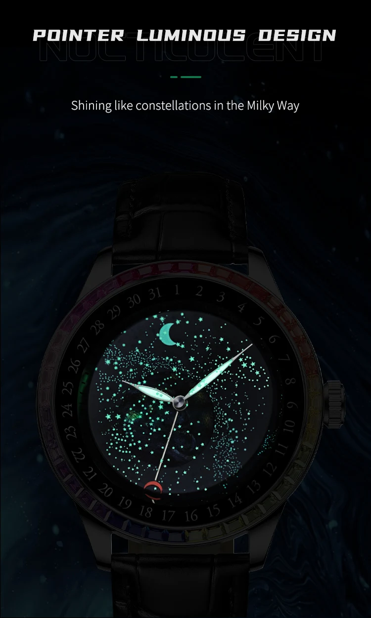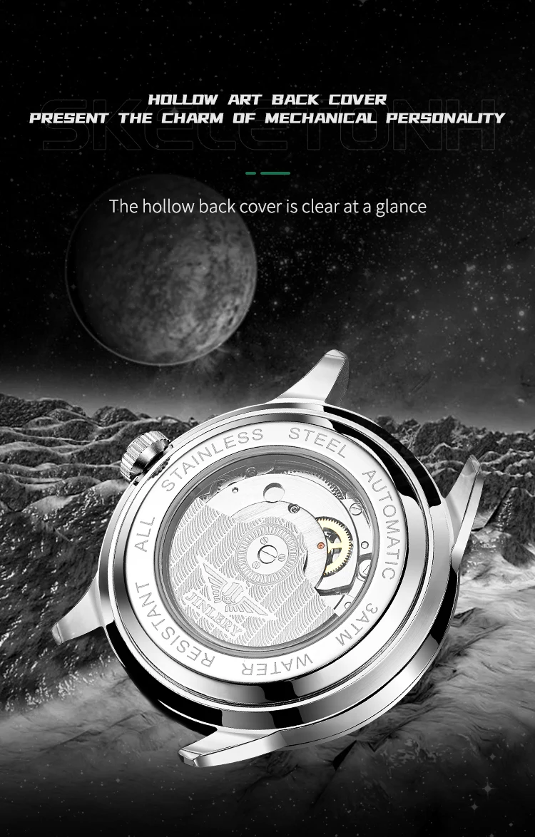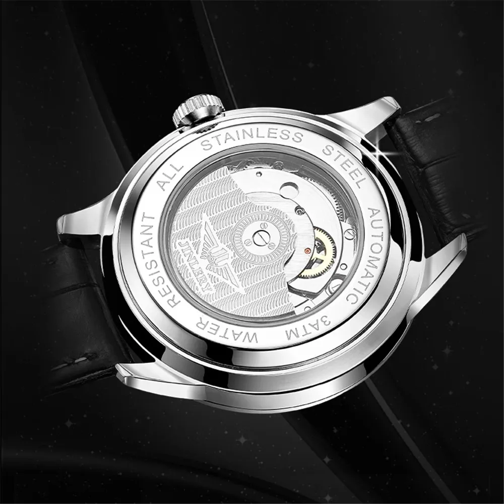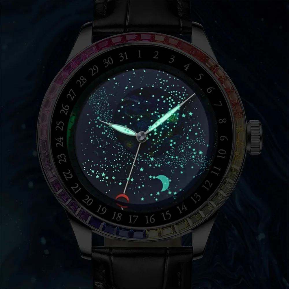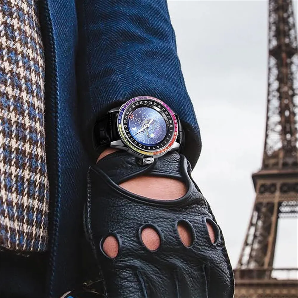 JINLERY Men Automatic Self-Wind Mechanical Watch Starry Sky Pattern Colorful Diamond Design Fashion Sapphire Crystal Wristwatch