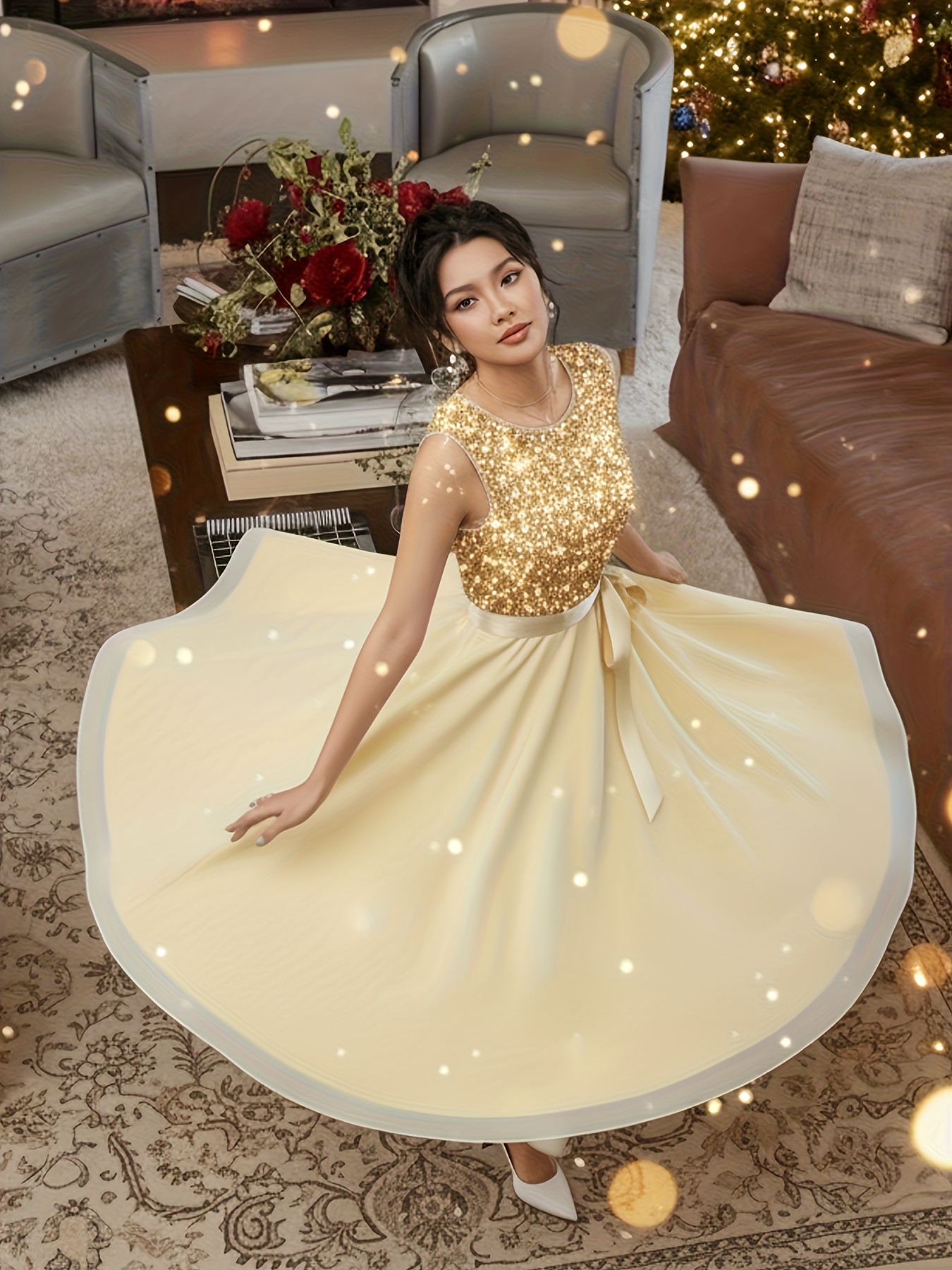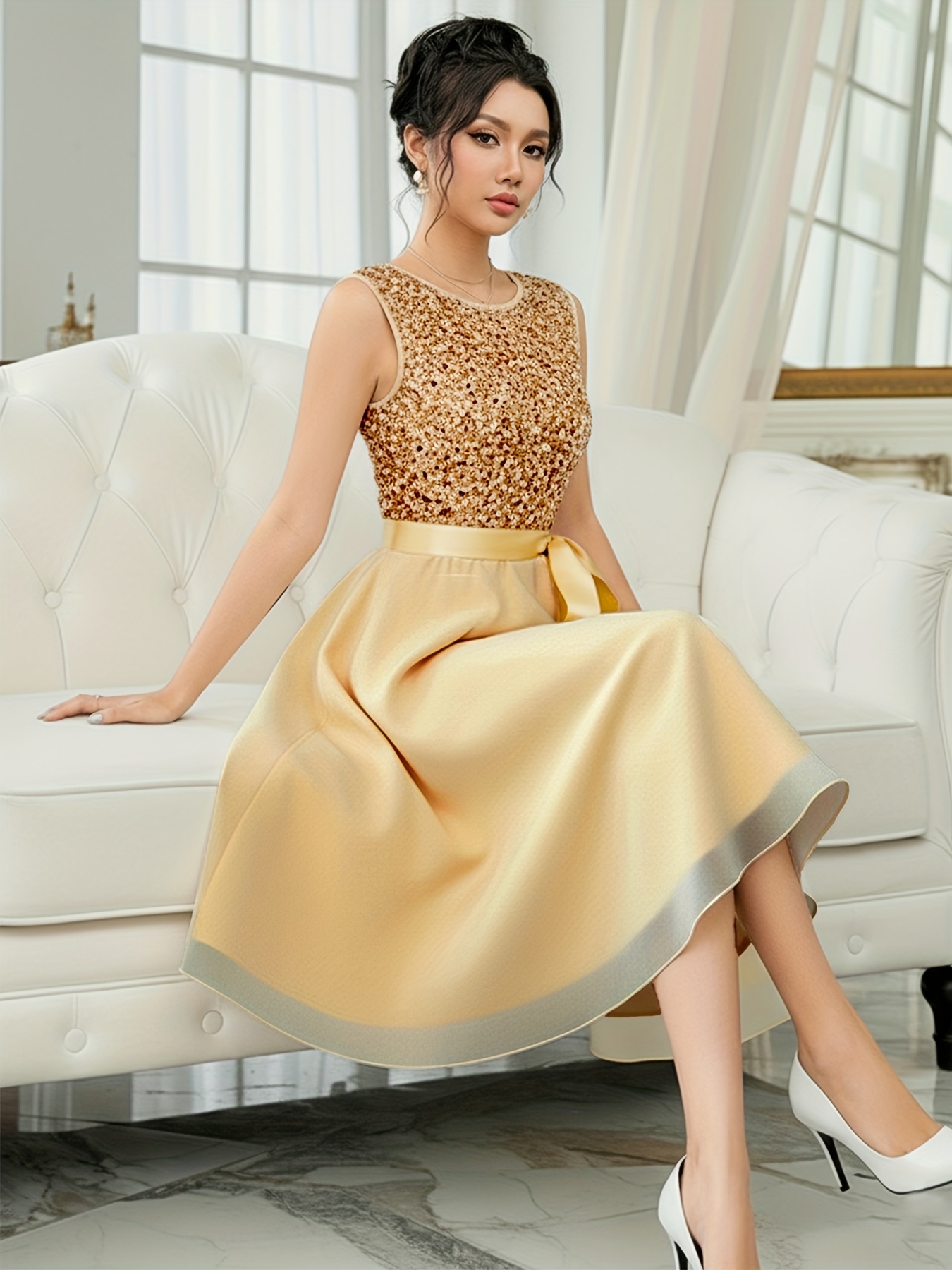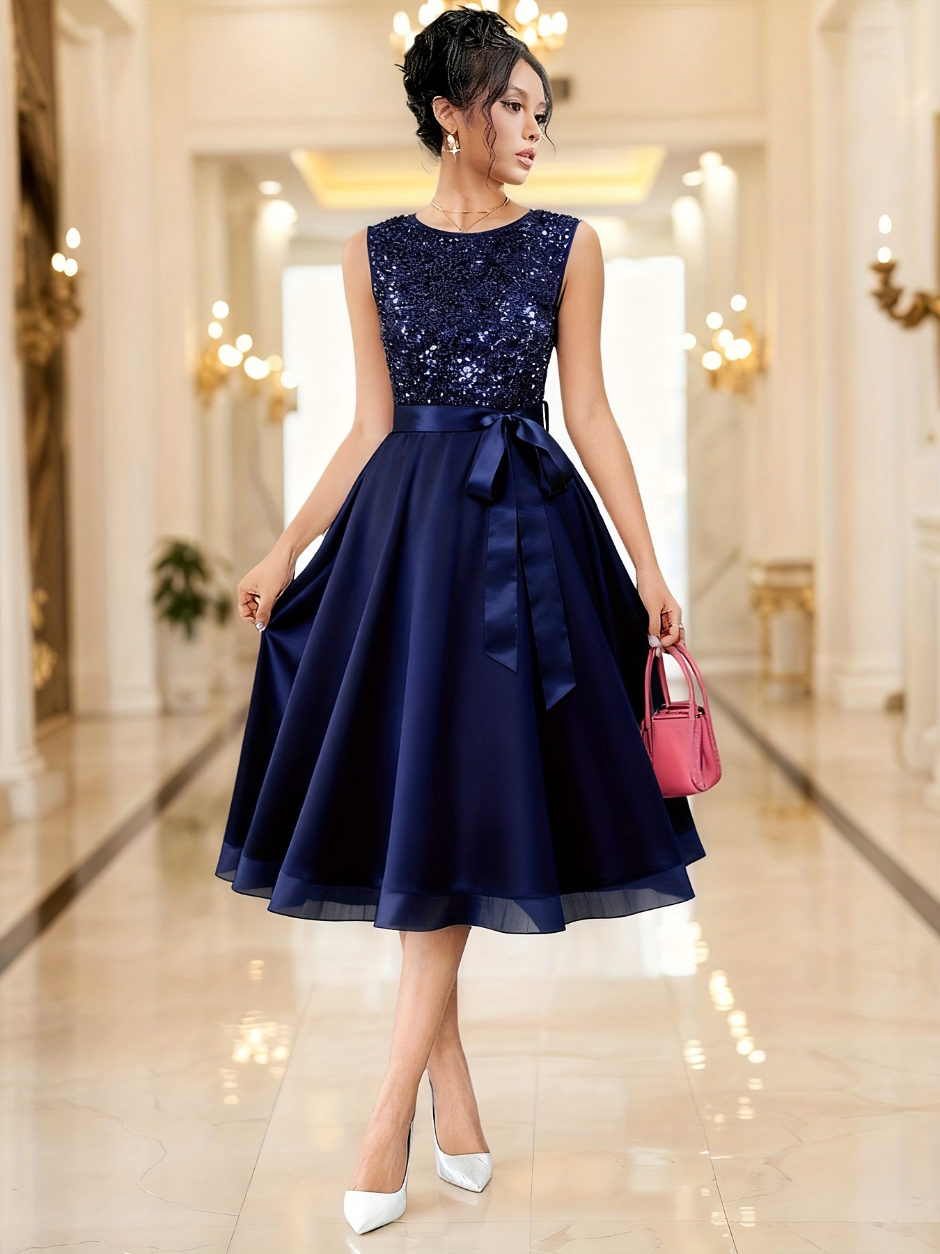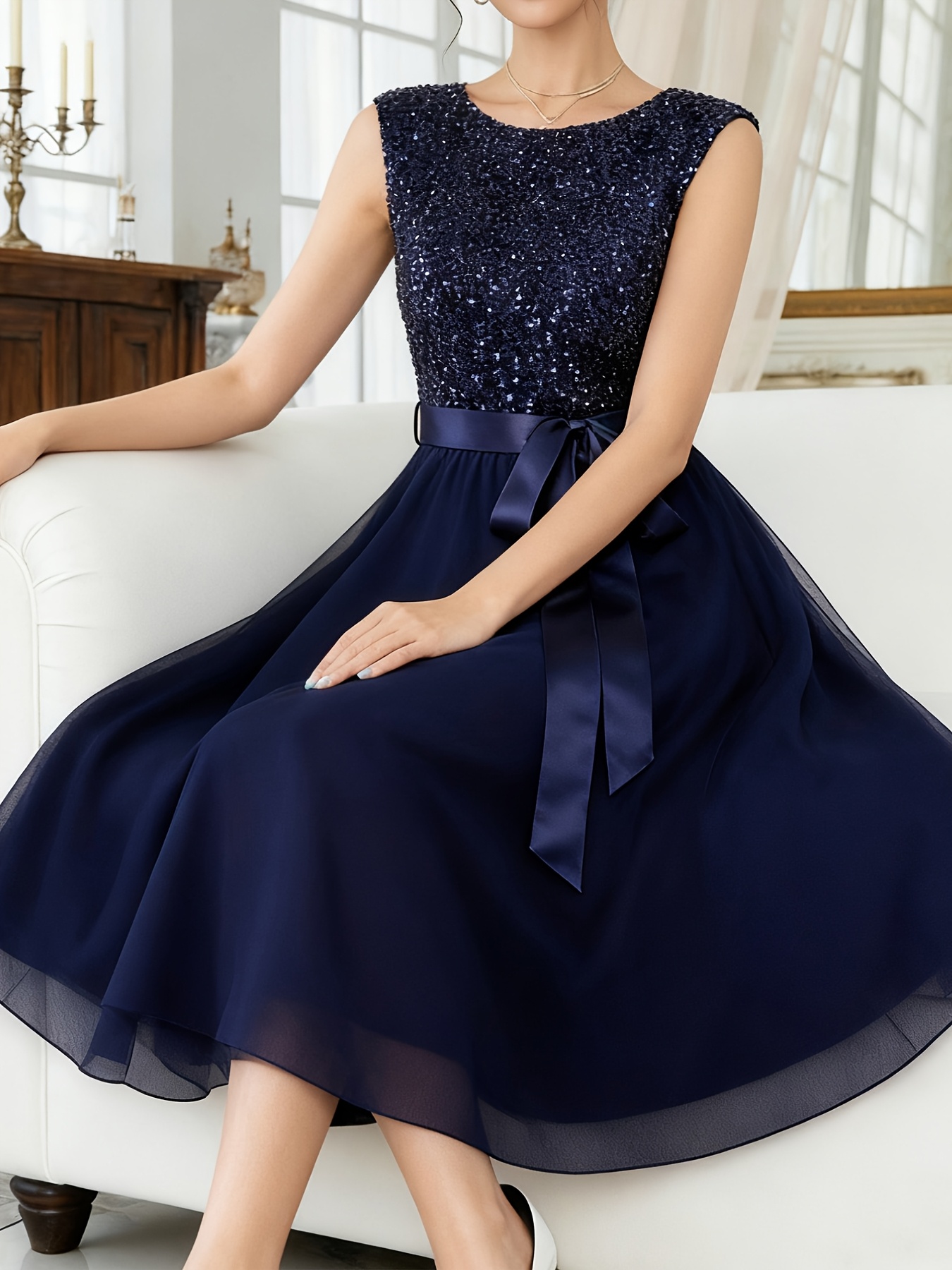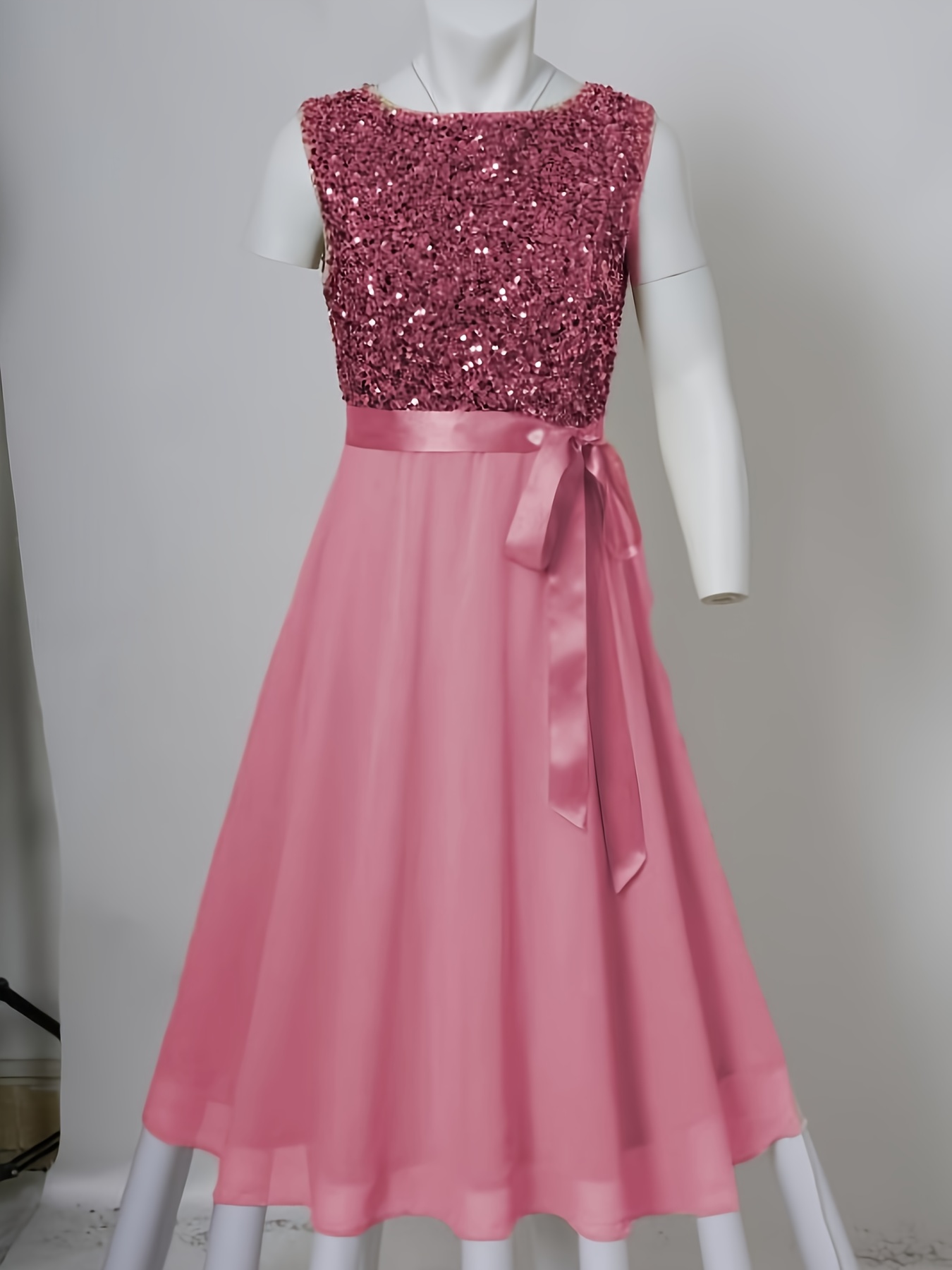 Ladies’ Sequined Velvet Dress with Chiffon Skirt | Elegant Party Dress, Bridesmaid Dress, Crew Neck, Solid Color, Contrast Sequin Details