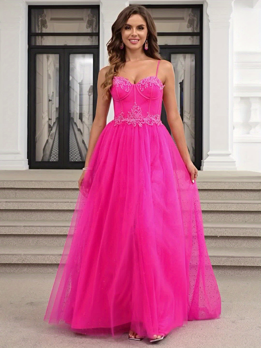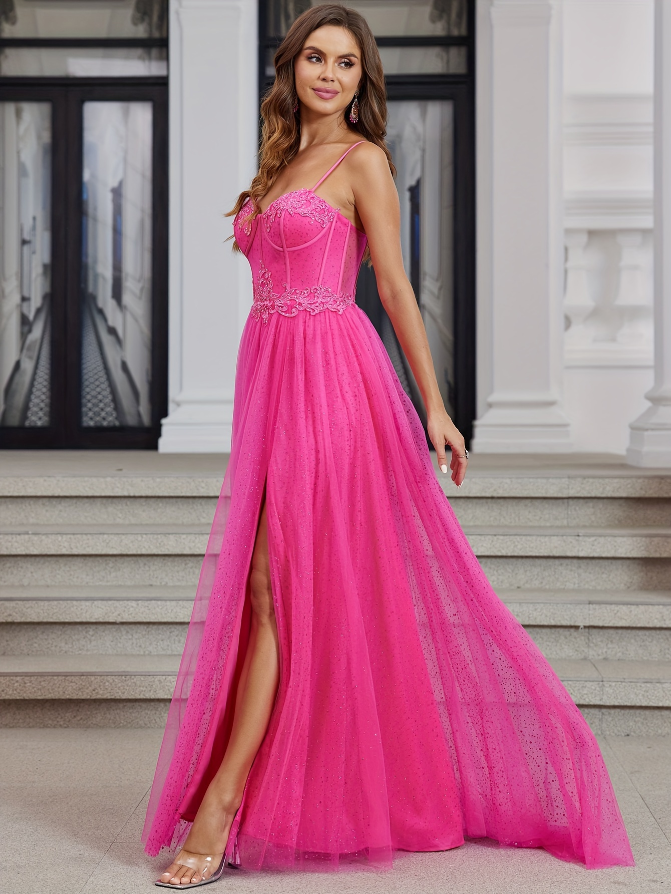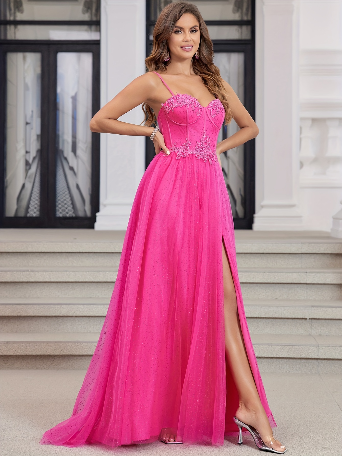 Long Sparkly Tulle Formal Lace Evening Gown with High Slit, Sweetheart, Spaghetti Strap, Floor Length for Teens with Brown Ball Gowns