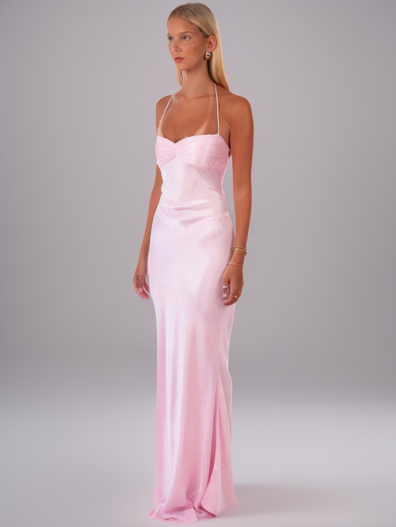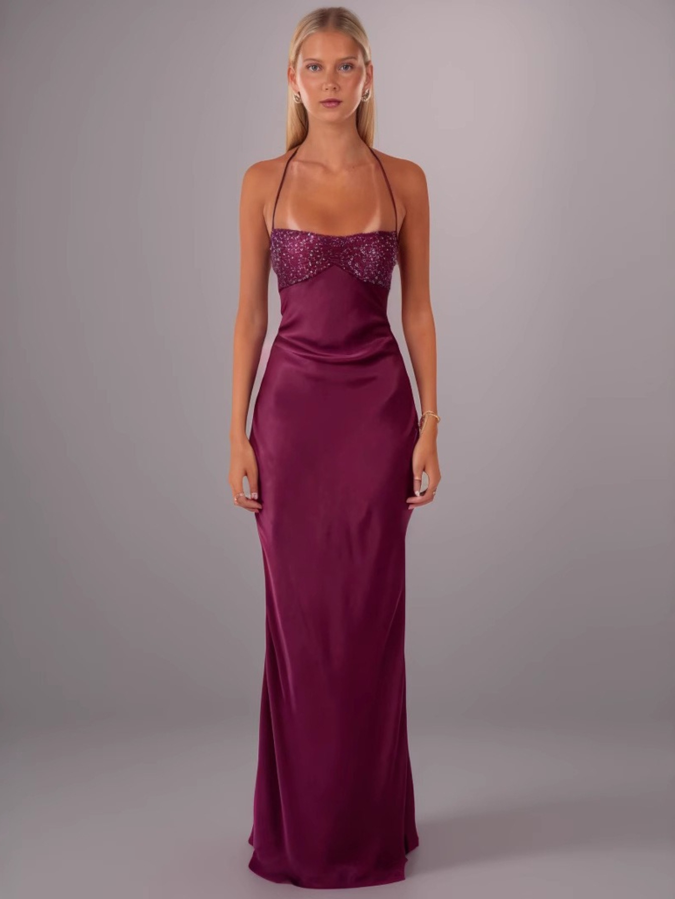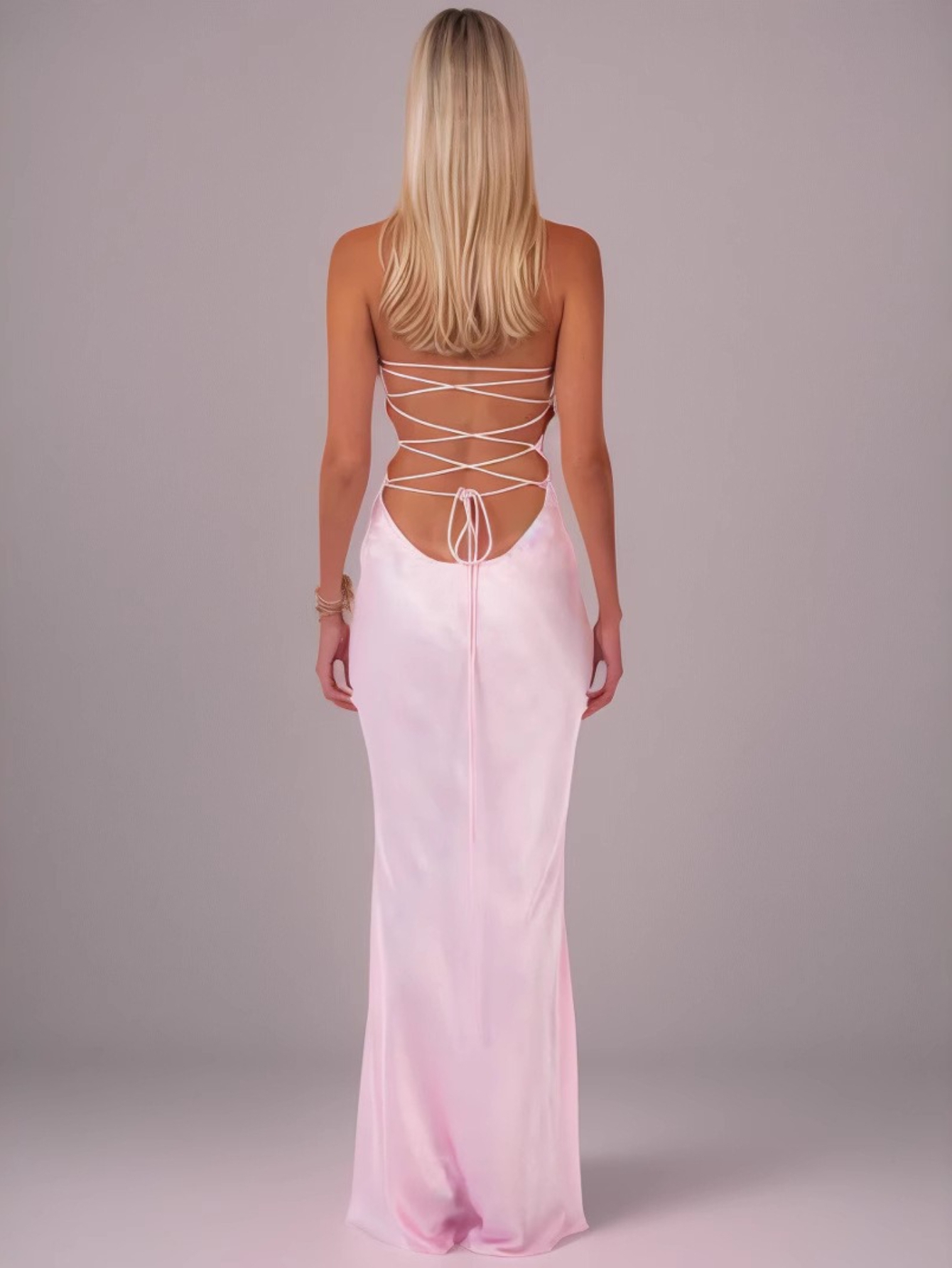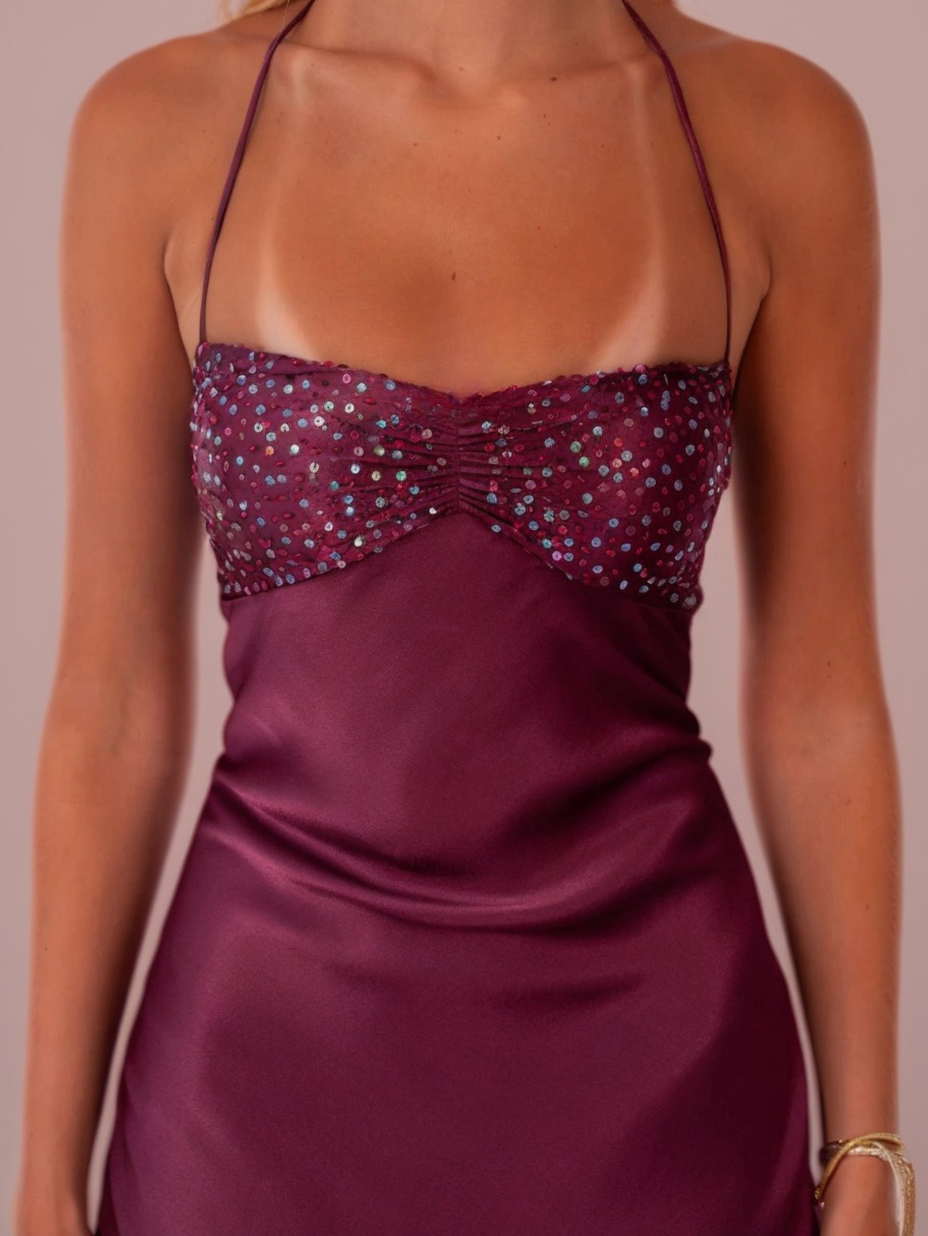 LUCKFOX Women Strapless Sequined Satin Dress | Backless Drawstring Bodycon Long Dress, Elegant Halter Neck, Perfect for Summer Party