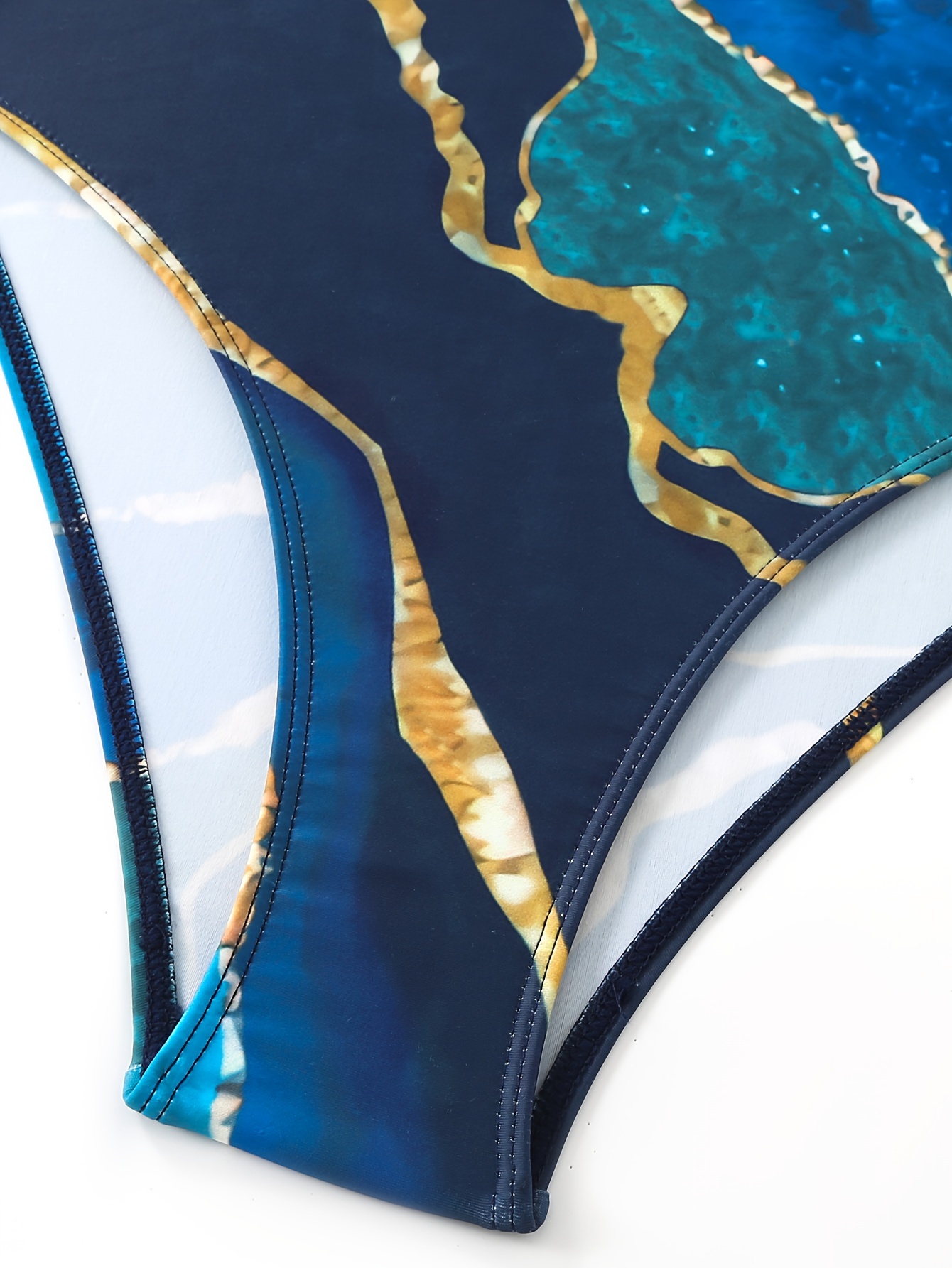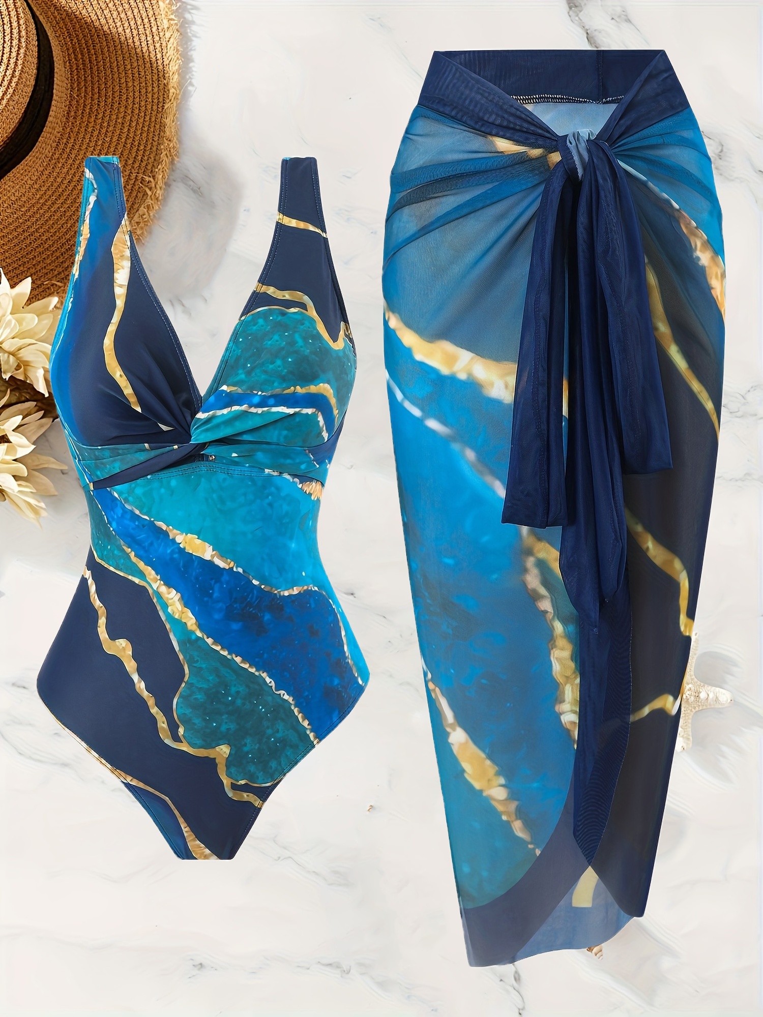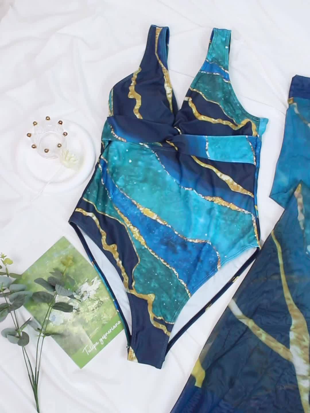 Marble Print Elegant 2 Piece Swimsuits, V Neck High Stretch One-piece Bathing-suit & Cover Up Sarong Skirt, Women’s Swimwear & Clothing