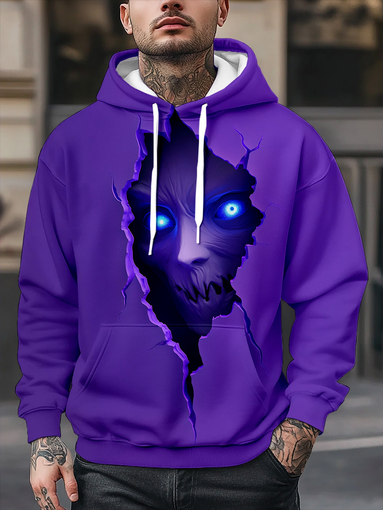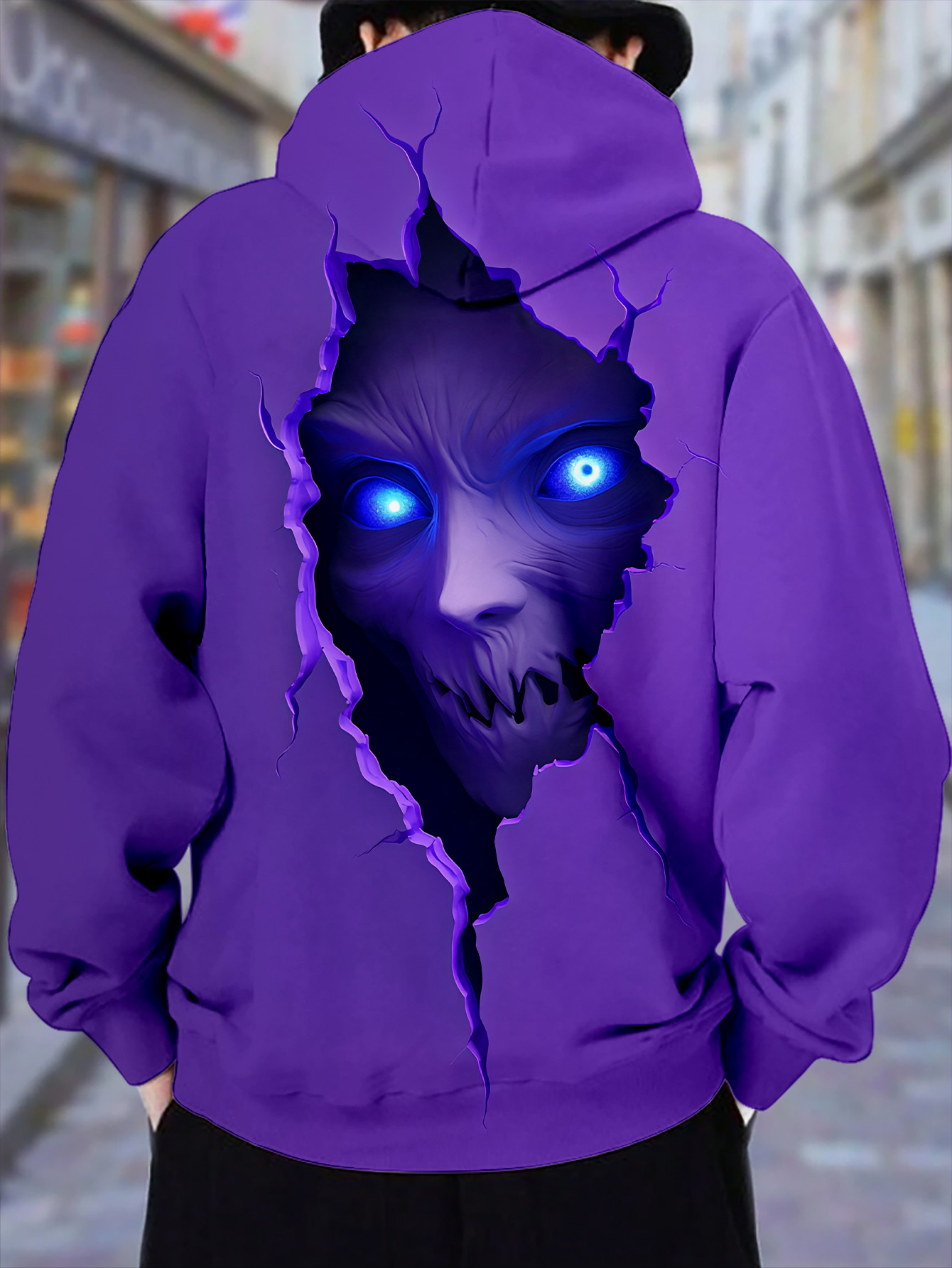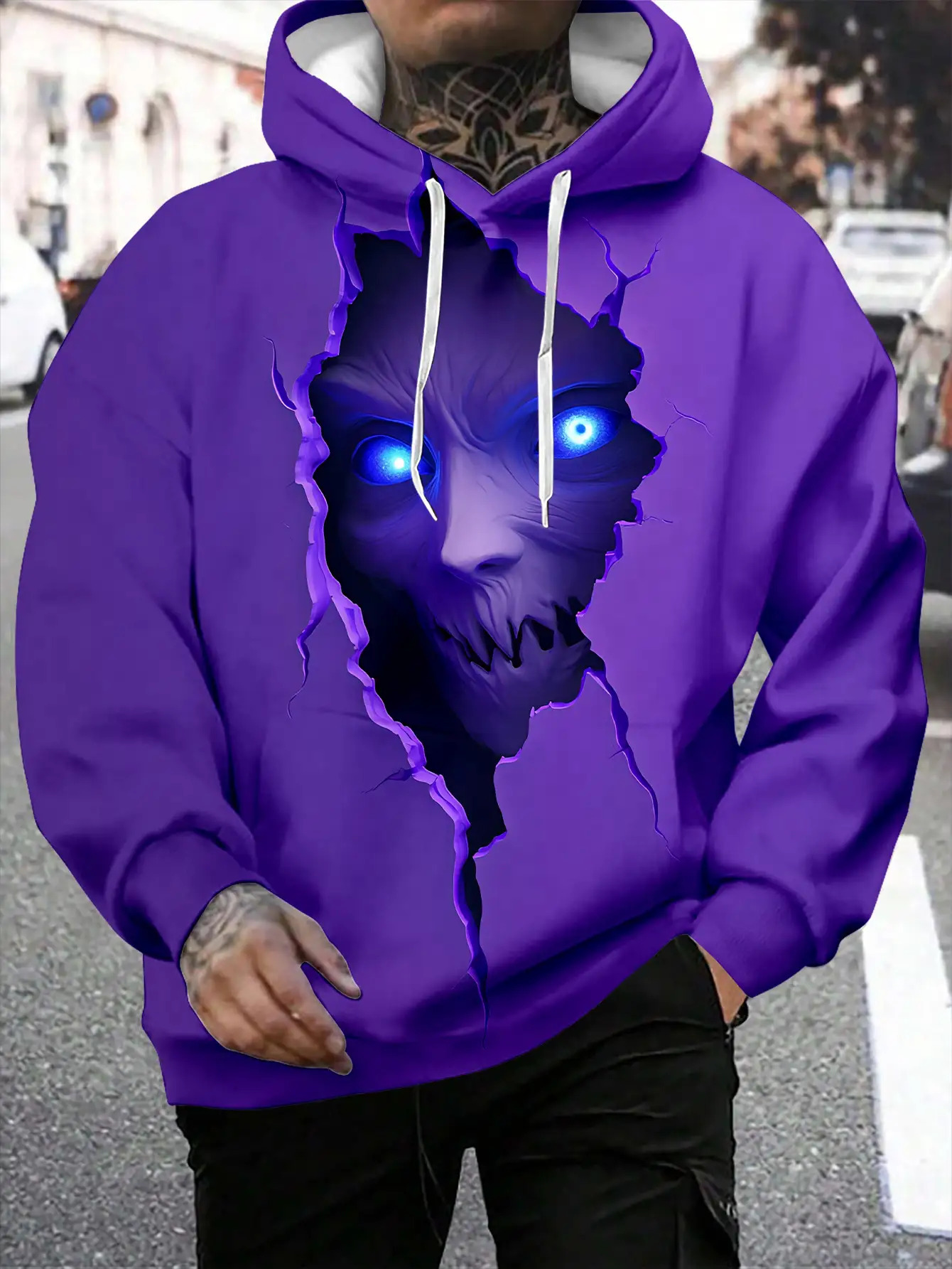 Men’s 3D Printed Sweatshirt with 3D Face Tear-Through Illusion & Glowing Blue Eyes – Purple & Black Gothic Streetwear Pullover, Long Sleeve Casual Hoodie, Machine Washable for Gaming & Casual Attire, PLUS SIZE