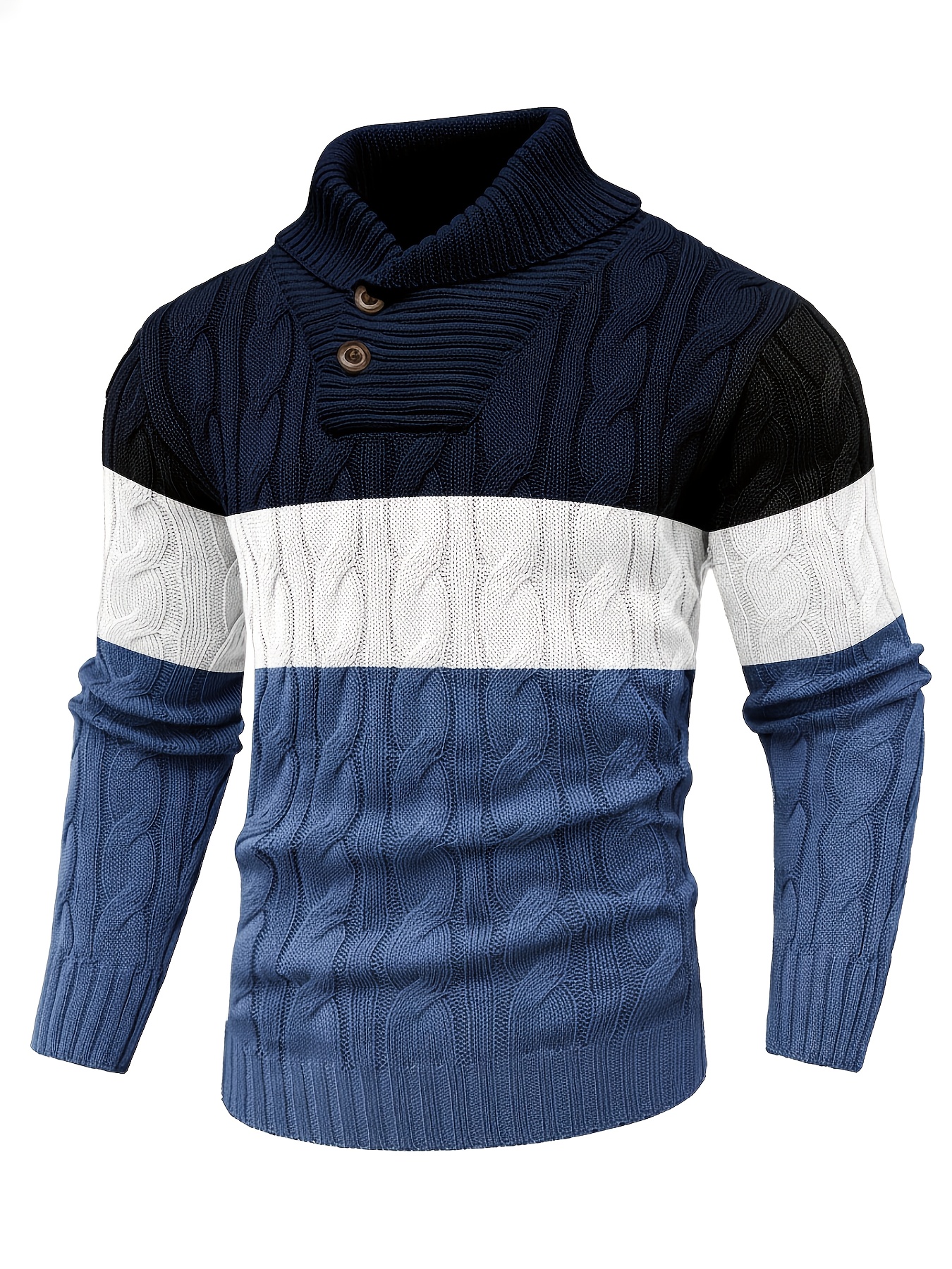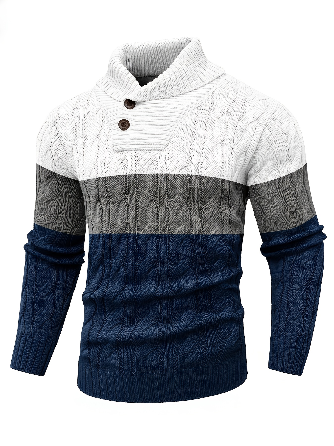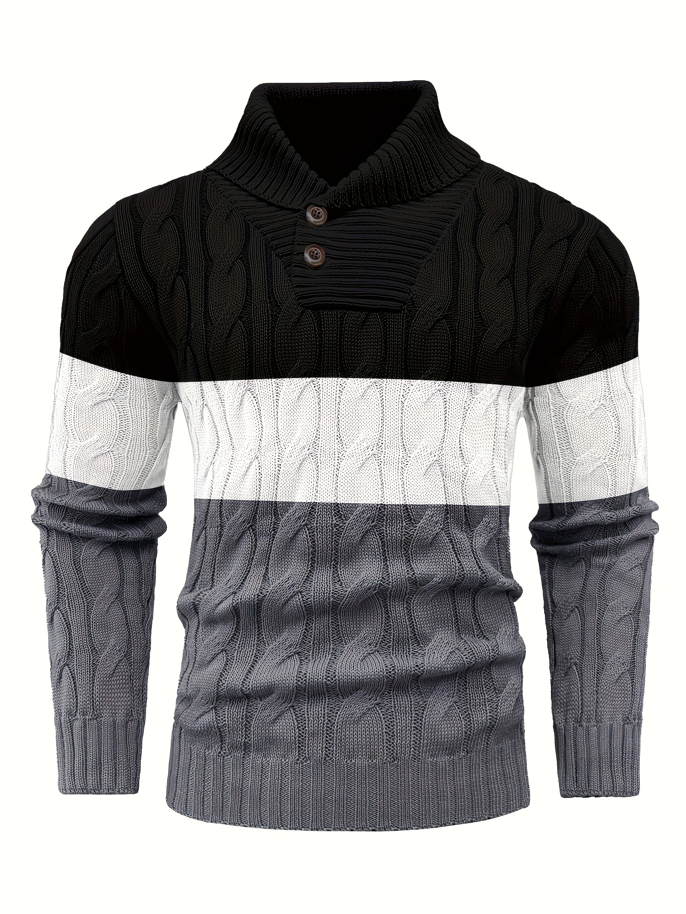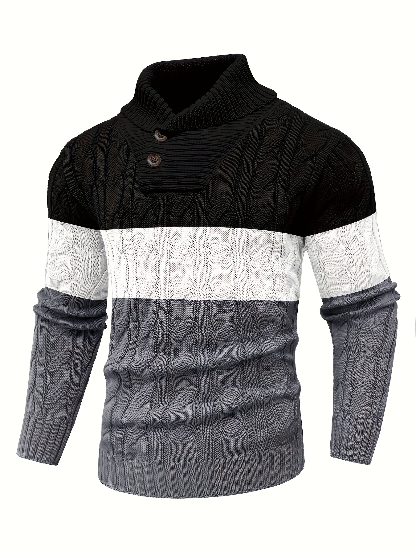 Men’s Business Contrast Color Sweater, Fashion Trendy Patchwork Large Lapel Pullover with Versatile Button Design