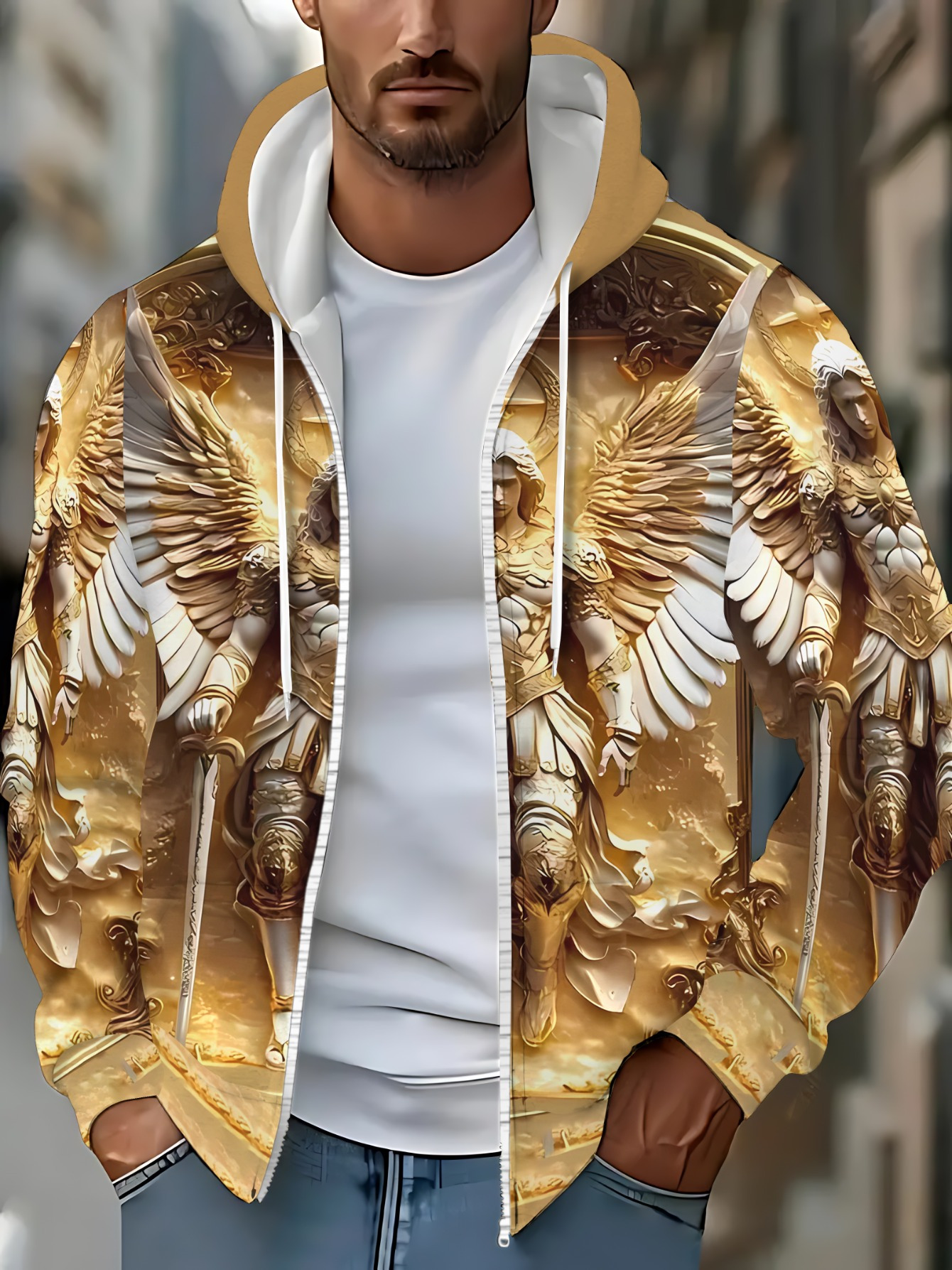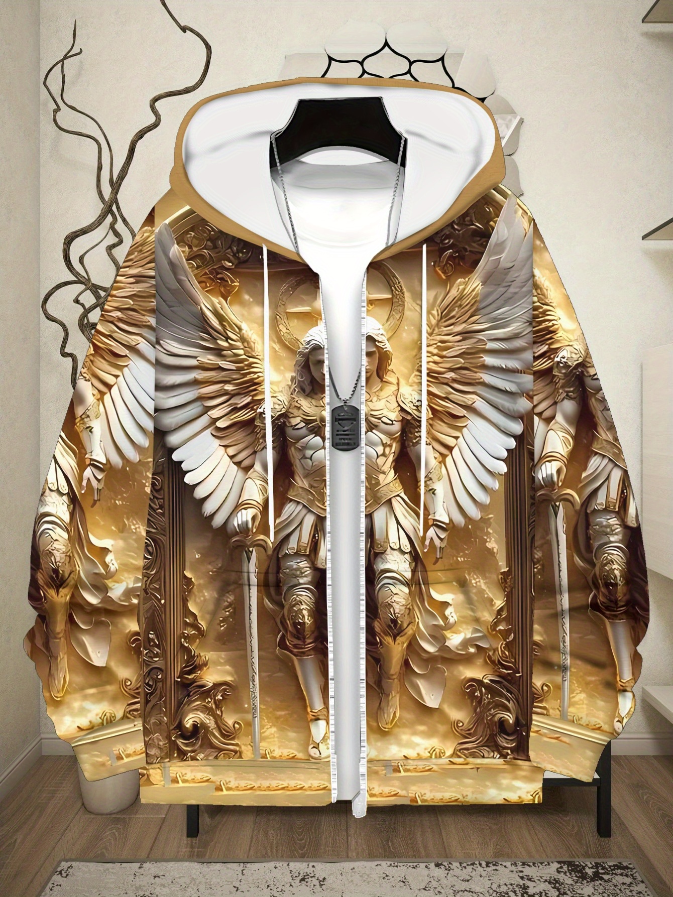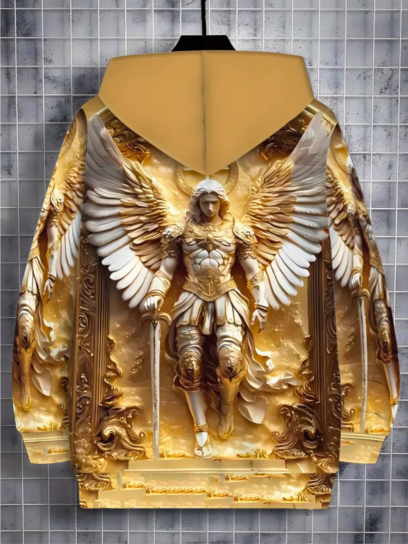 Men’s long sleeved zipper cap sportswearGolden Angel Print Hoodie for Living Room Wear, Durable Fabric, Lightweight and Comfortable, Stylish Design with Detailed Artwork, Perfect for Casual Outfits and Daily Use, Warm and Cozy Sweatshirt