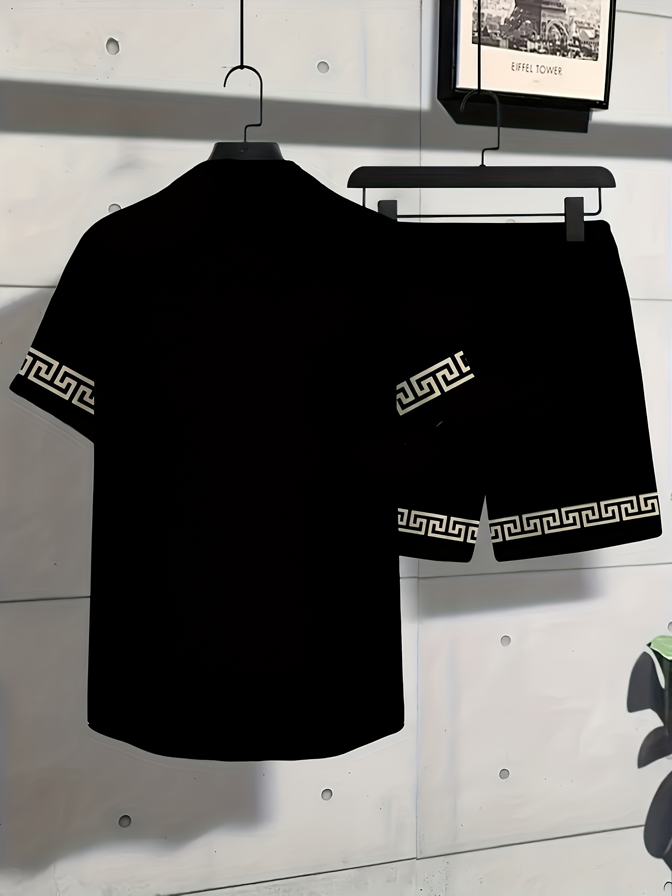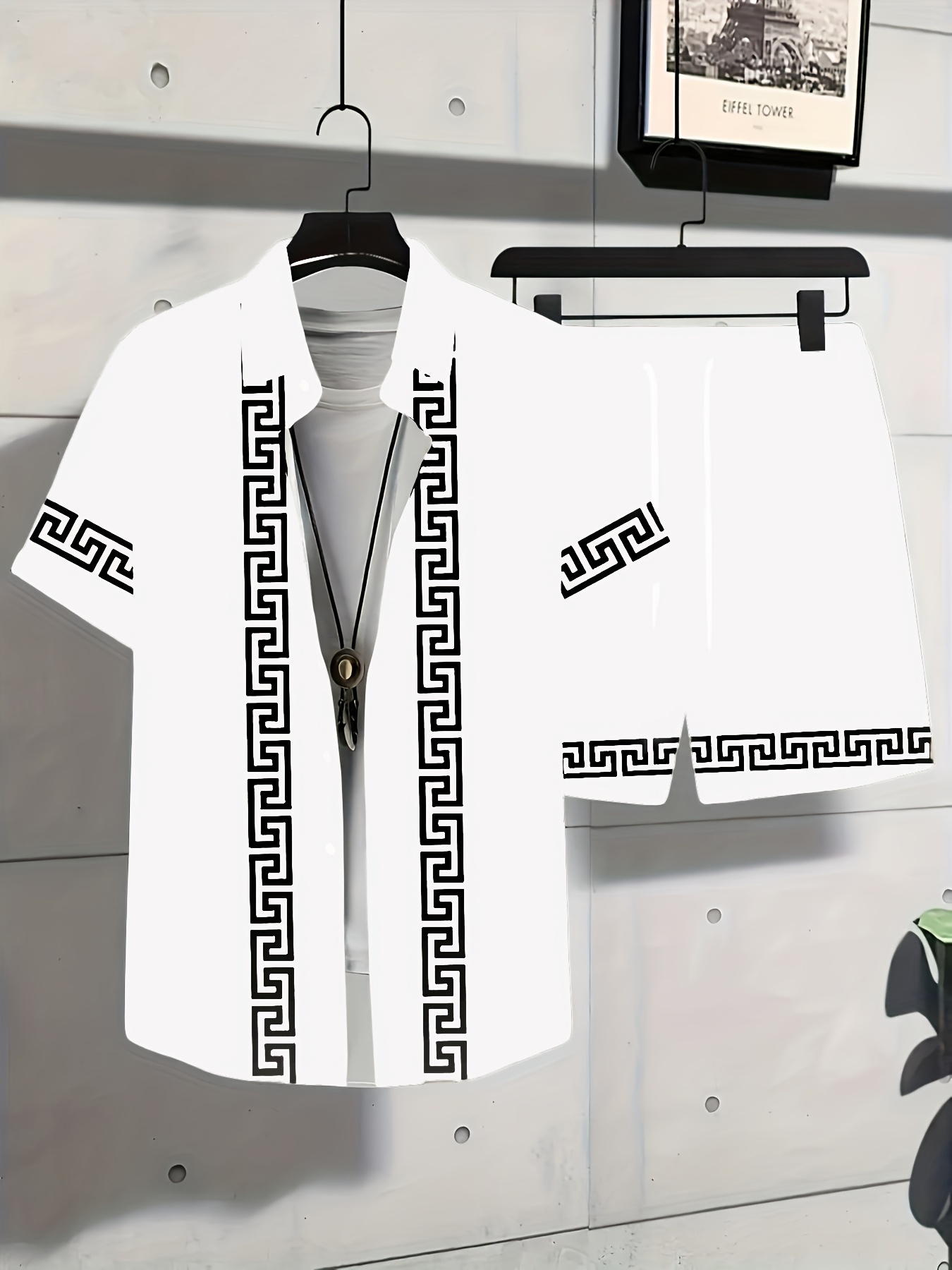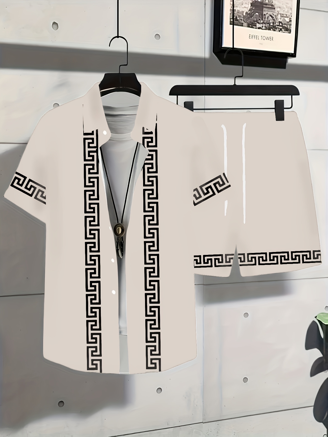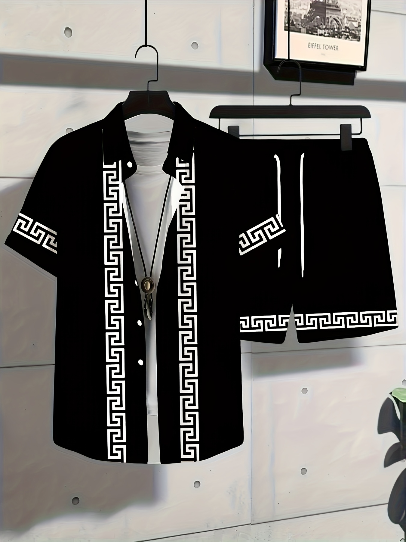 Men’S Summer Casual Short Sleeve Shirt & Shorts Set – Black with White Geometric Pattern, Button-Up Collar, Lightweight Fabric for Golf, Fishing, Beach, and Outdoor Activities, Beach Attire|Geometric Pattern Shirt|Slight Stretch Fabric