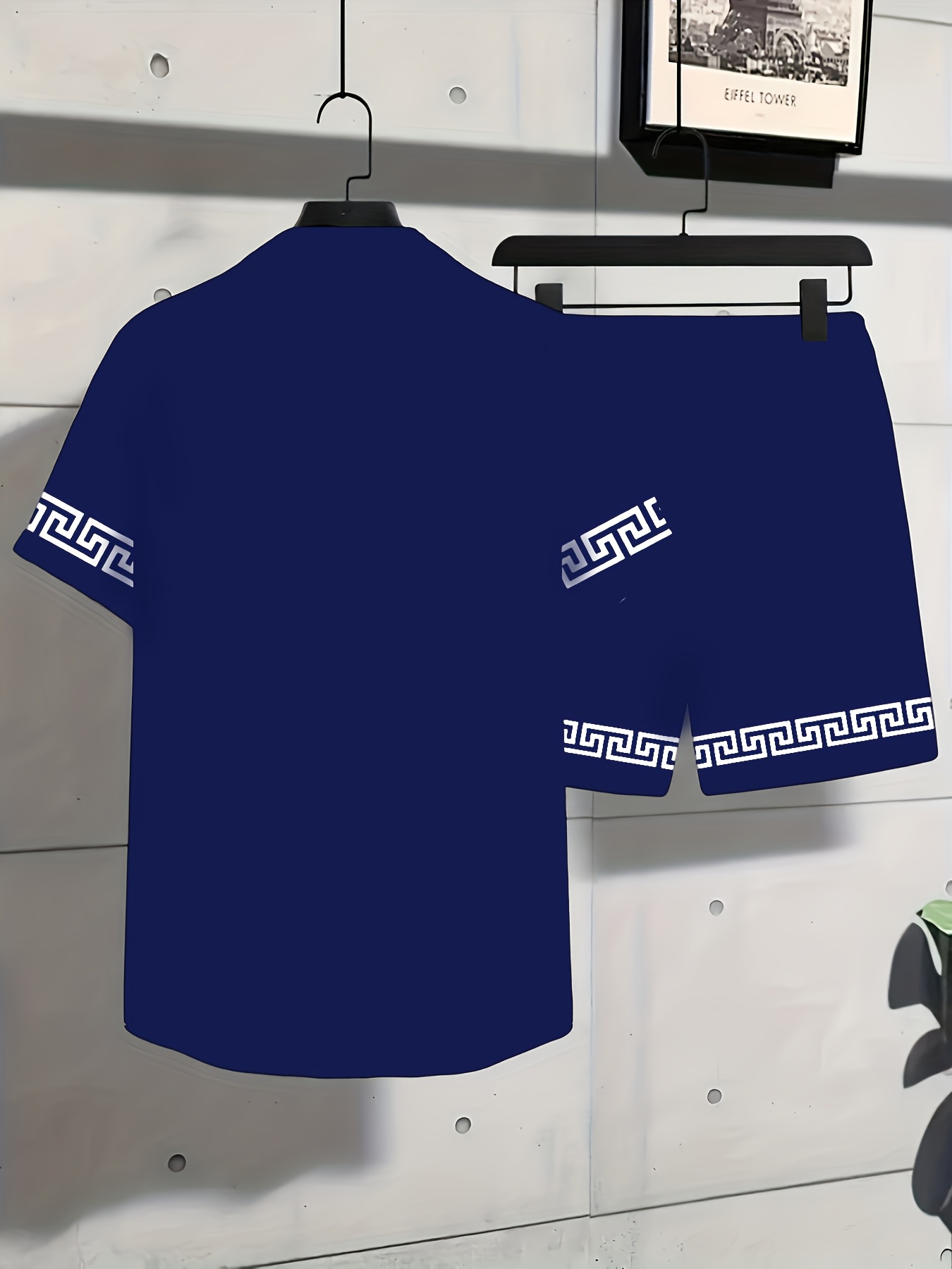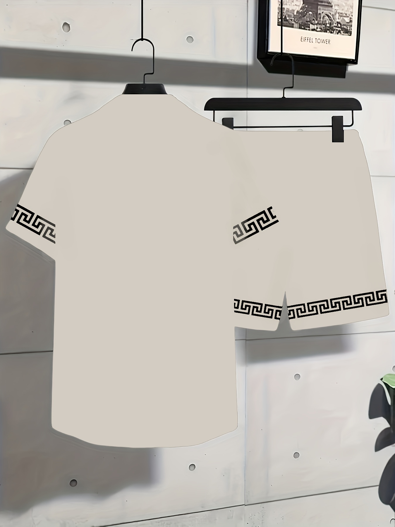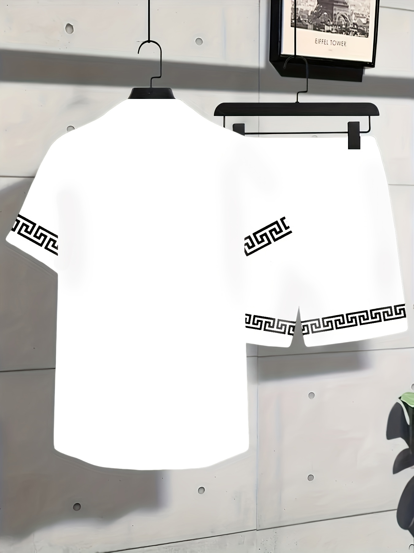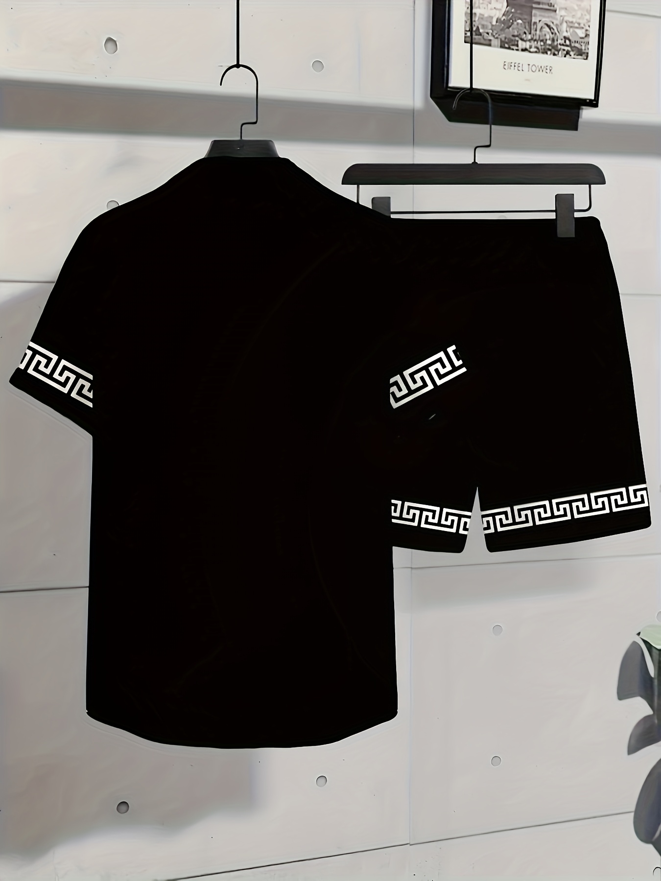 Men’S Summer Casual Short Sleeve Shirt & Shorts Set – Black with White Geometric Pattern, Button-Up Collar, Lightweight Fabric for Golf, Fishing, Beach, and Outdoor Activities, Beach Attire|Geometric Pattern Shirt|Slight Stretch Fabric