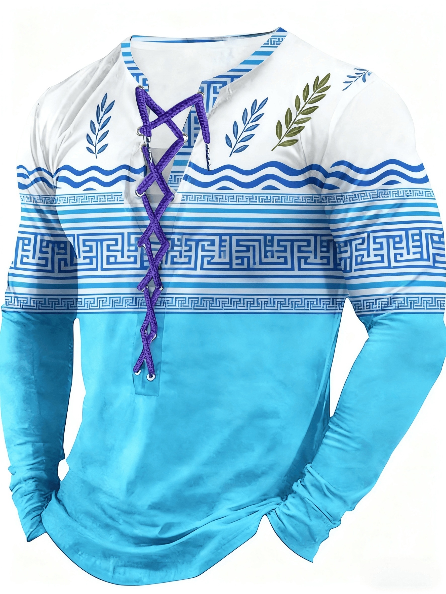 Men’S Vintage Casual Long Sleeve Crew Neck Henley Shirt | Geometric-pattern, Slight Stretch Fabric, Drawstring Detail, All-season Fit