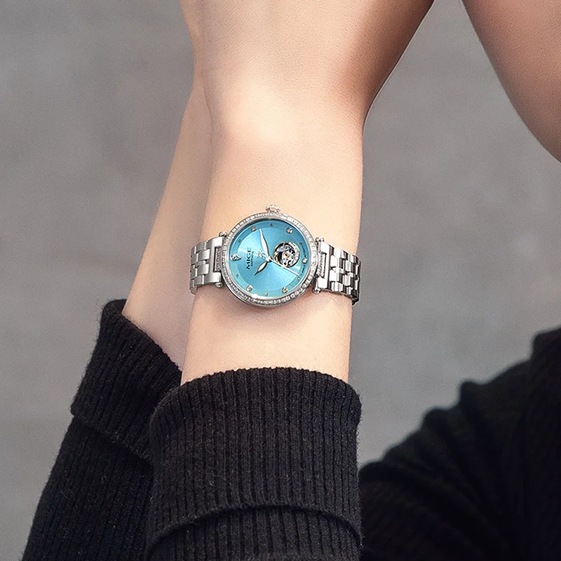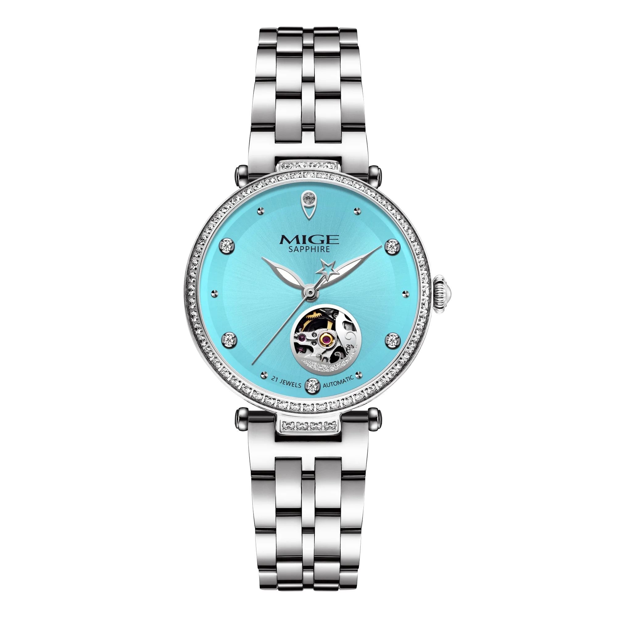 MIGE brand Tourbillon blue dial business stainless steel mechanical watch women japan movement waterproof automatic Lady watches
