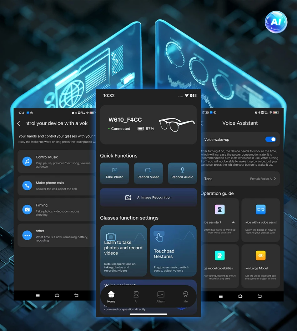 Voice wake-up with AI, object recognition through AI photography, intelligent question-and-answer interaction with AI, AI-powered translation, photo capture, video recording, and audio recording.