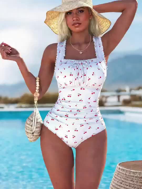 One-Piece Triangle Waist-Cinching Bottoms, Solid Color Cherry Print Swimsuit with Adjustable Straps