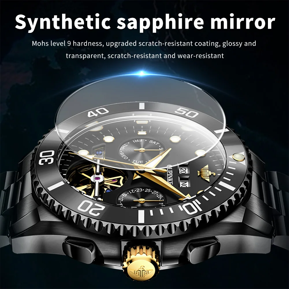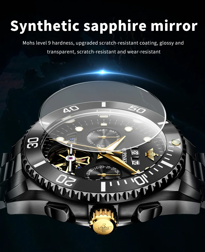 – Synthetic Sapphire Mirror: Mohs level 9 hardness, upgraded anti-scratch coating, dripping into beads, making time clearer.
