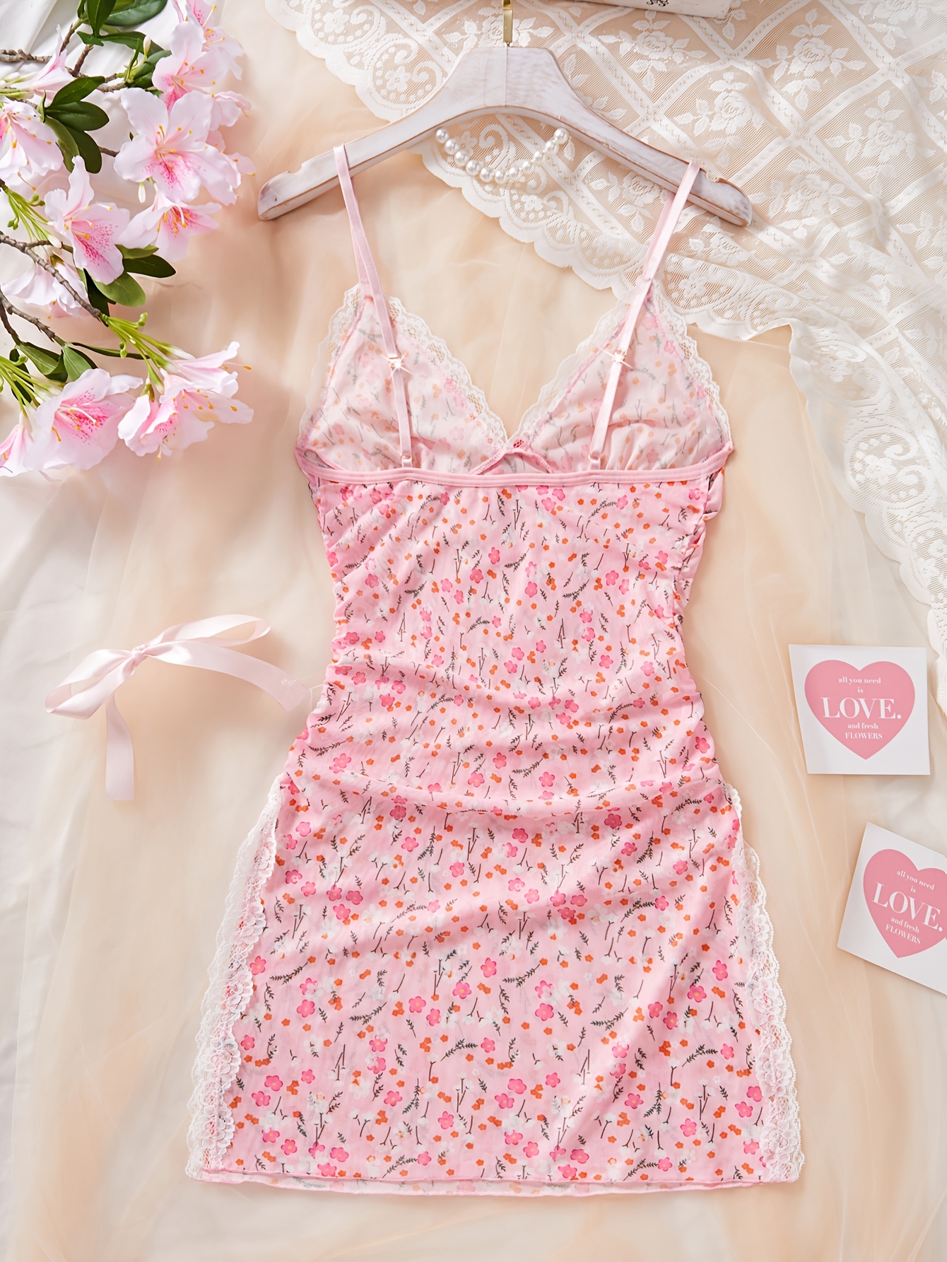 Pink Floral Print Babydoll Lingerie Dress | Sweet and Sexy V-Neck with Spaghetti Straps and Bow Accent, Lace Trim, Ideal for Romantic Boudoir or Intimate Loungewear