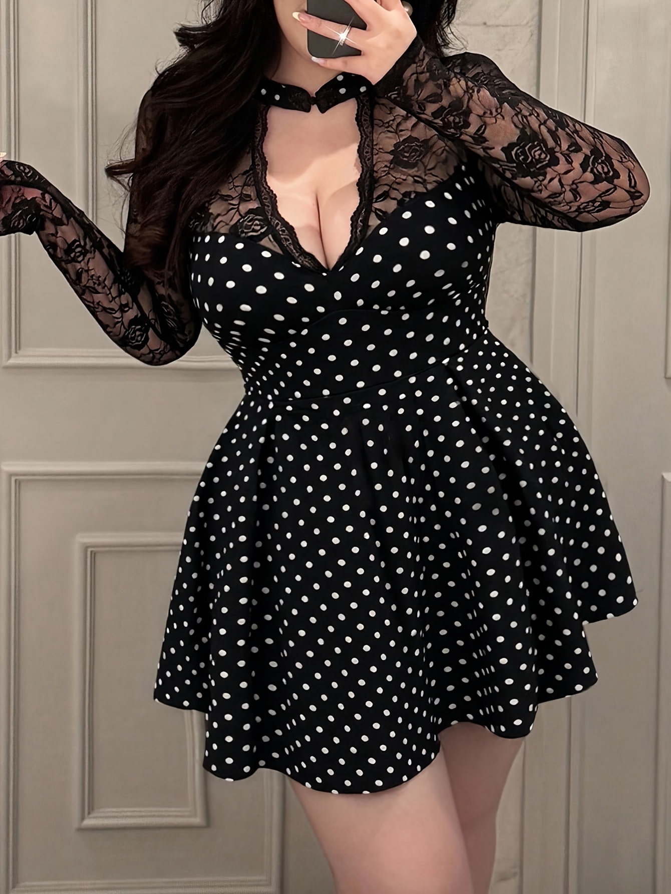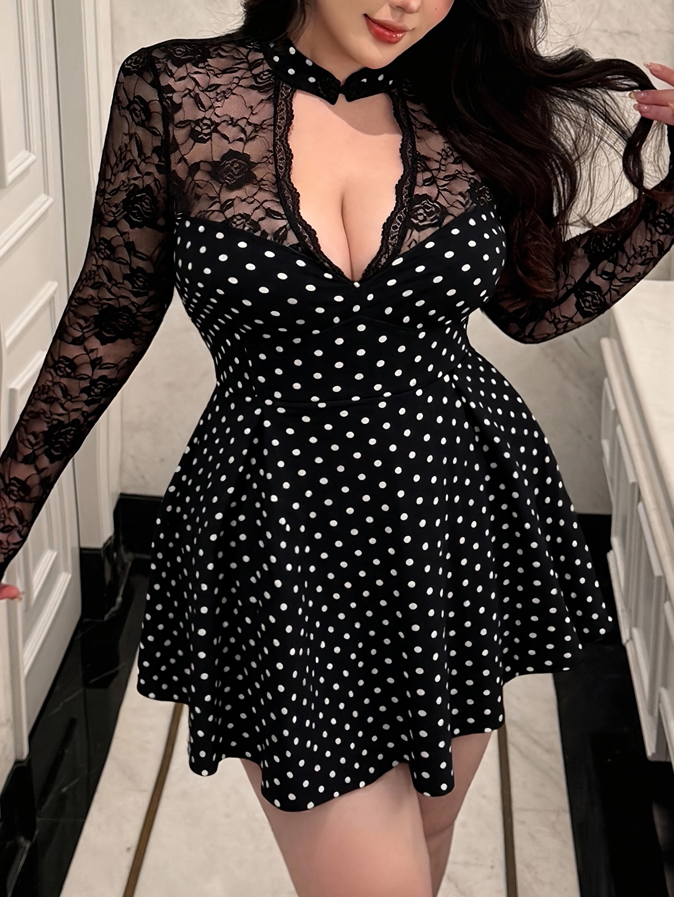 Plus Size – Elegant Lace-Trimmed Dress | V-neck, Fitted, Contrast Lace Details, All-season, Slight Stretch Fabric