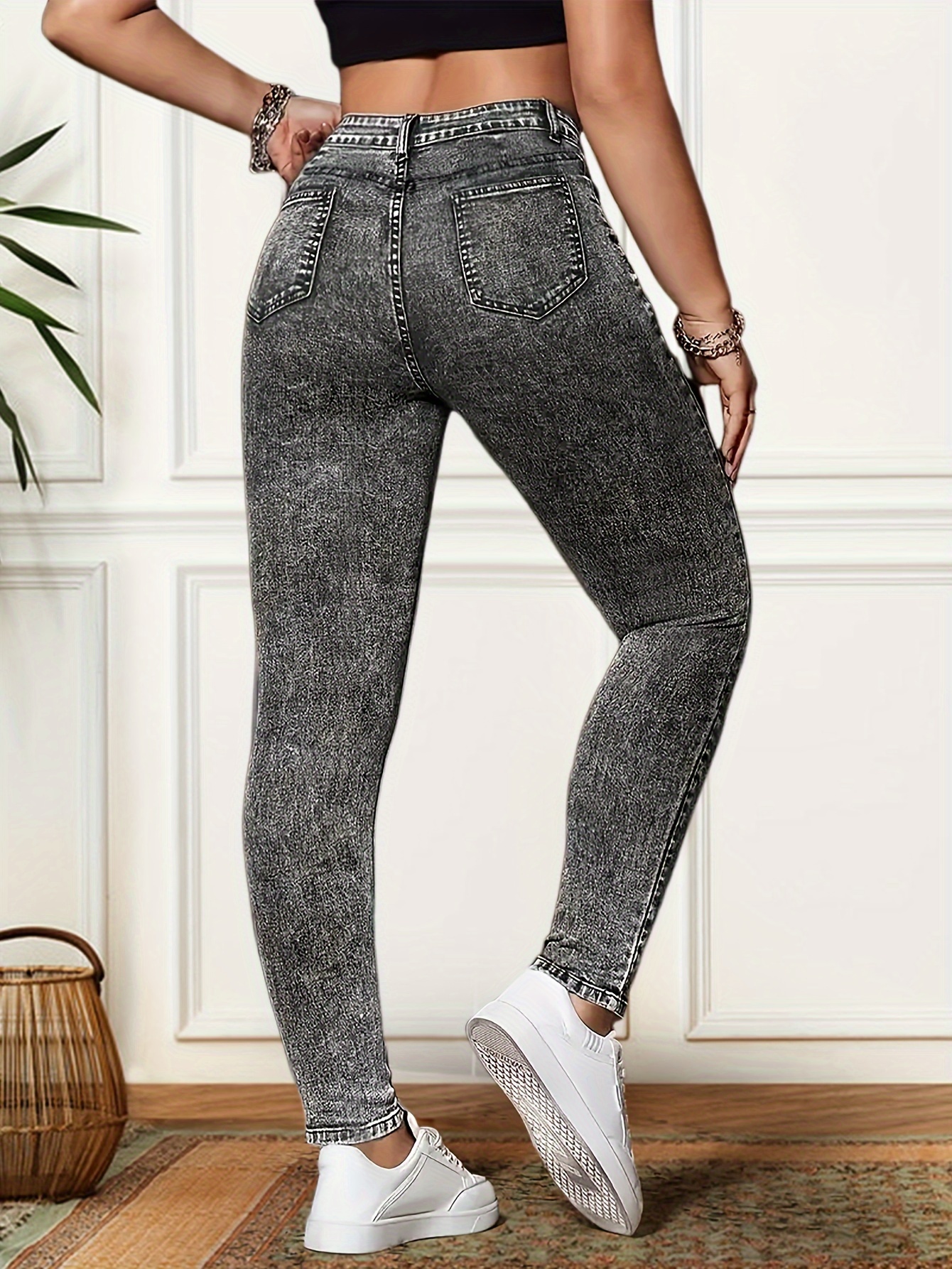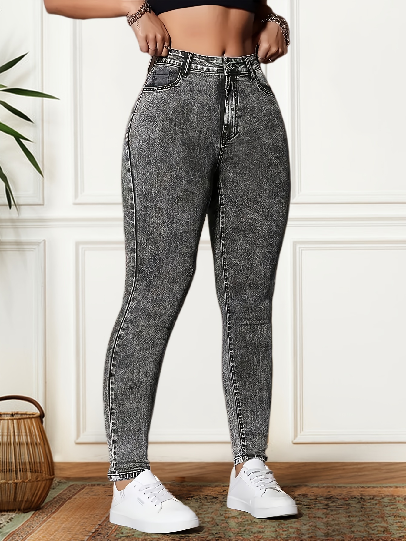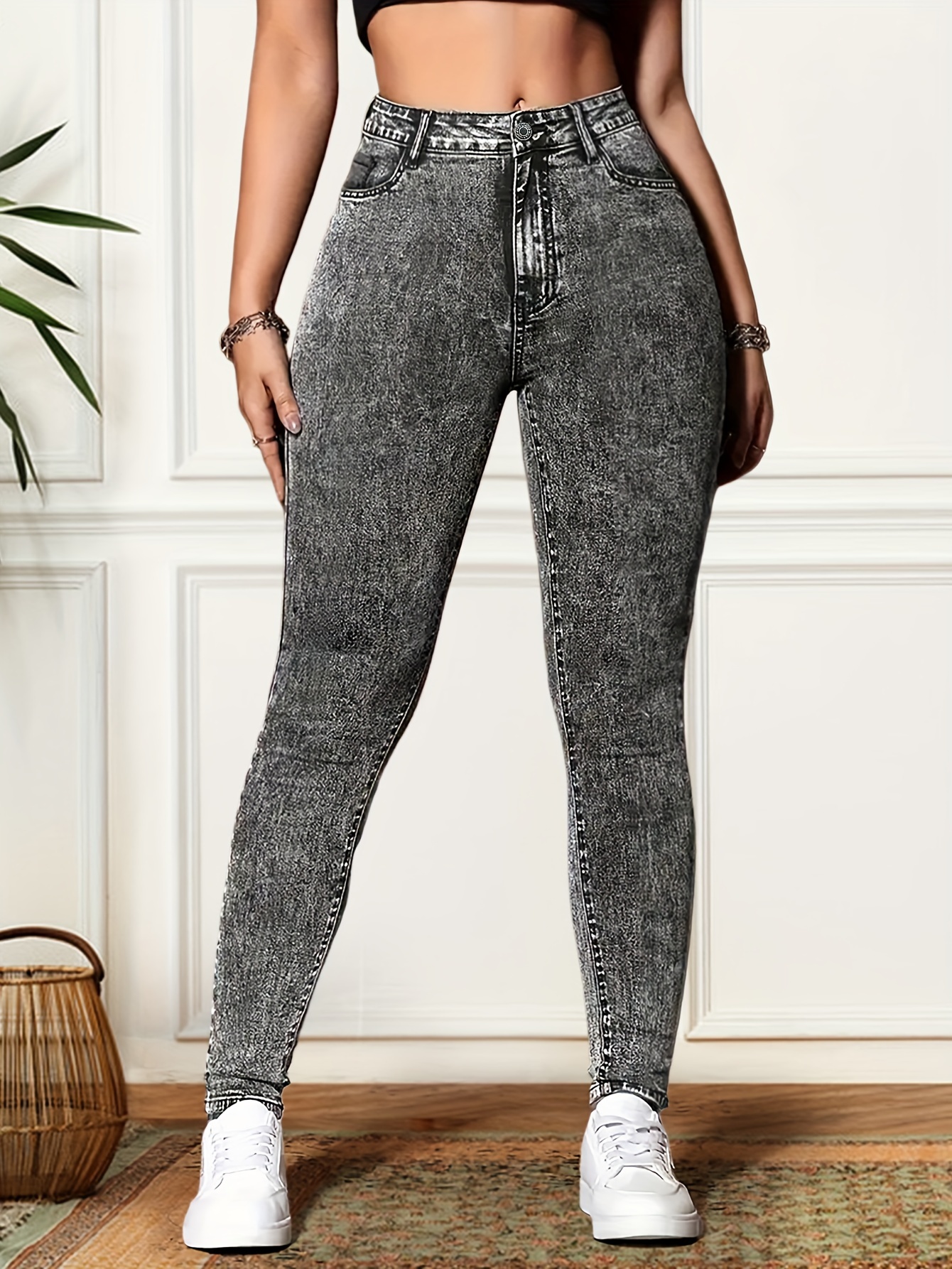 Plus Size Women’S High-Waisted Slim-Fit Stretch Skinny Pants – Gray Solid Color with Button Detail, All-Season Elegant Tummy Control Leggings for Casual & Formal Wear, High Waist Pants, Versatile Clothing, Stylish Footwear, Snug Fit