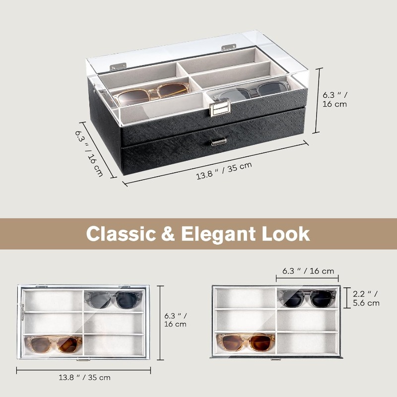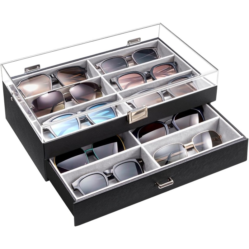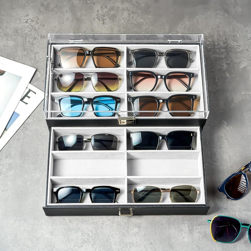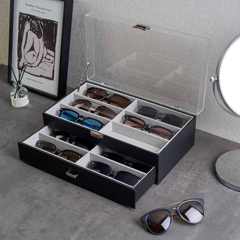 ProCase 12 Slots Acrylic Clear Top Organizer 2 Layers Eyeglasses Case Multi Pairs Storage Eyewear Display Holder with Transparent Lid and Drawer -Black