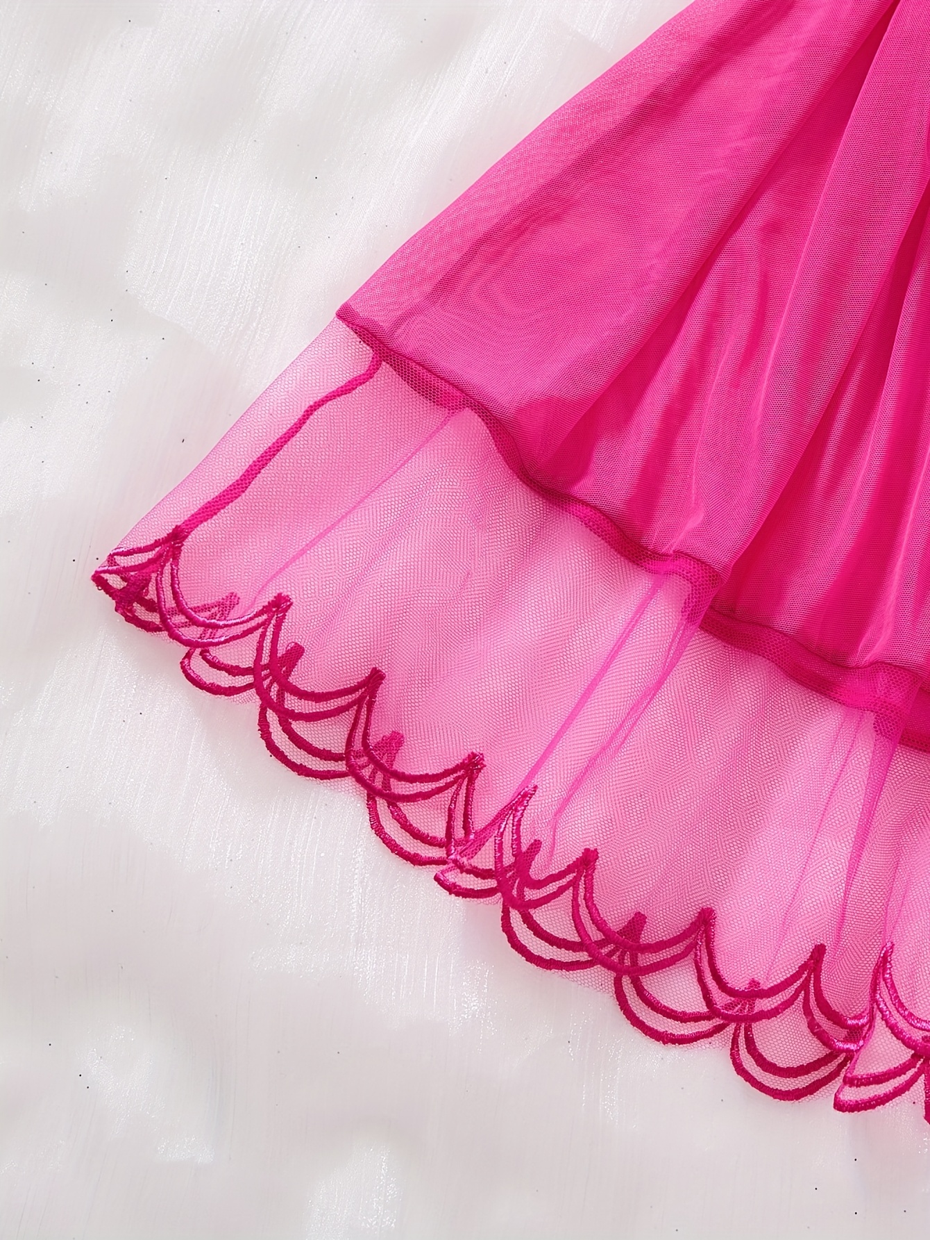 Rose Pink Sexy Short Lingerie Set for Women, Thin Mesh Sleeveless Nightgown with Deep V Neck, Lace Embroidery, A-Line Skirt, No Steel Wire, Drop Waist, Medium Support, Solid Color, Thong Panties, Elegant and Seductive Sleepwear