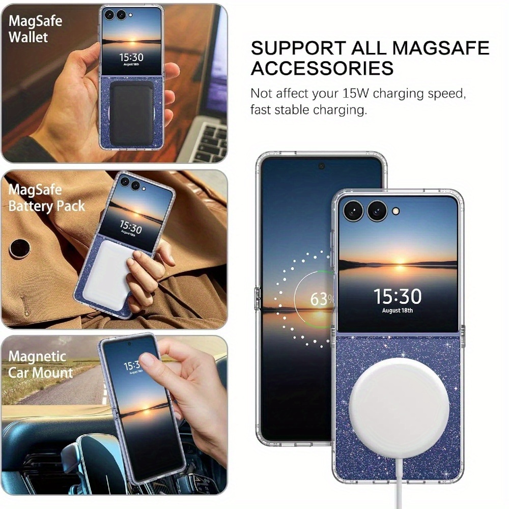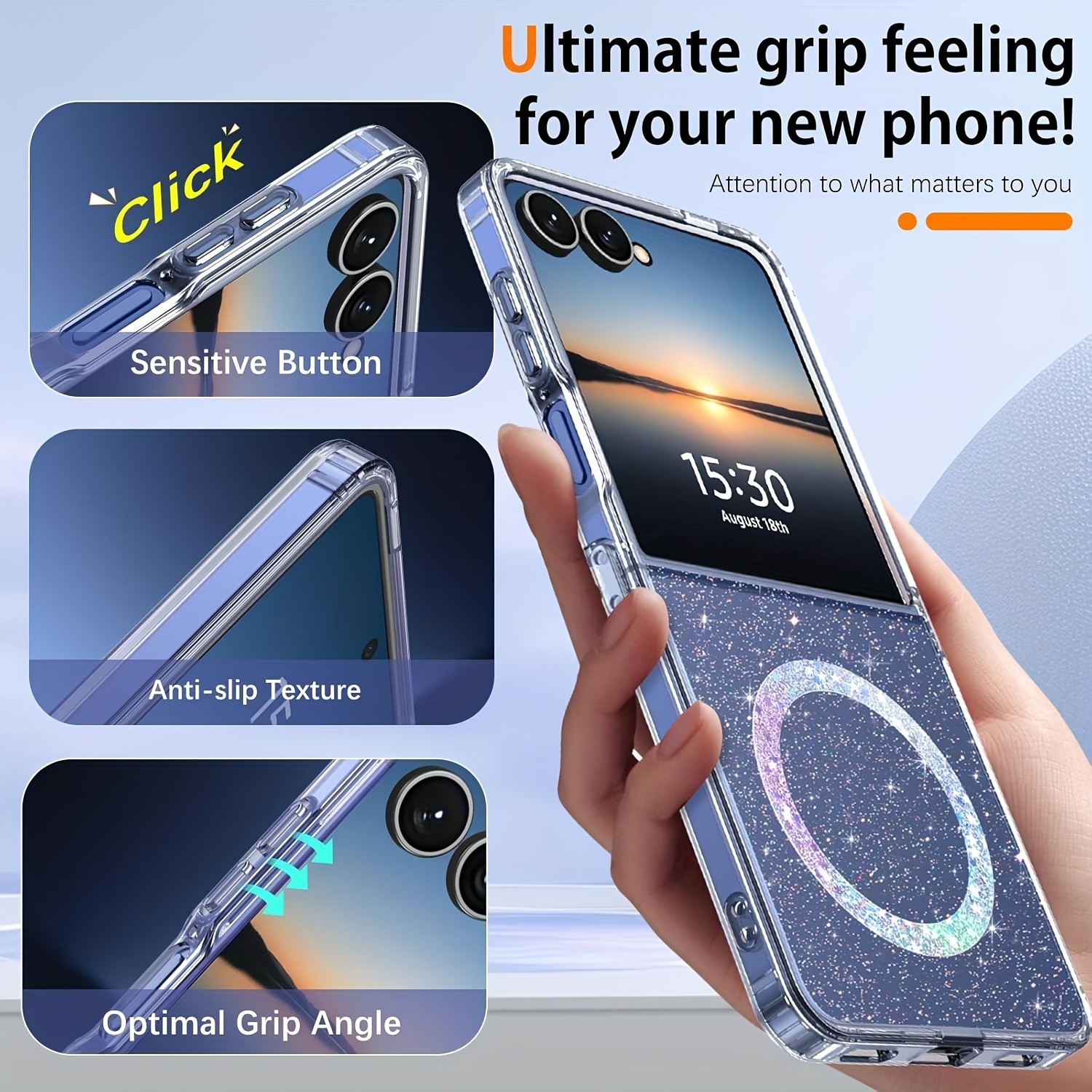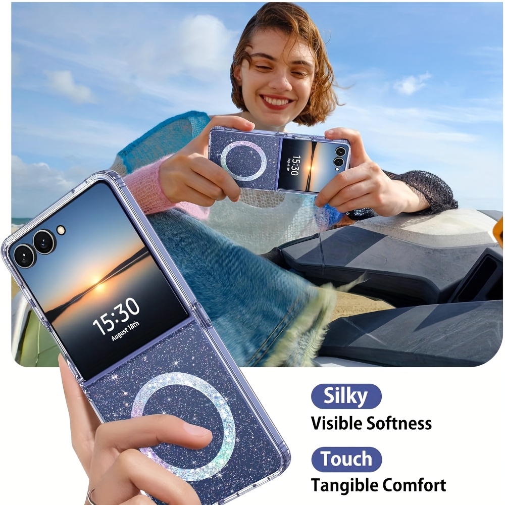“There is a certain ‘wow’ factor when the light hits the back of this case; it transforms your Z Flip7 from a piece of tech into a piece of jewelry. The glitter has this deep, multi-dimensional shimmer that really complements the phone’s metallic edges. But the real satisfaction comes from the functionality—there’s a reassuring ‘click’ when you snap it onto a magnetic charger, and you don’t have to worry about it sliding off. It feels smooth and sleek in your hand, providing just enough grip so the phone doesn’t feel slippery, but it’s still easy to slide into a small clutch or a jeans pocket. It’s that rare accessory that makes your phone look fragile and fashionable while actually making it feel much more secure.”