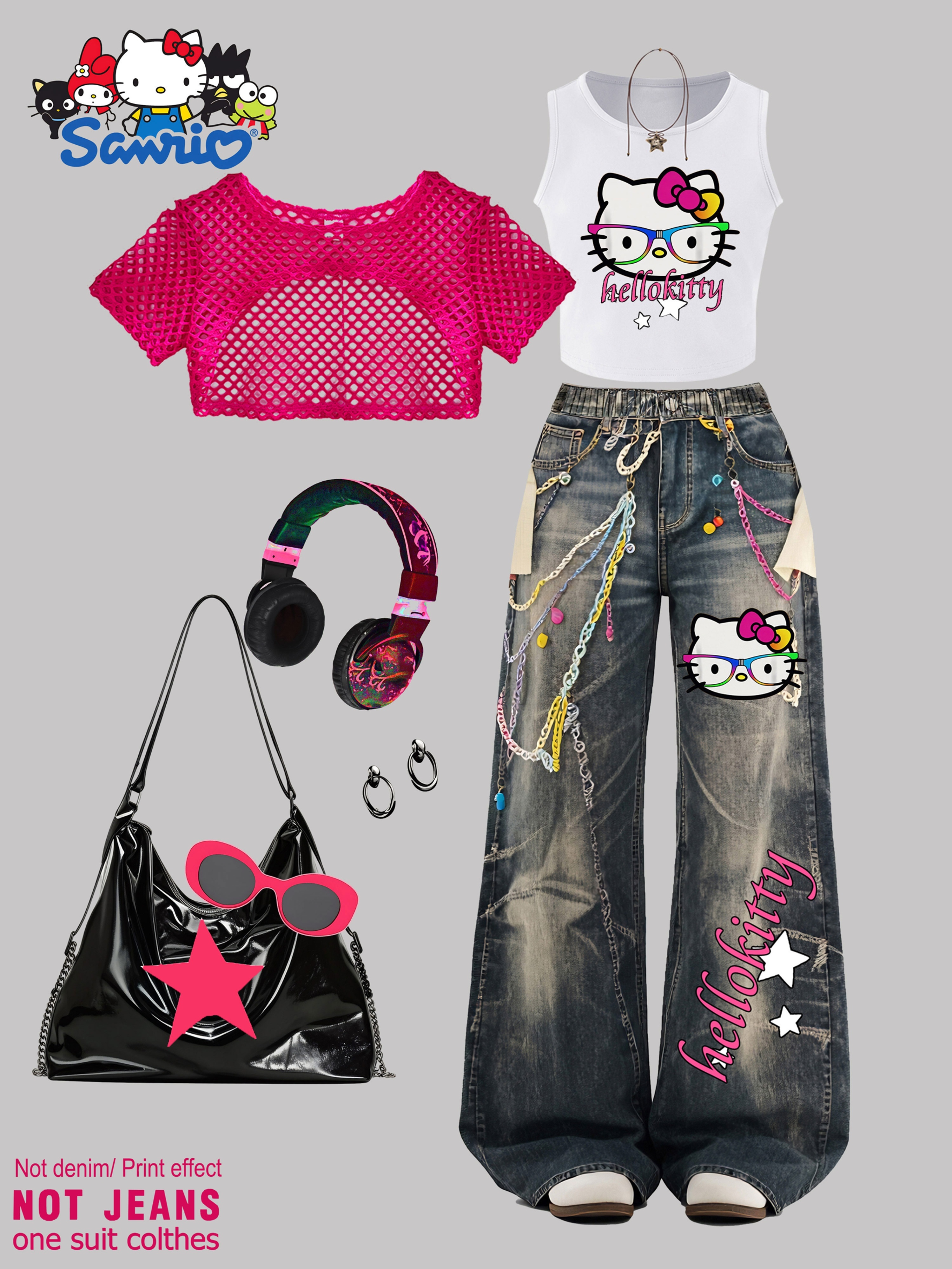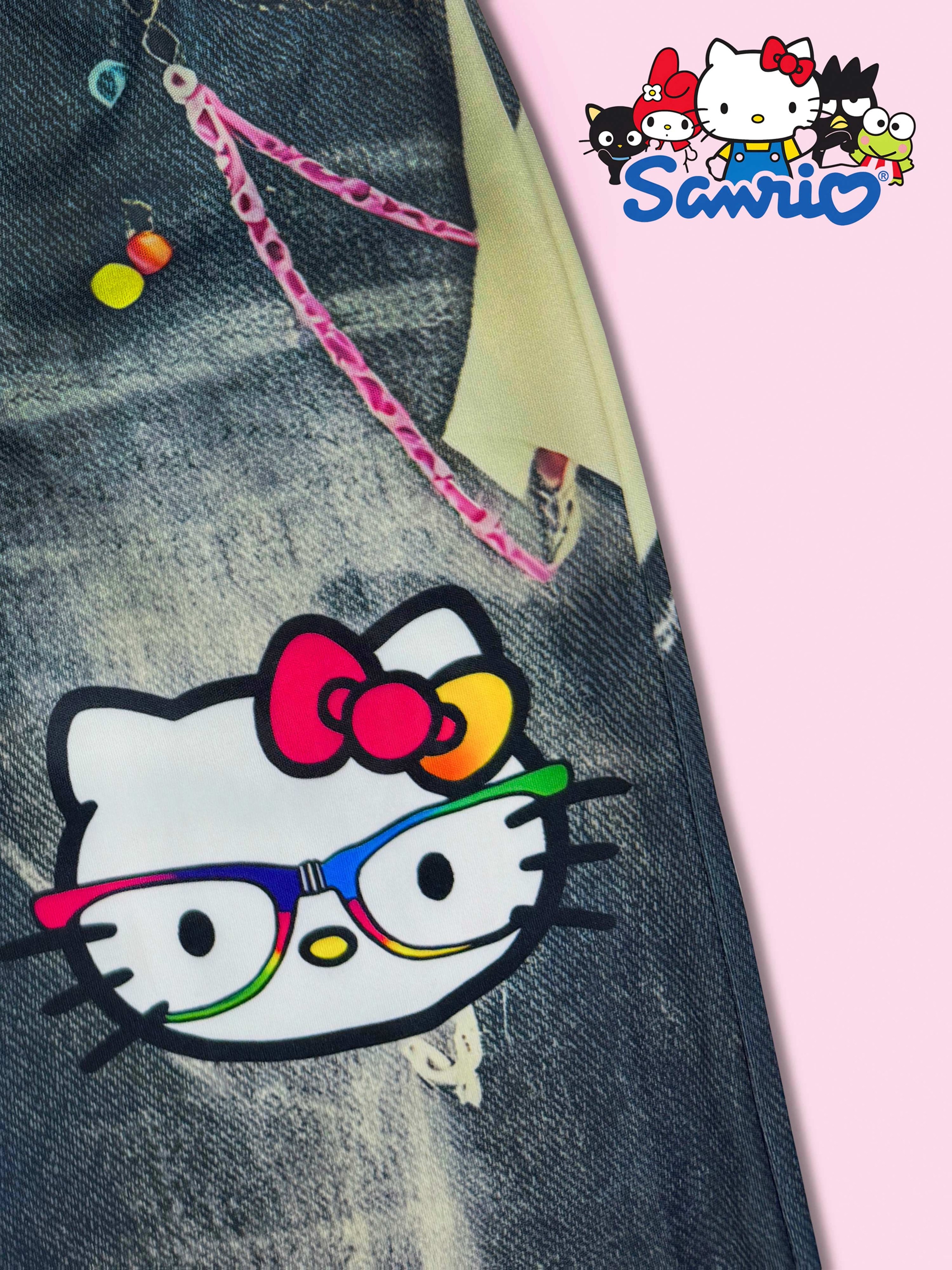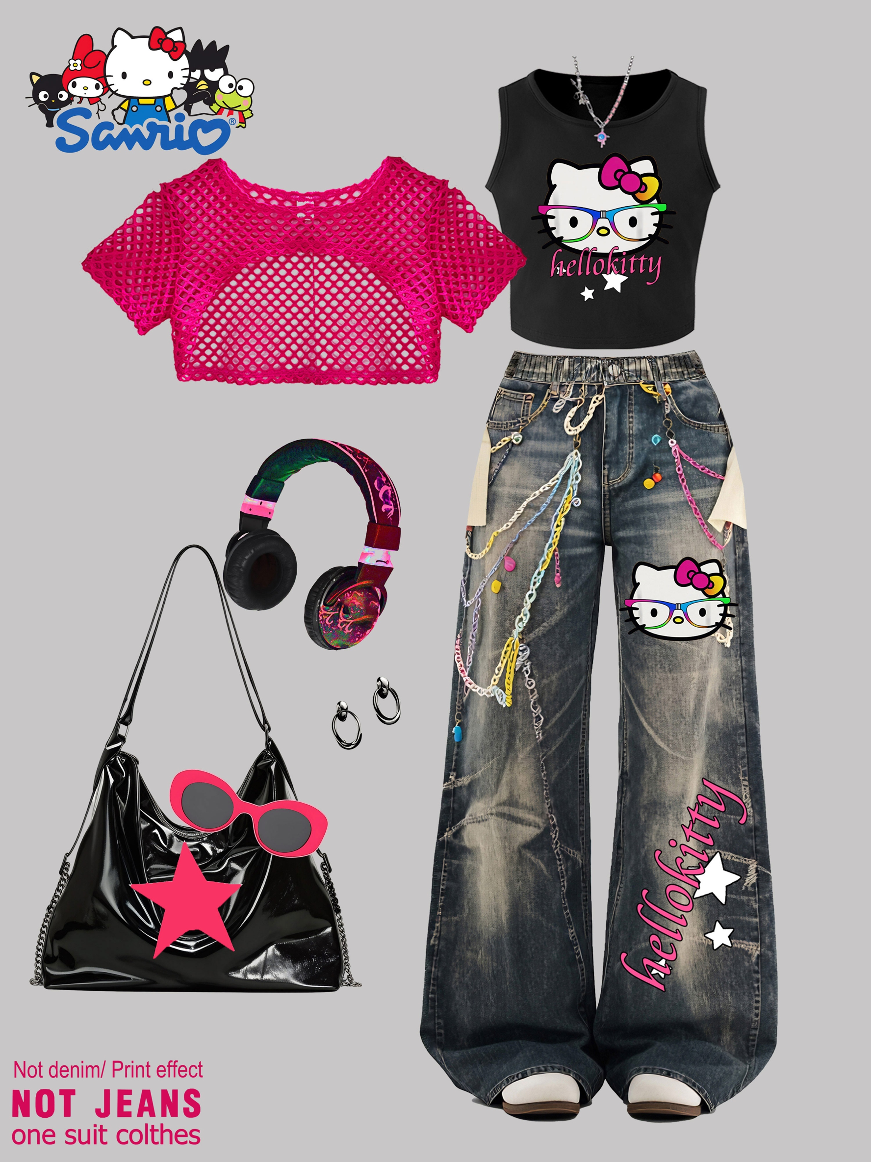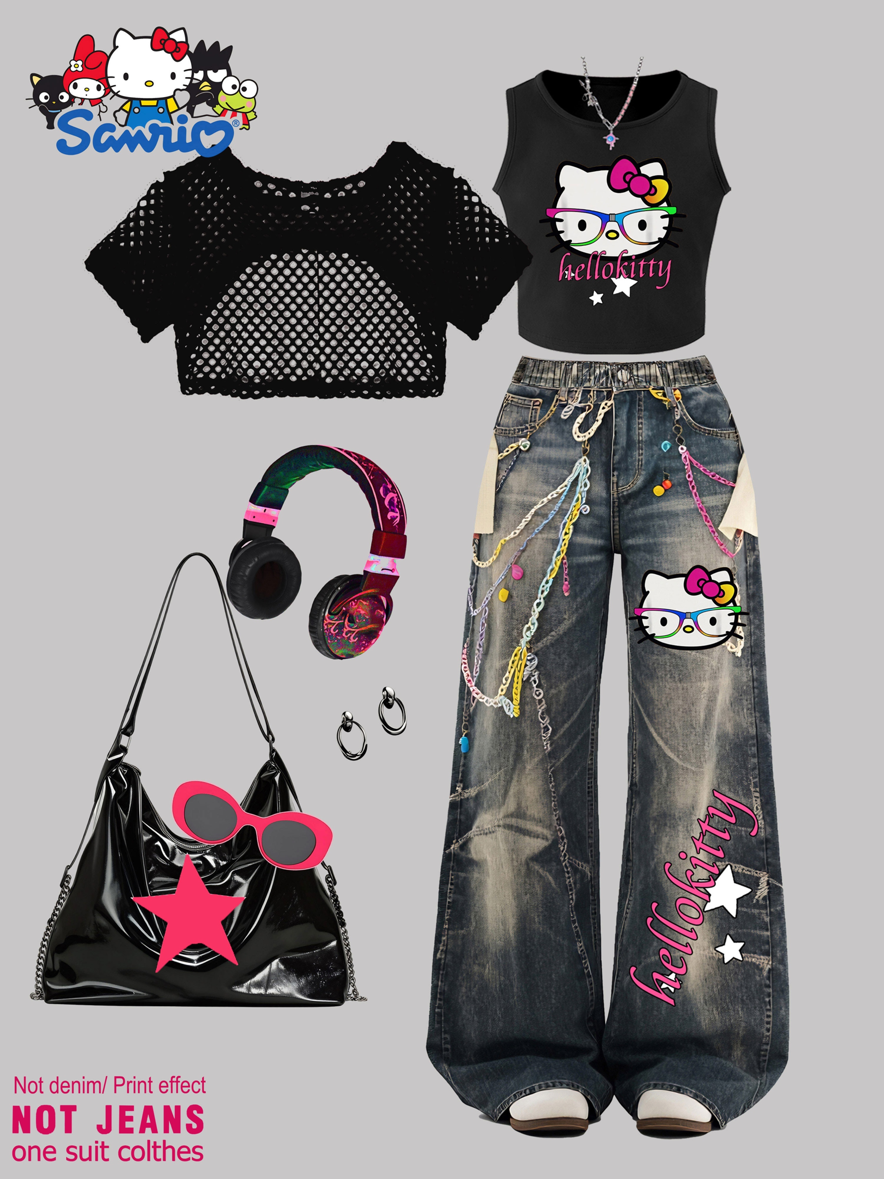 SANRIO 2026 Spring/Summer New Girls’ Vest + Mesh Pullover + Pants 3pcs Set Not Denim/Print Effect Hello Kitty Cute Cat with Glasses Pattern Girls’ Favorite Clothing Y2K Style Fashion Trend Soft and Comfortable Perfect Gift Choice Suitable for Outdoor