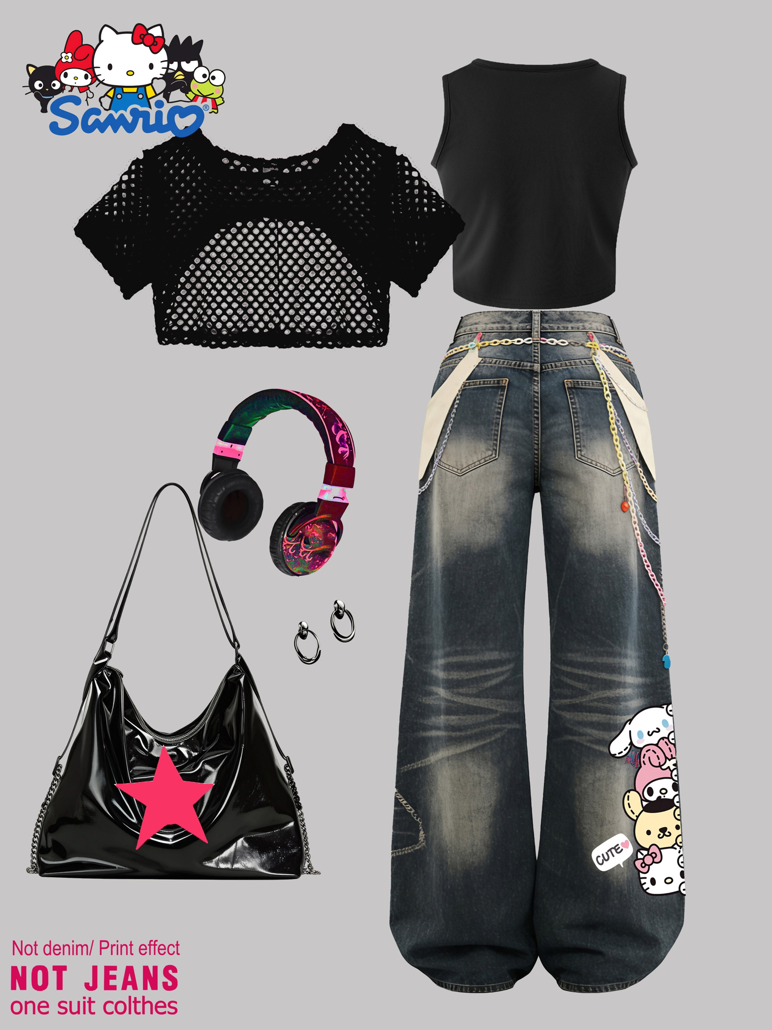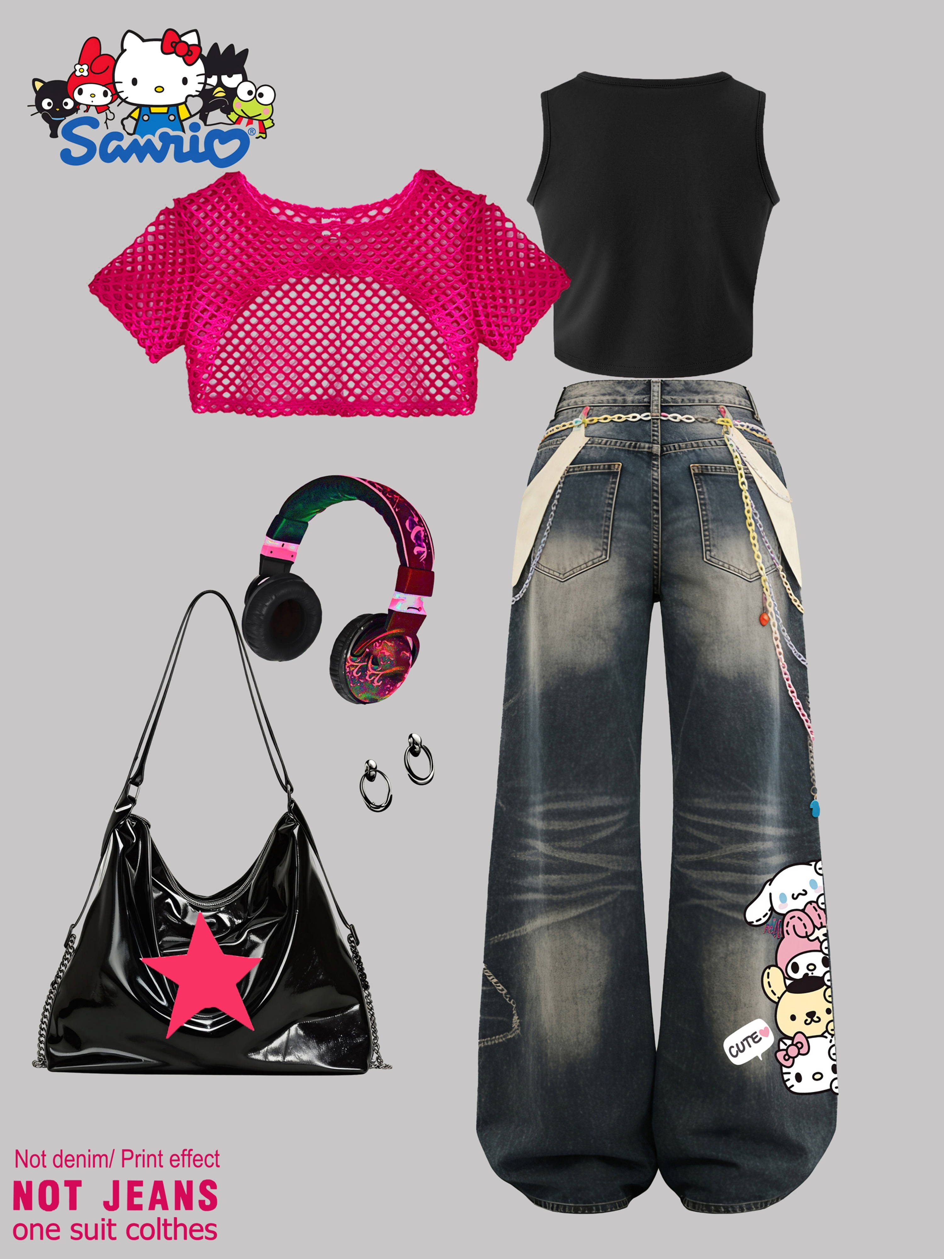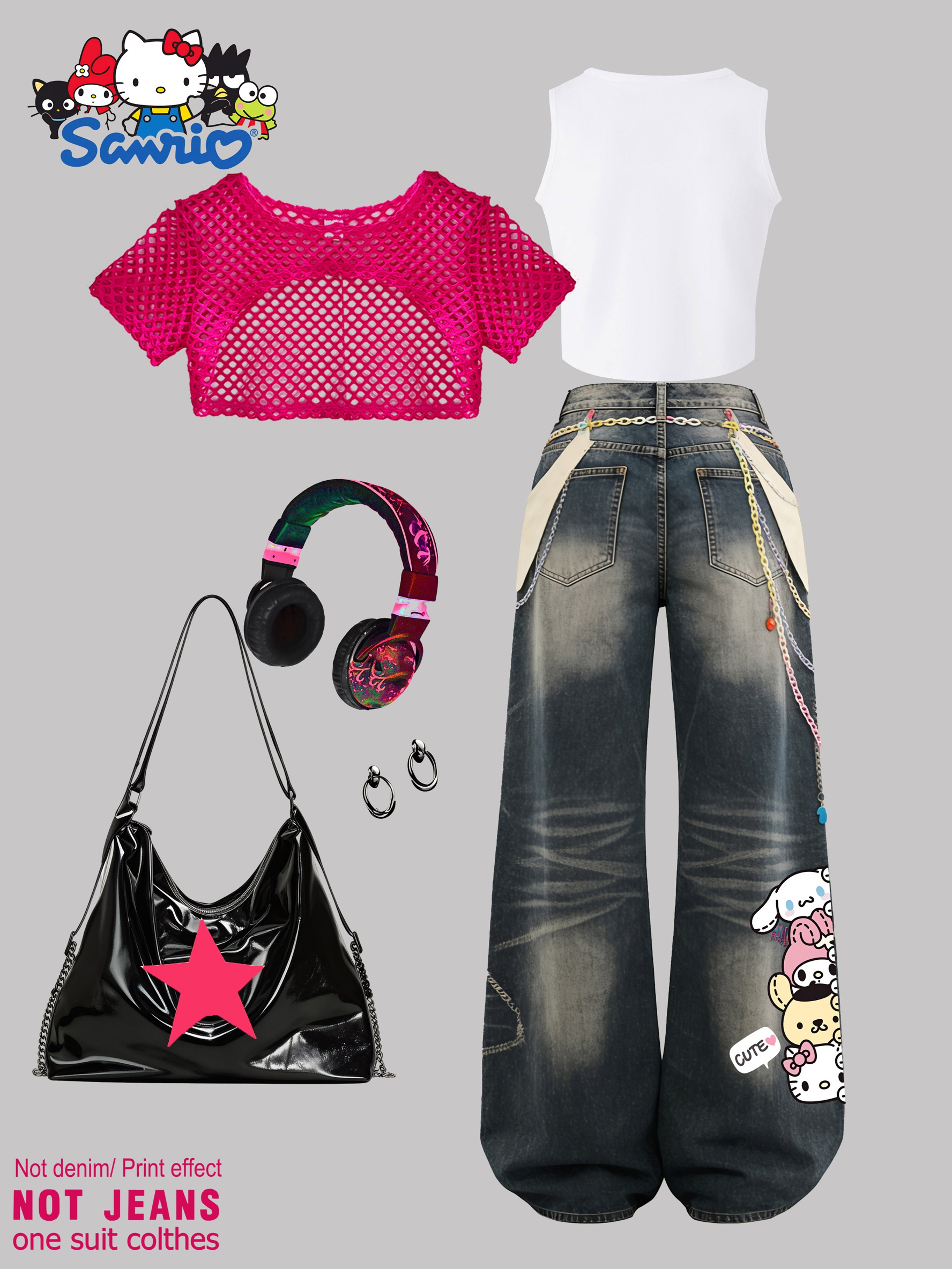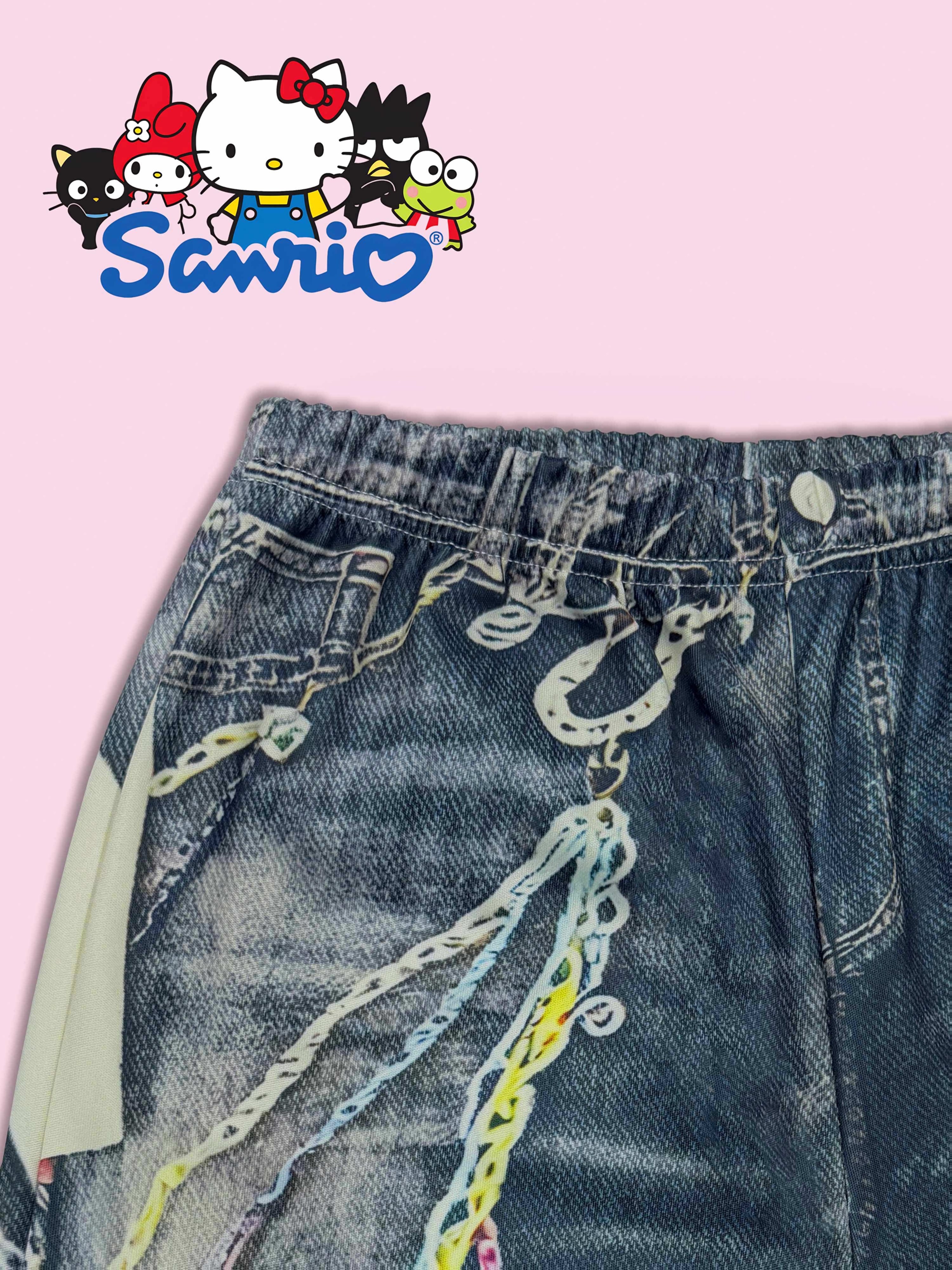SANRIO 2026 Spring/Summer New Girls’ Vest + Mesh Pullover + Pants 3pcs Set Not Denim/Print Effect Hello Kitty Cute Cat with Glasses Pattern Girls’ Favorite Clothing Y2K Style Fashion Trend Soft and Comfortable Perfect Gift Choice Suitable for Outdoor
