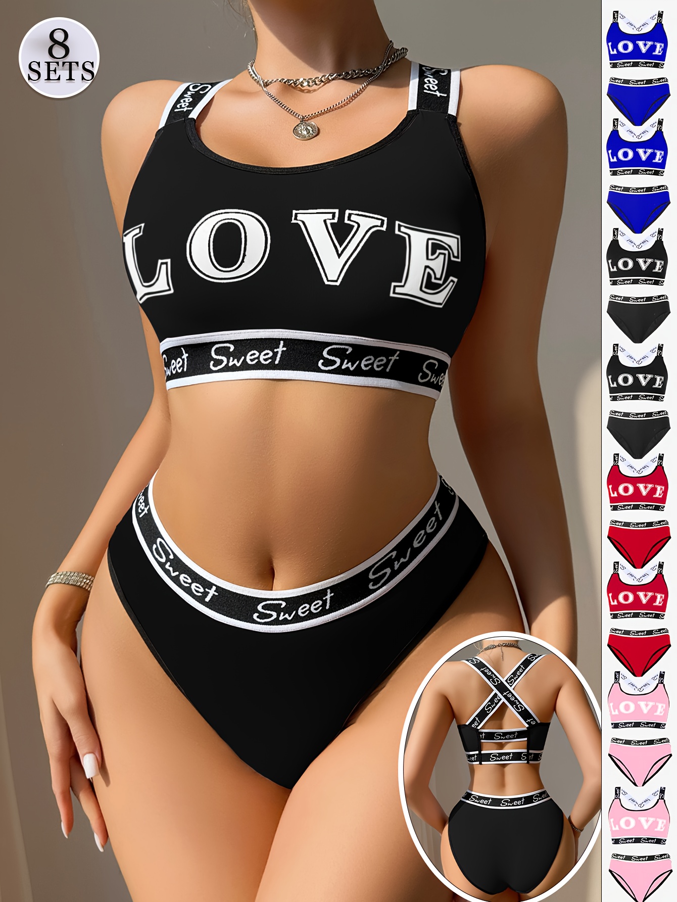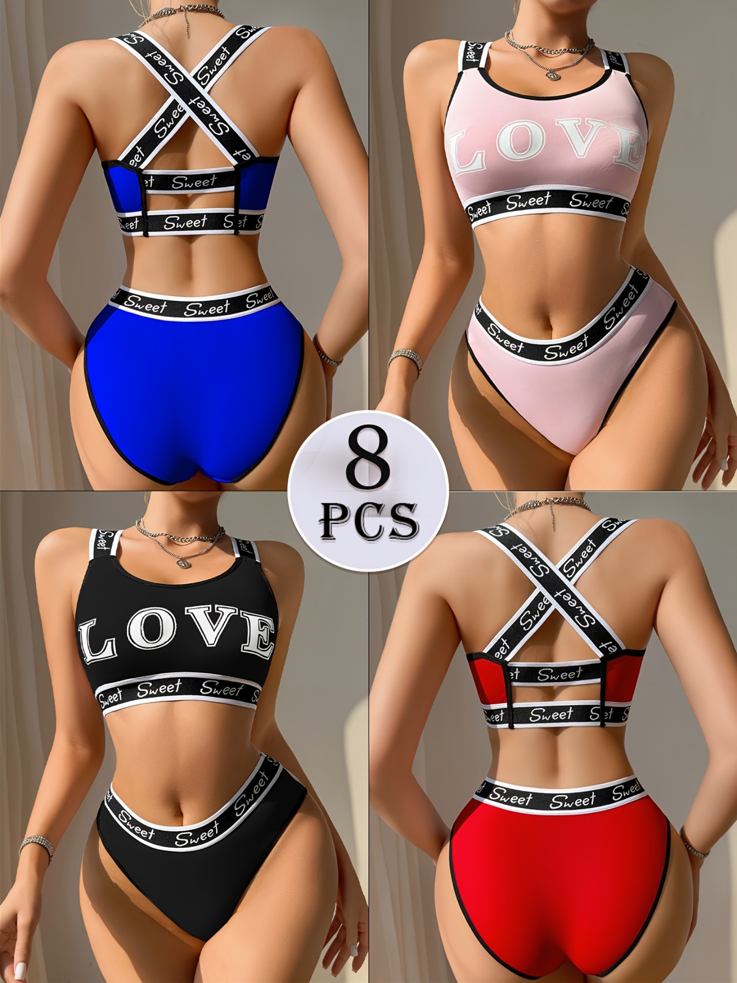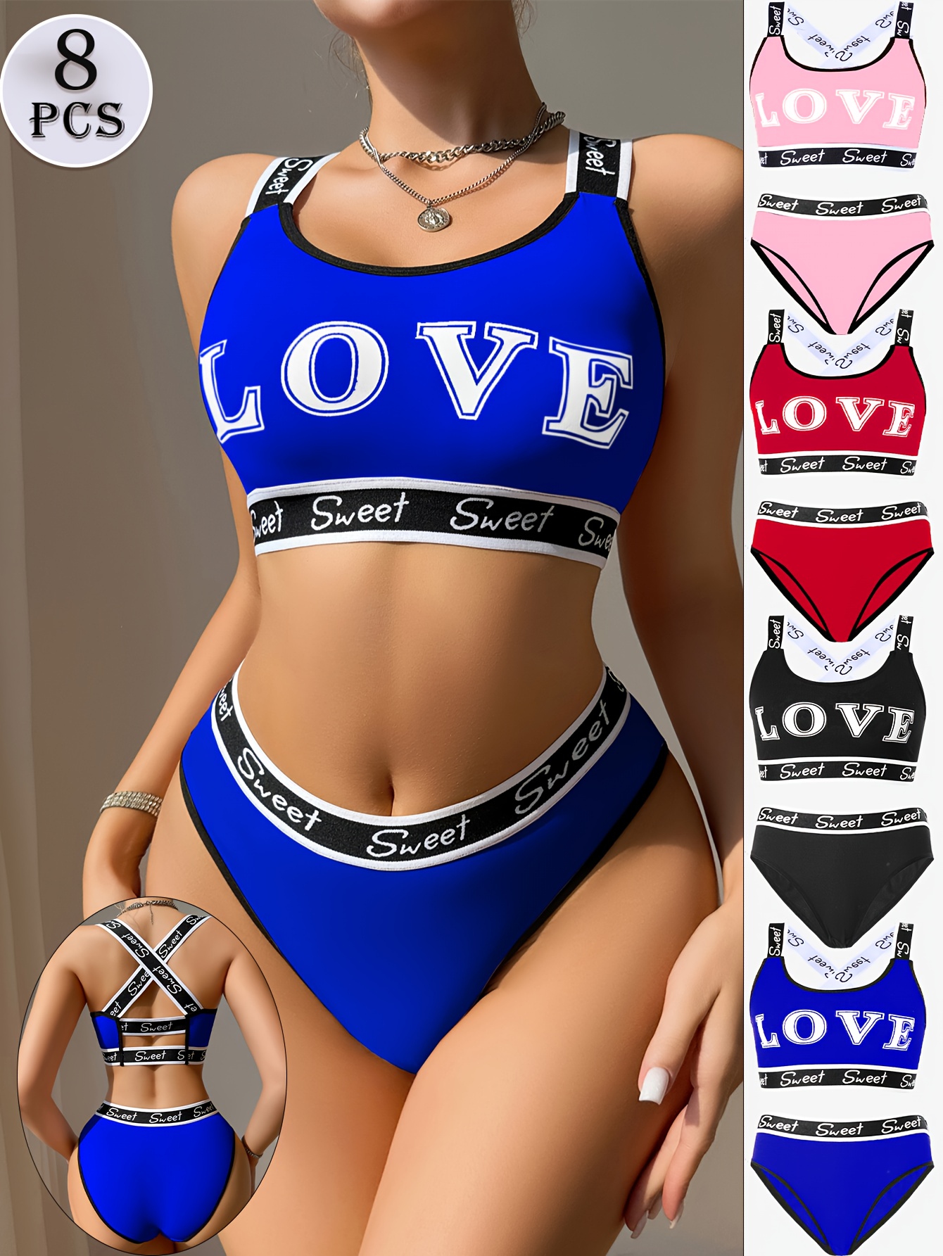 [Sexy Bra Set] 8pcs Women’s Sexy Bra Set | Cross-Back Push-Up Bra with Low-Rise Thong, Comfortable Soft Breathable, Contrast Straps, Quick-Dry Underwear Set