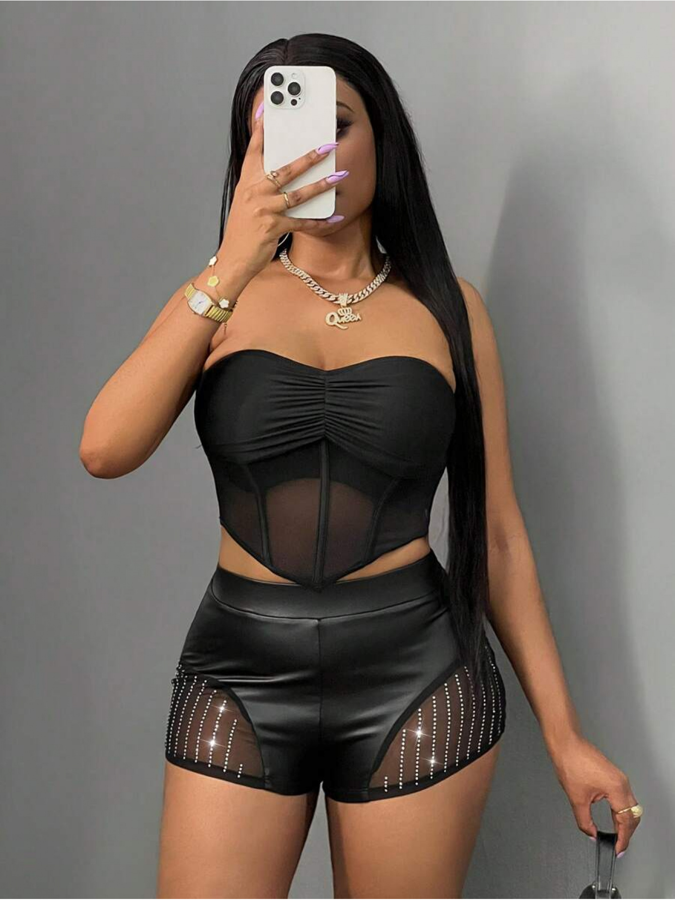 Key Attributes: Heat-Bonded Rhinestones, PU & Mesh Patchwork, Ultra-Short “Micro” Length, Breathable Side Panels.
