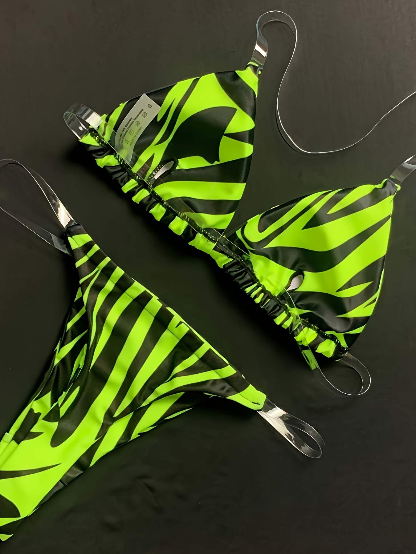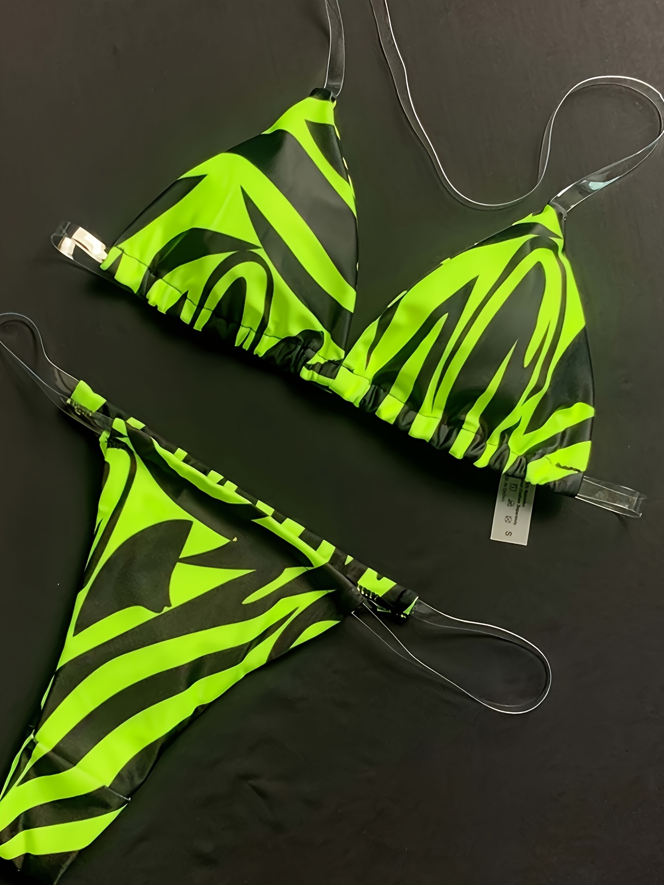 Sexy Transparent Strap Swimsuit Mini Striped Print Two-Piece Bikini Set for Women – High Stretch, Sleeveless, Lace-Up Detail, Beach & Poolwear, Beachwear Essentials|Sexy Swimsuit|Stretchy Fabric