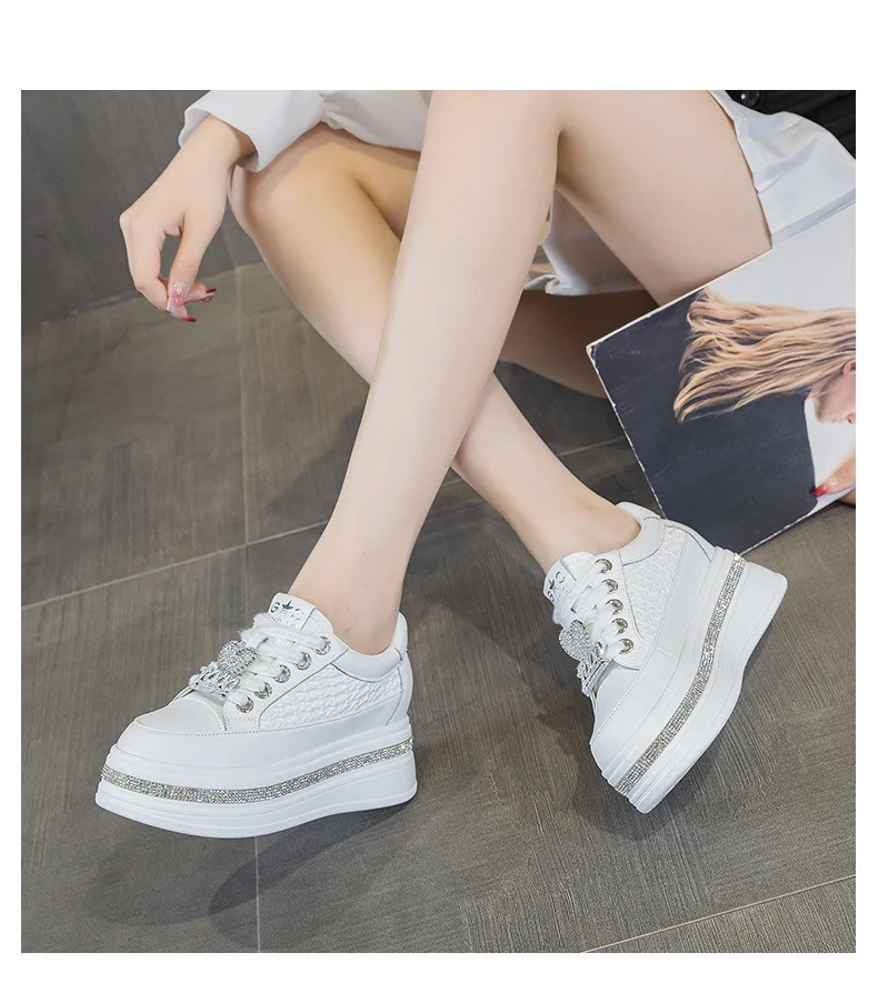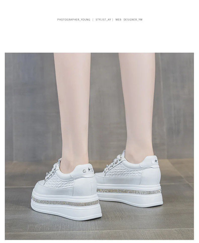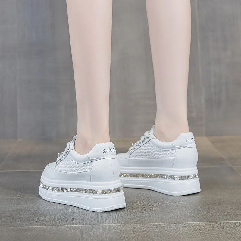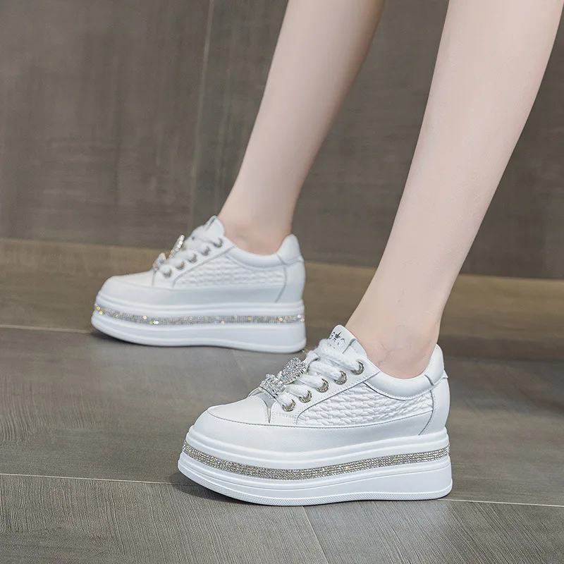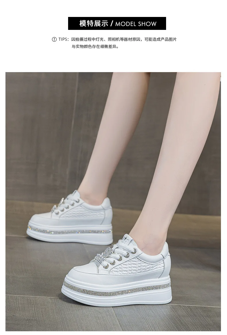 Spring Genuine Leather Diamond Embellished 7cm Heel Women’s Sneakers Sporty Casual Thick Bottomed Shoes for Short People