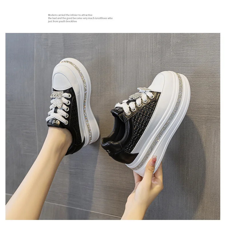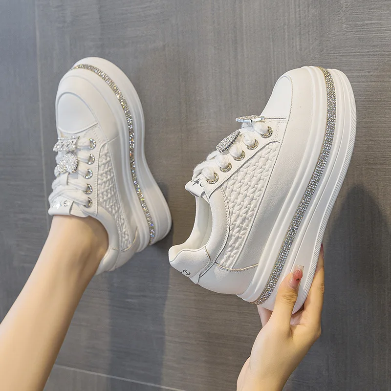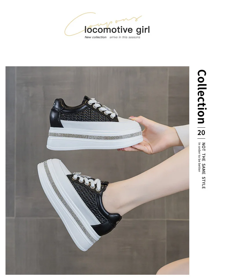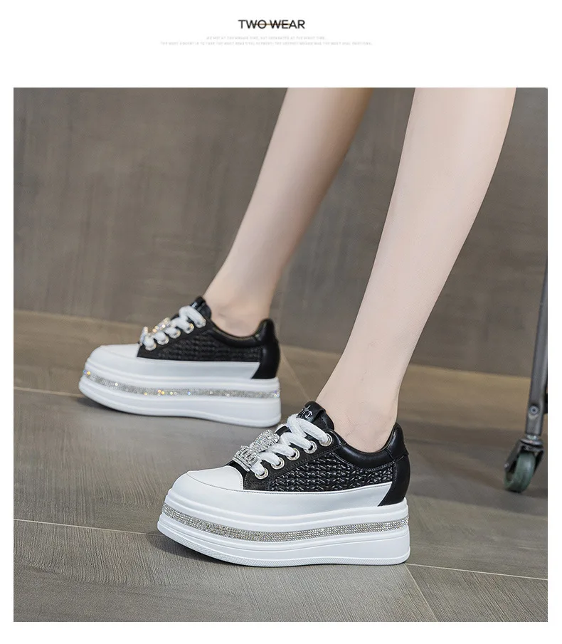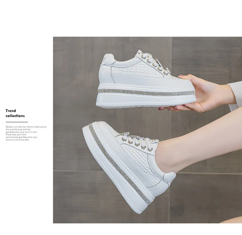 Spring Genuine Leather Diamond Embellished 7cm Heel Women’s Sneakers Sporty Casual Thick Bottomed Shoes for Short People