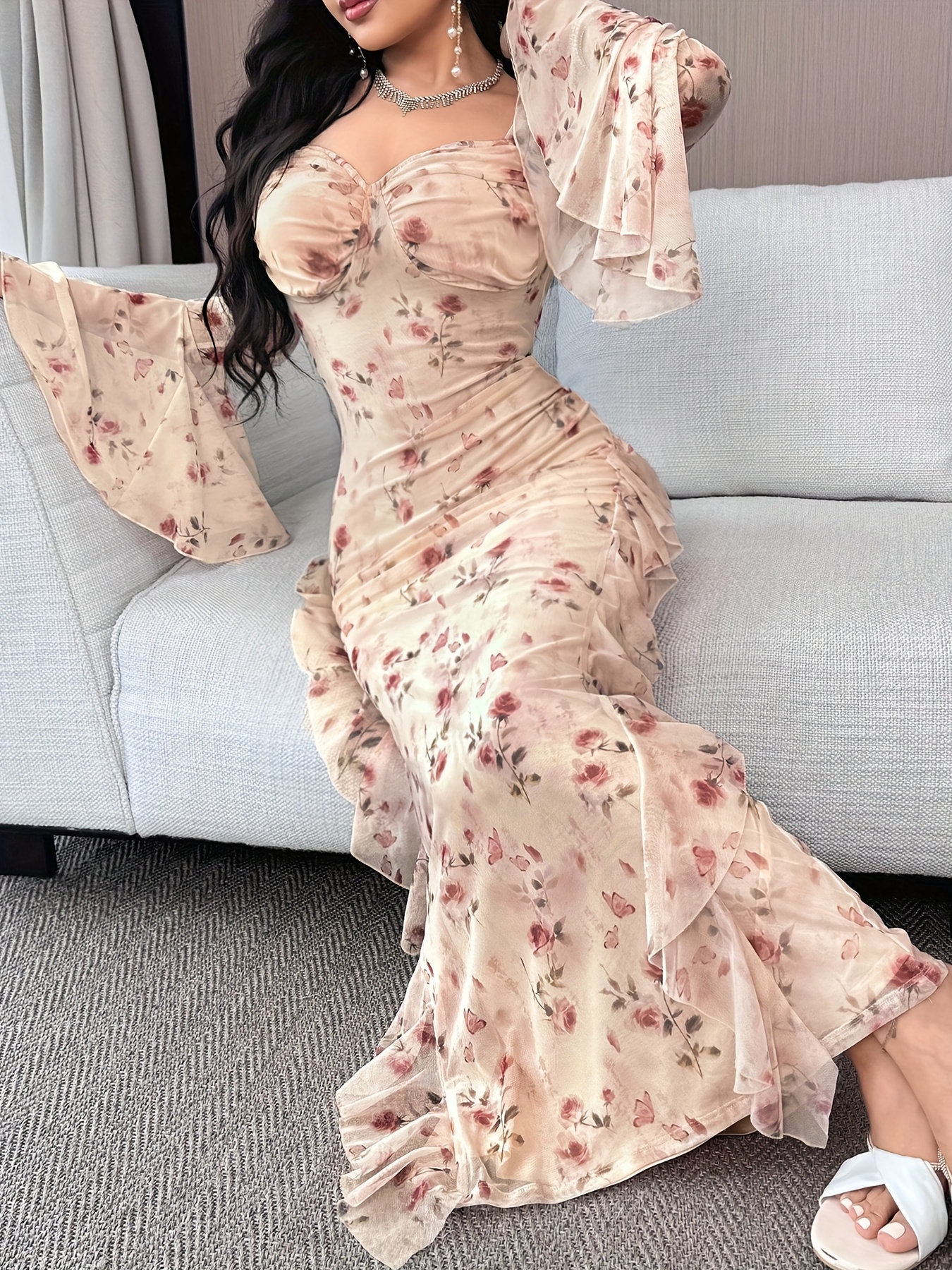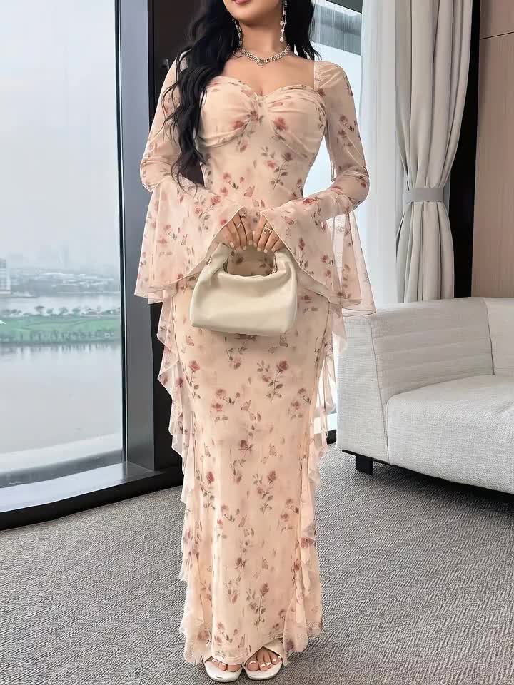 Spring/Summer Women’s Lace Dress, Romantic Floral Ruffle Hem, Wedding Date Square Neckline Nude Pink Lace Long Dress WJ485