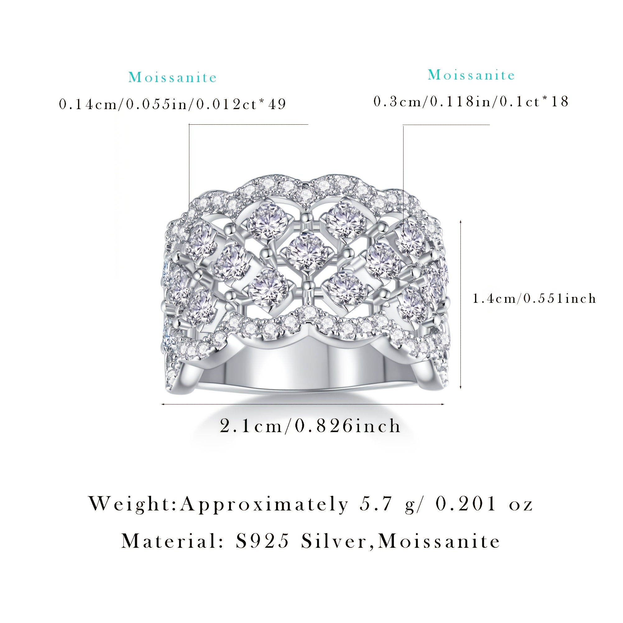 18-Stone Moissanite Array: Features 18 individual 0.1-carat Moissanite stones, totaling 1.8 carats of diamond-identical brilliance.