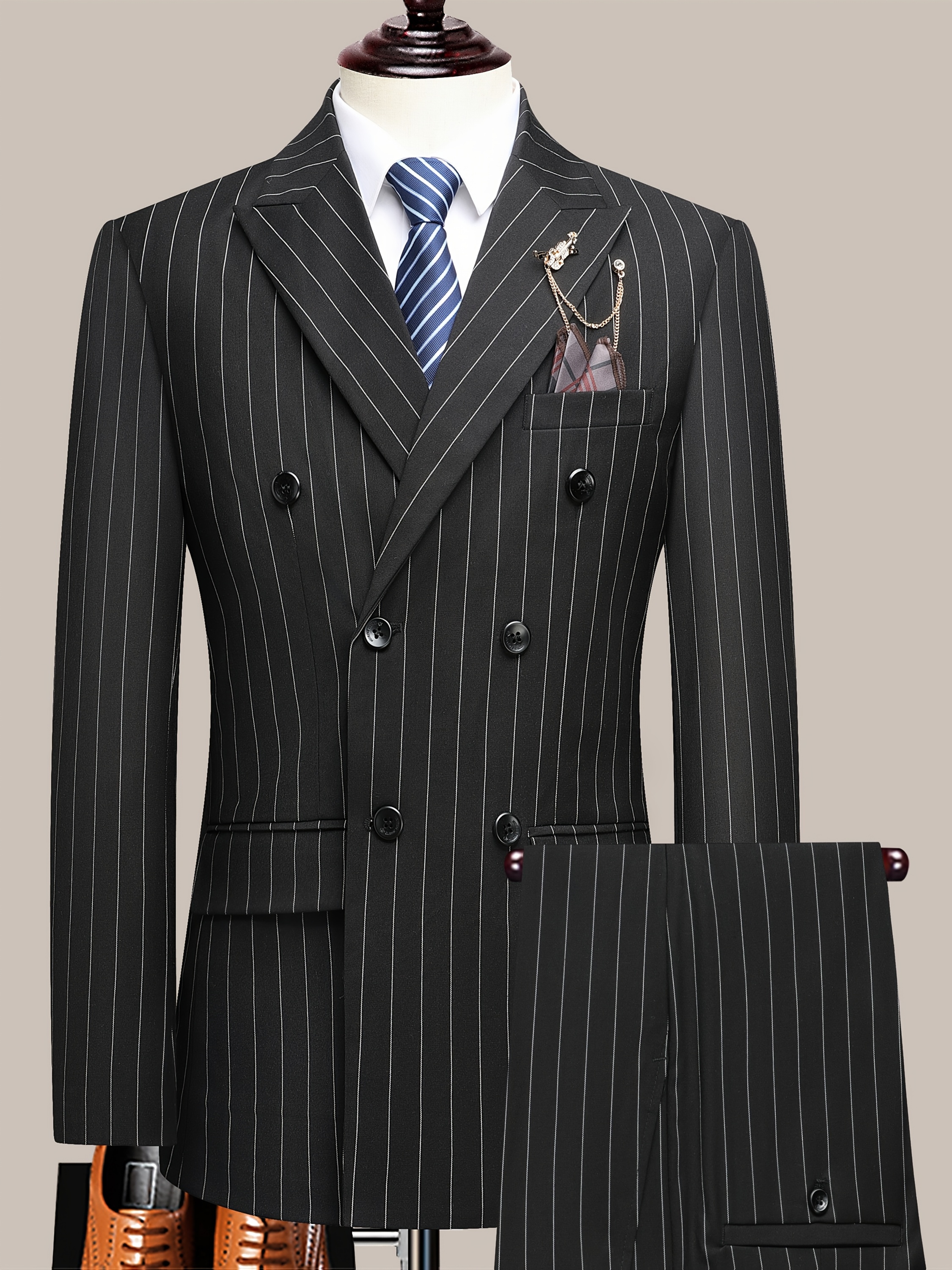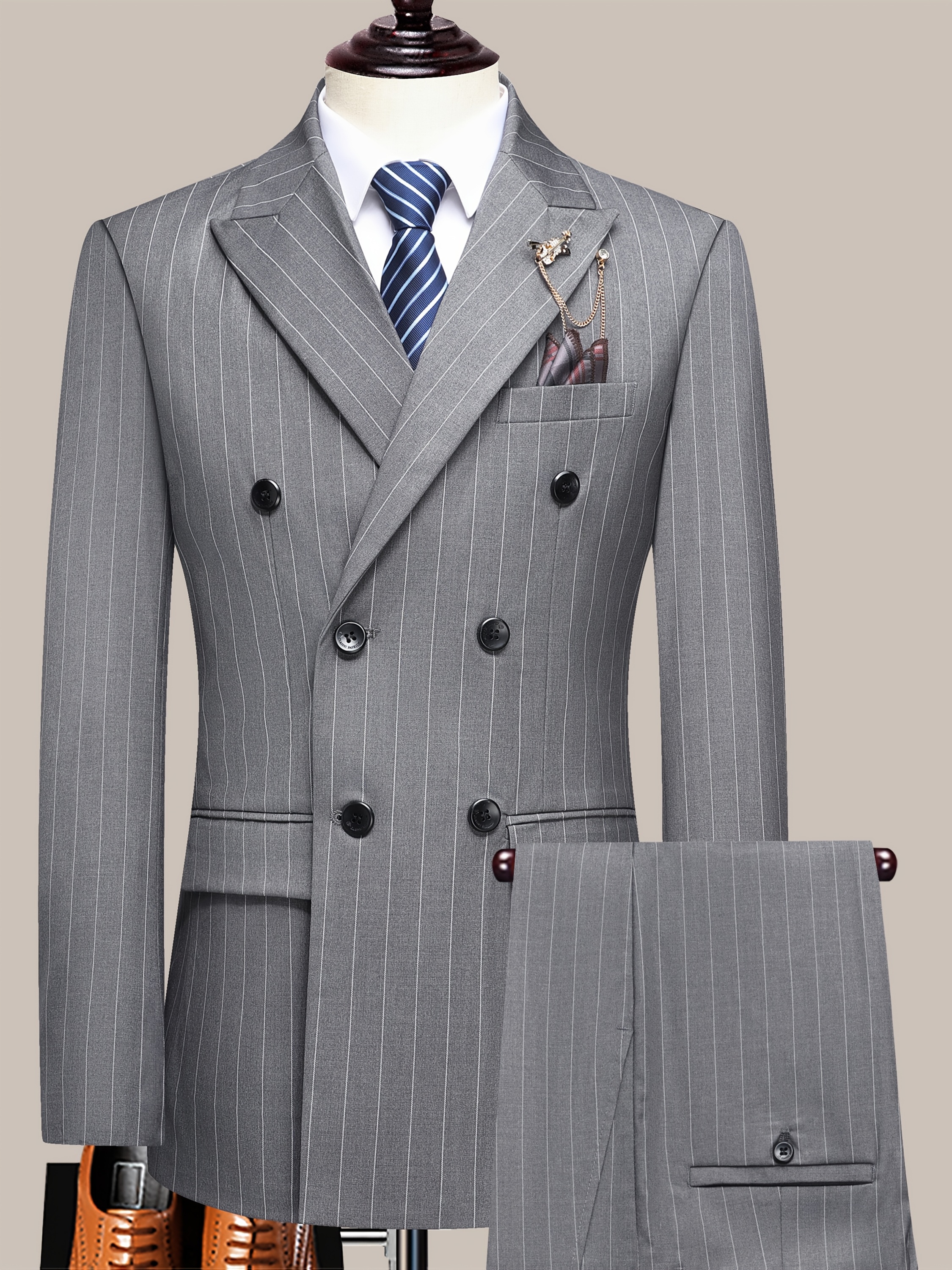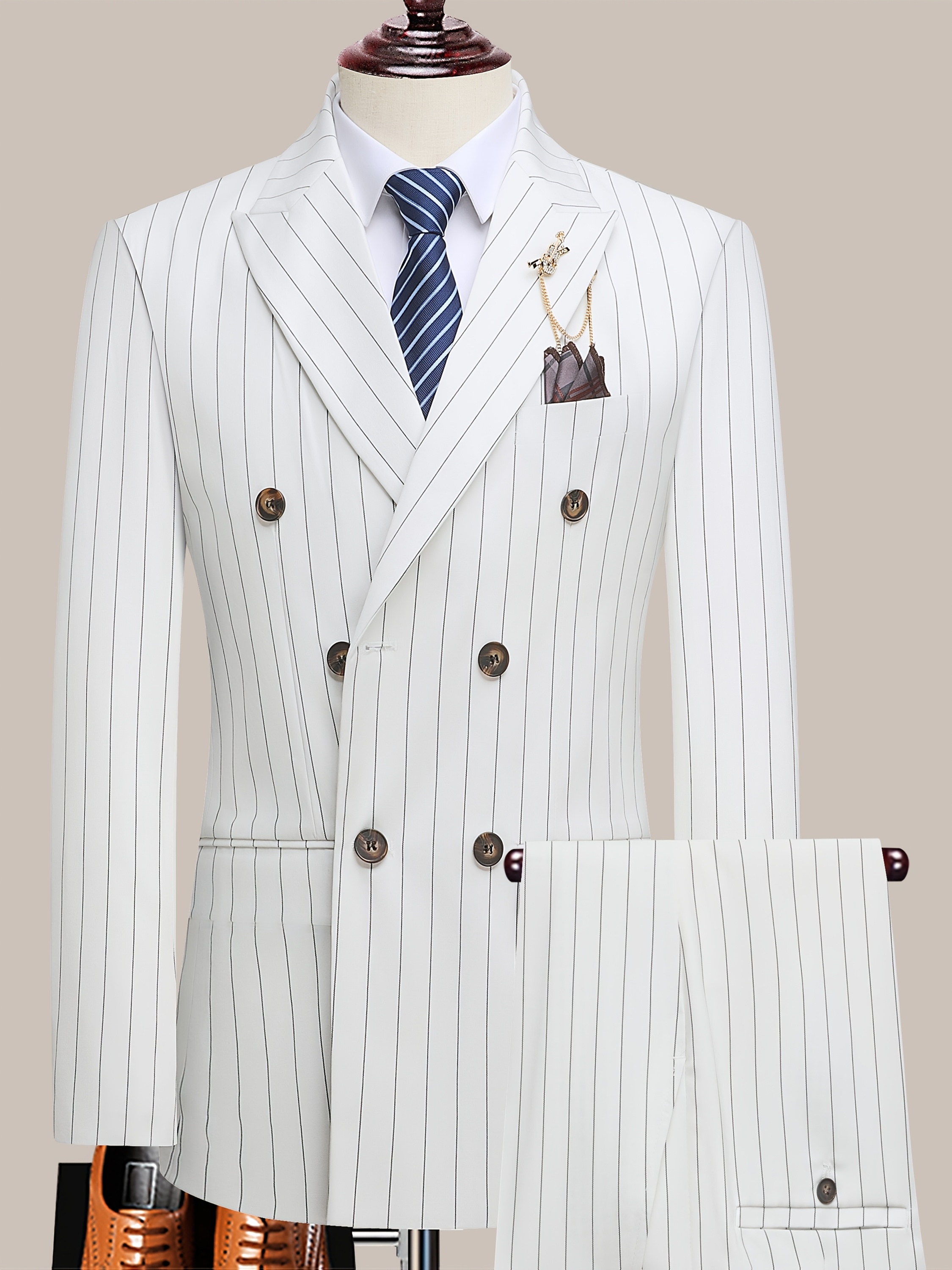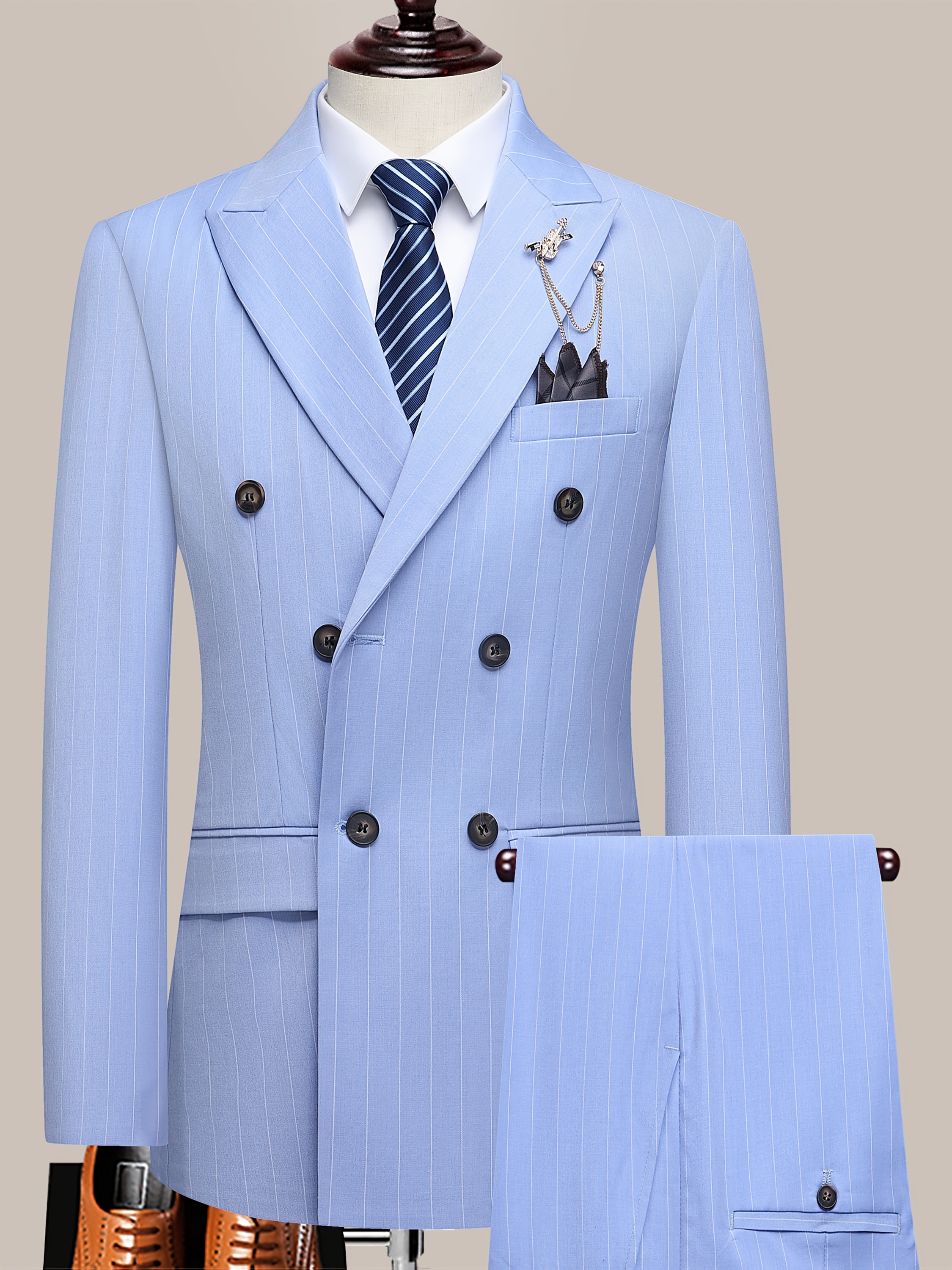 The Latest Men’S Striped Double-Breasted Suit, a Lightweight Two-Piece Set for Spring, Summer, And Autumn, Features a Shawl Collar And Four-Button Design, Suitable for Business Casual Occasions, with a Decorative Necklace at The Neckline